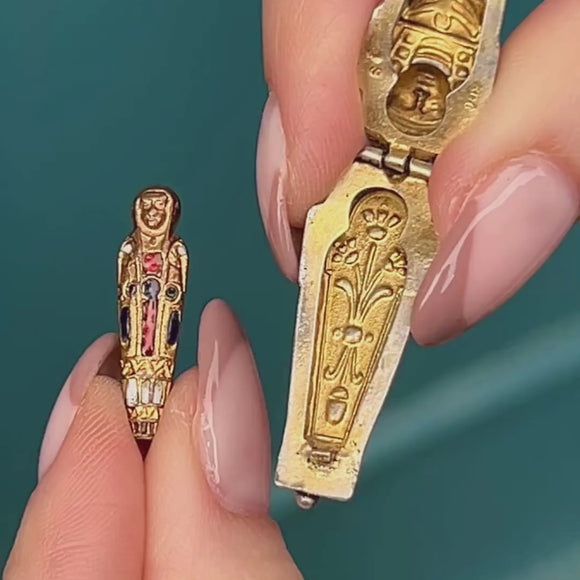 The Egyptian sarcophagus has a gorgeous Enamel exterior, and inside you will find the original mummy! This is a quirky piece that will add a unique flare to your jewellery collection.