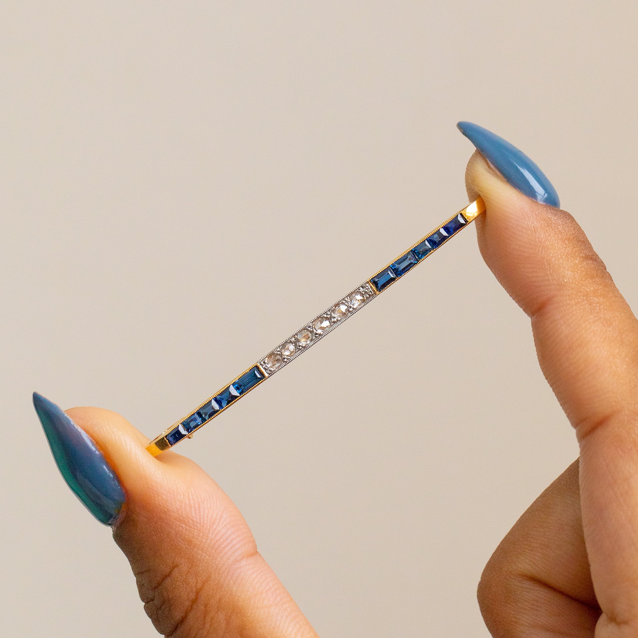 This sparkling Art Deco French 18ct Gold Sapphire Diamond bar brooch exudes elegance and sophistication! Gleaming Sapphires with a combined weight of 4.65ct, each meticulously set, punctuate the piece with vibrant blue hues, while the 0.18cts of rose-cut Diamonds add a touch of glamour and sparkle.