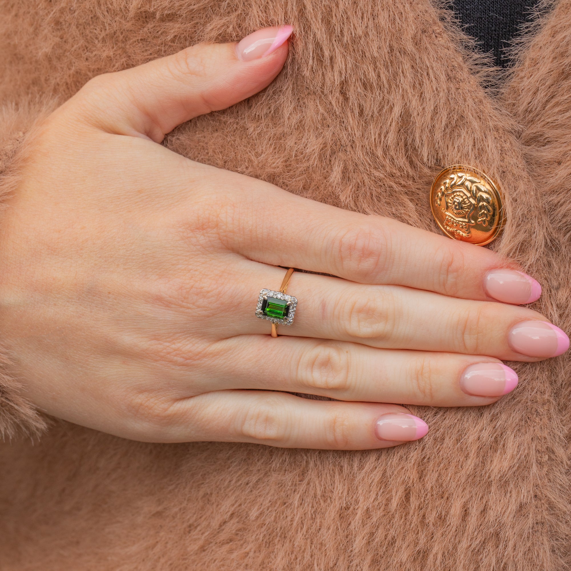 Expertly handcrafted, this square Tourmaline and Diamond cluster ring perfectly captures the essence of the Art Deco era. The bright saturated 18ct Gold band brings everything together to create a lovely, unique piece of vintage jewellery.