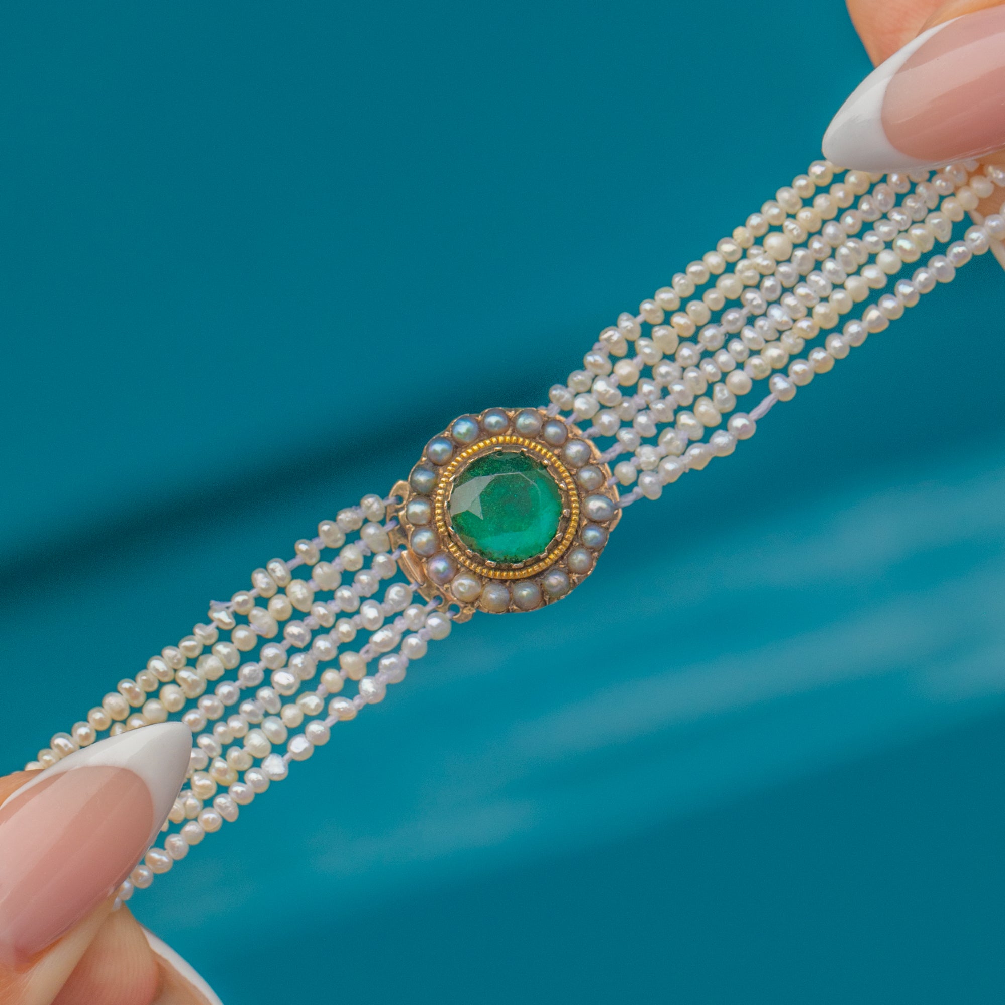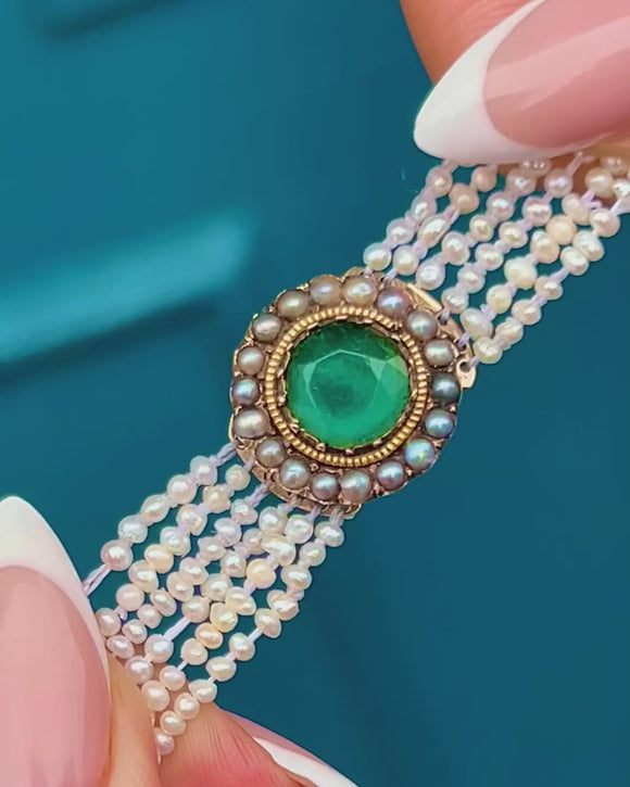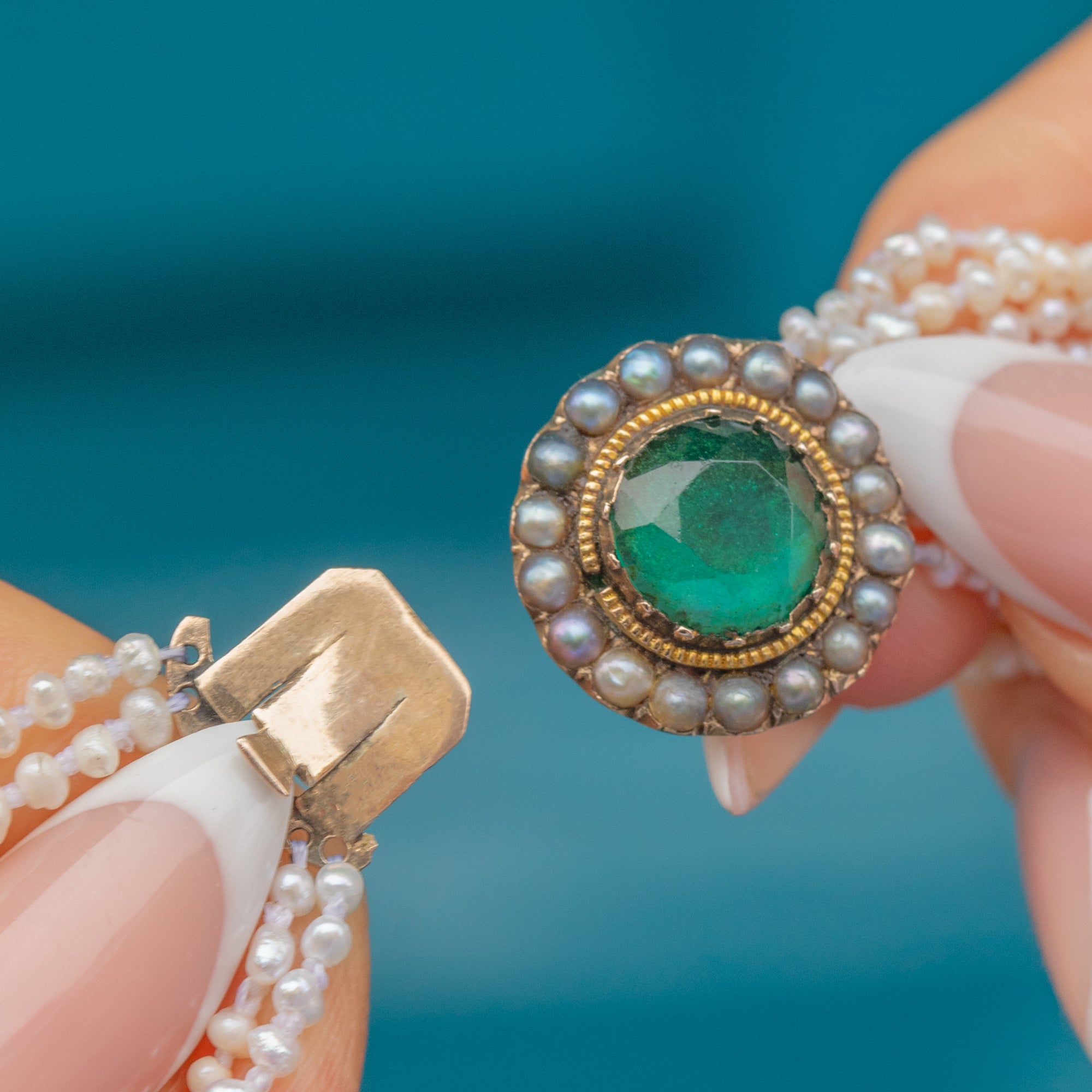 EXCELLENT: Pearls are well-matched with soft lustre, and the green Paste stone is bright and secure. The clasp is strong, and all strands remain intact with no repairs.