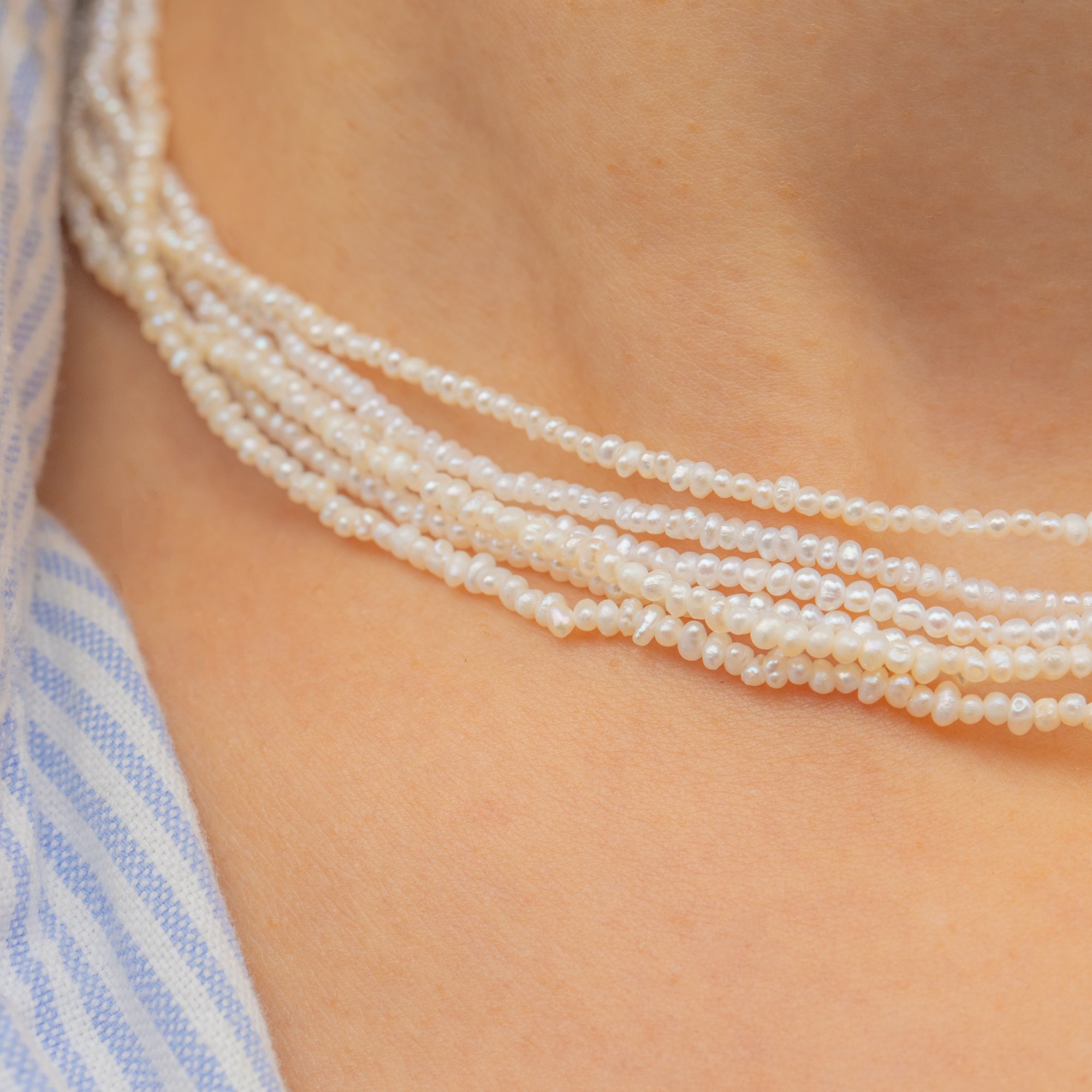 An elegant Art Deco necklace composed of multiple strands of fine Pearls, fastening with a decorative clasp set with a round green Paste stone framed by Pearls.