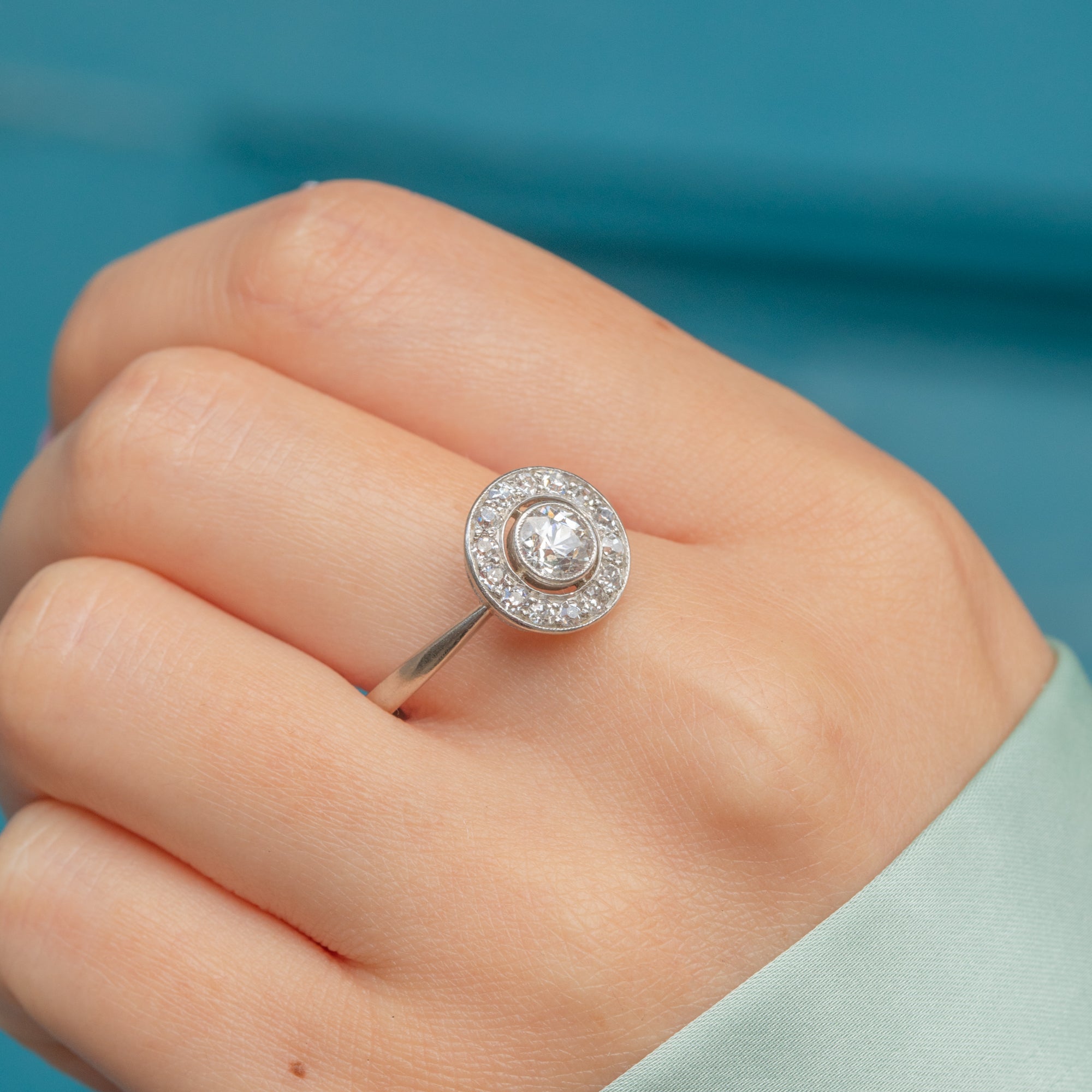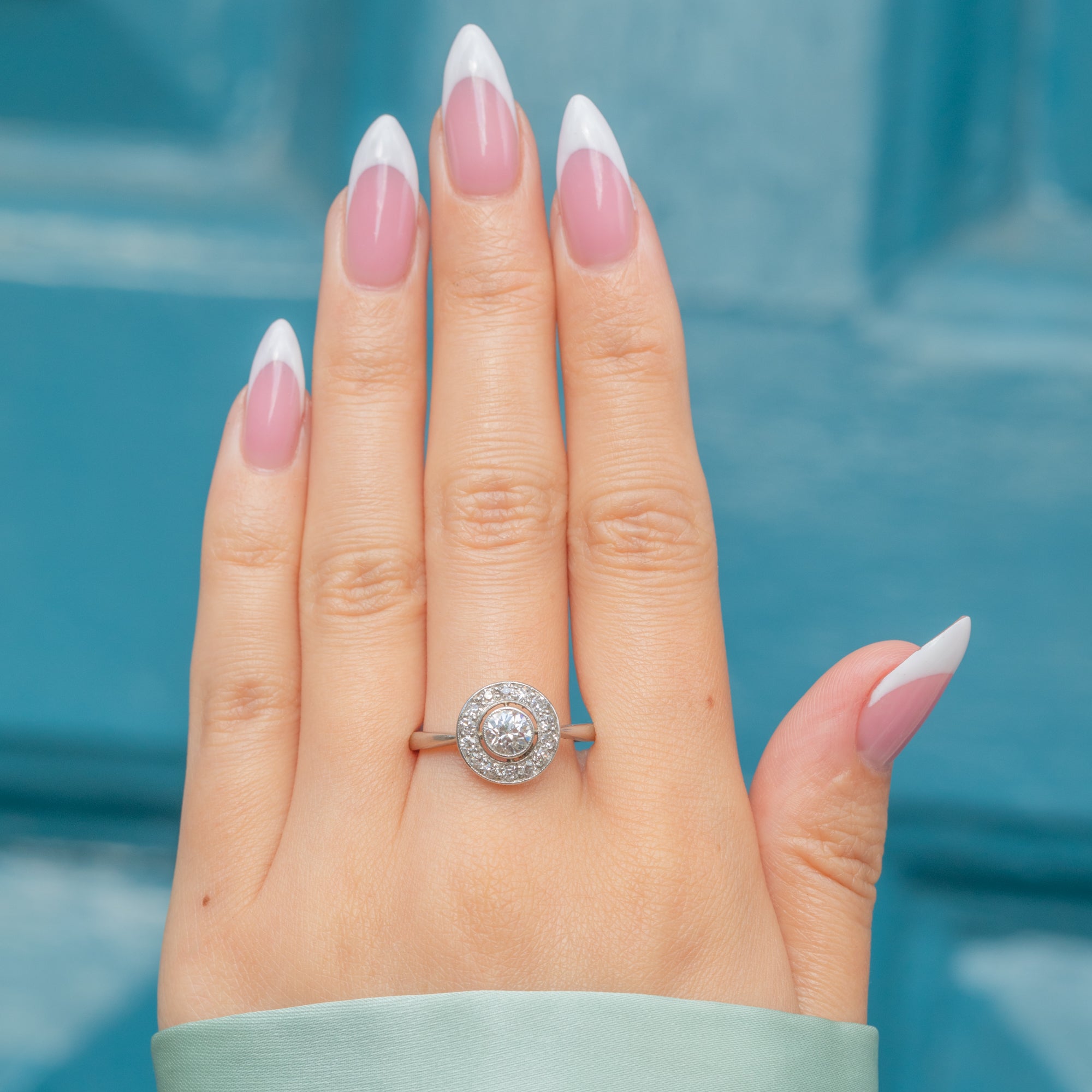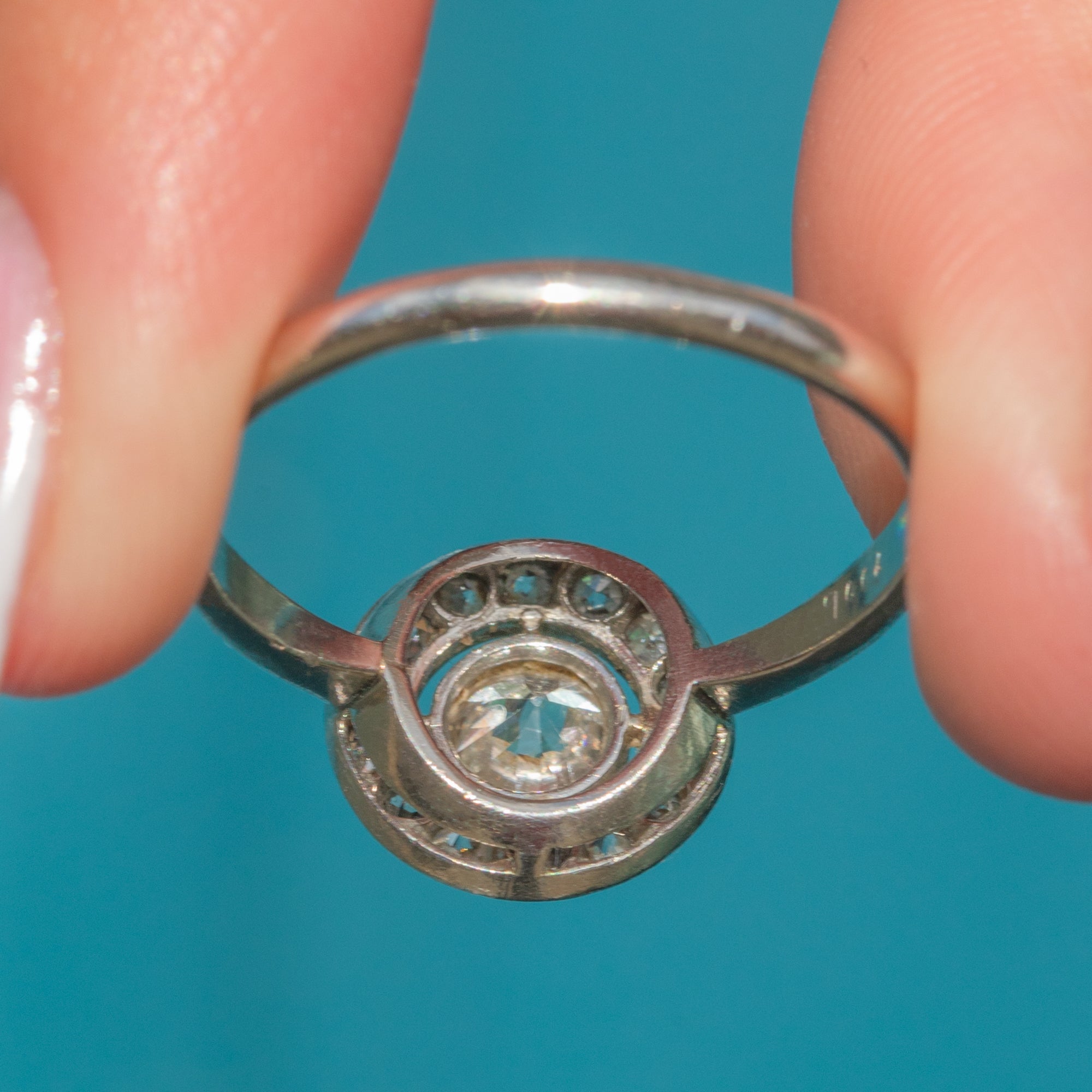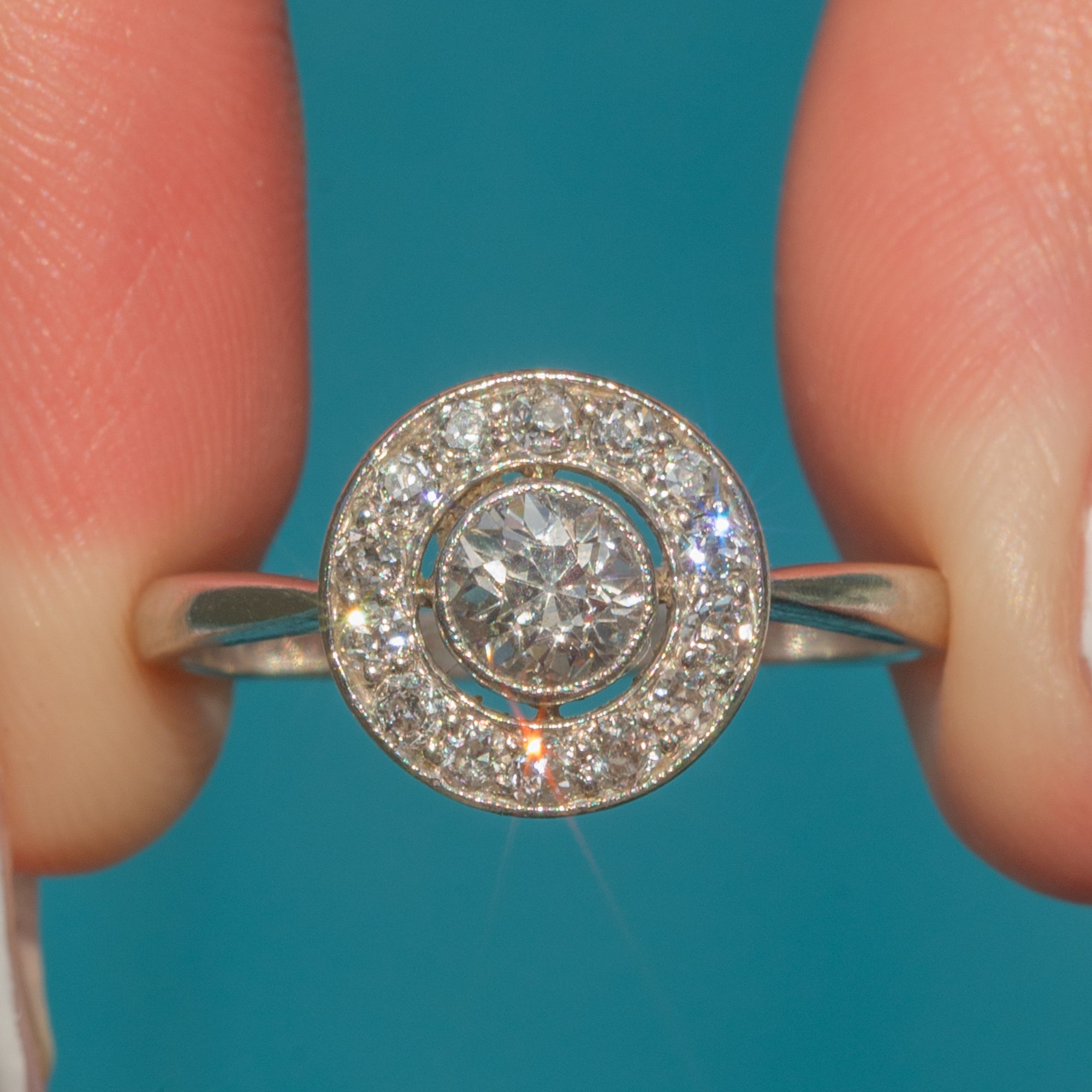 This Art Deco Diamond ring boasts 0.65cts of scintillating Diamonds, all displayed in Platinum illusion settings, creating a striking target design that is sure to grab the attention of any onlookers!