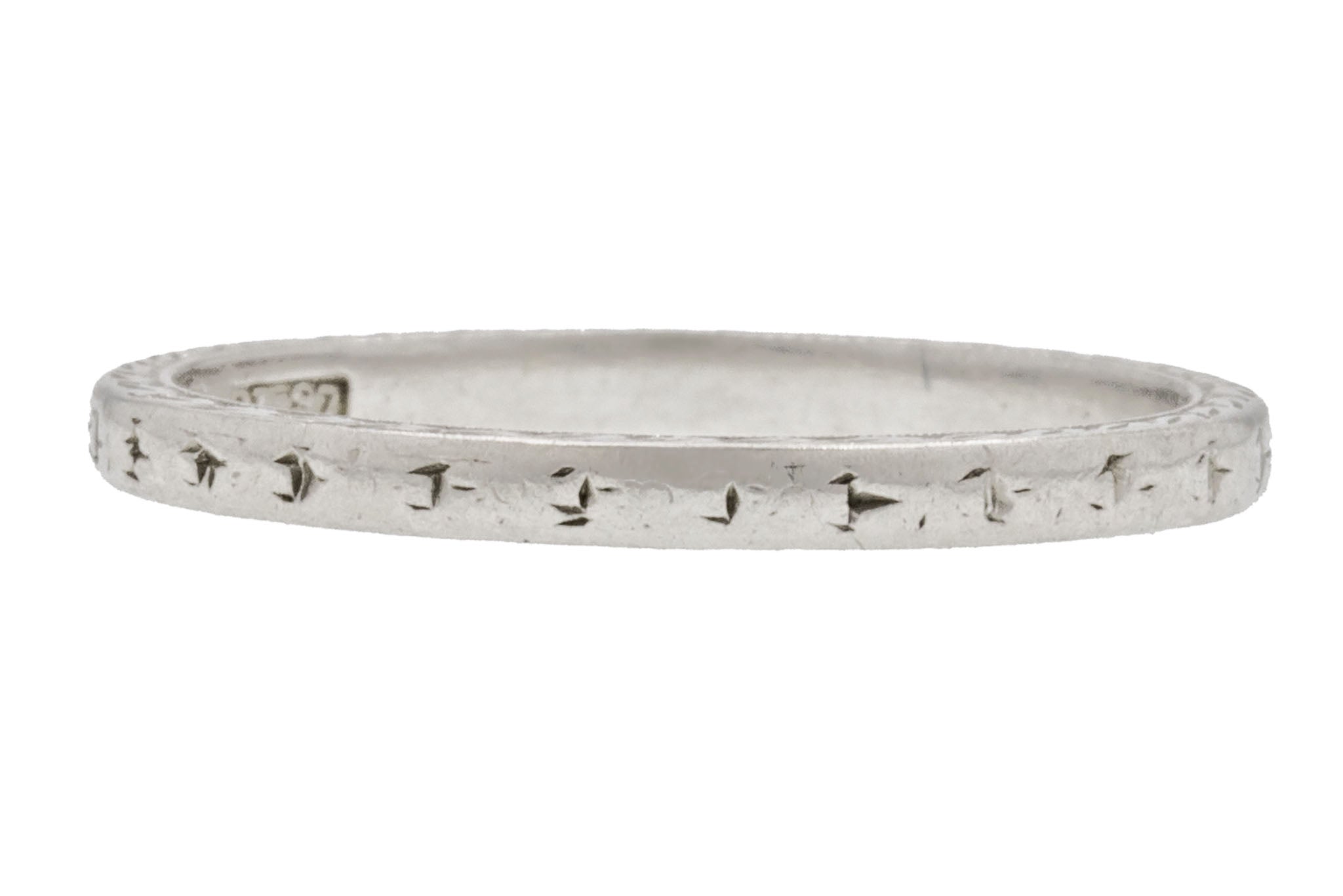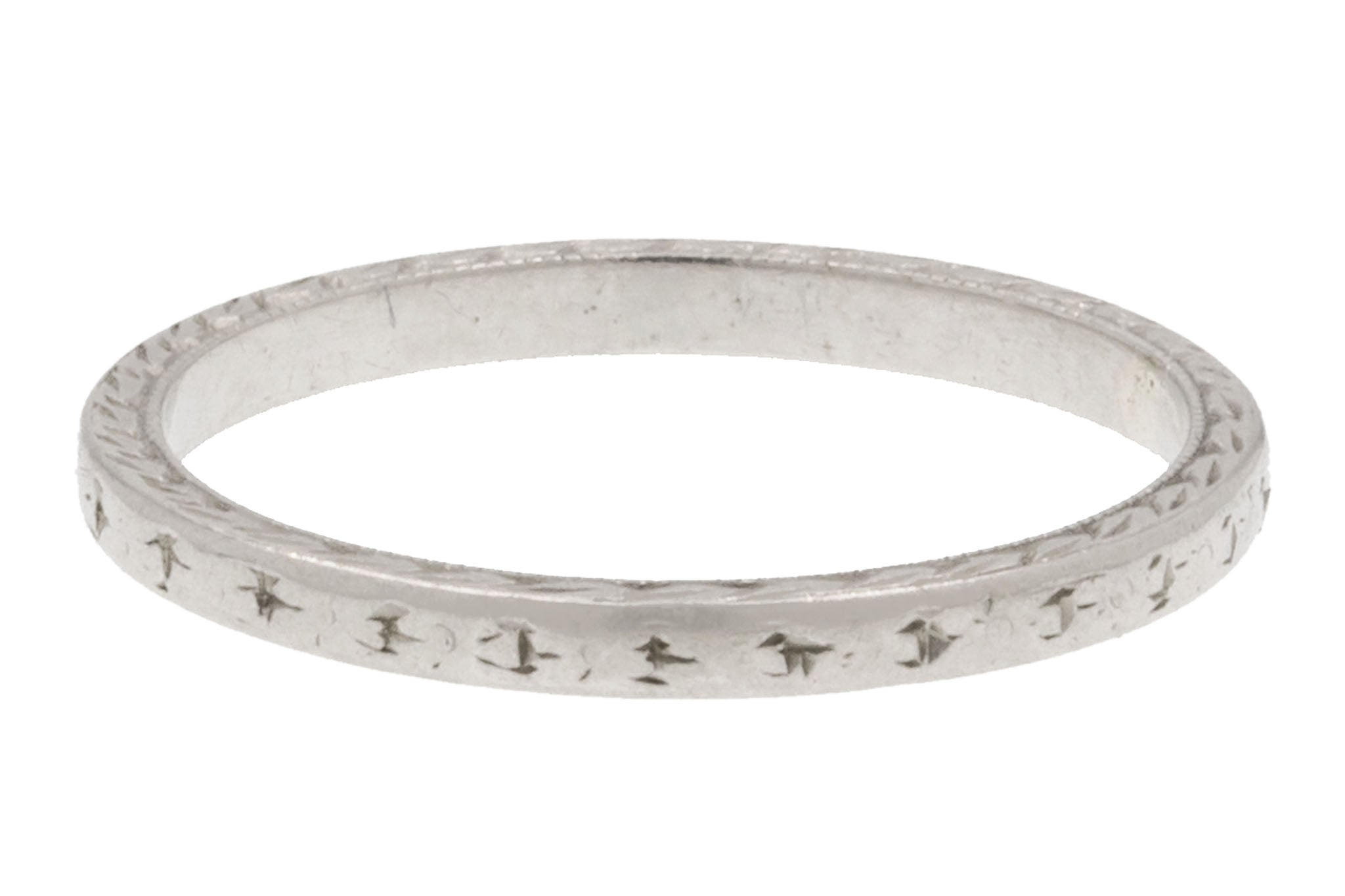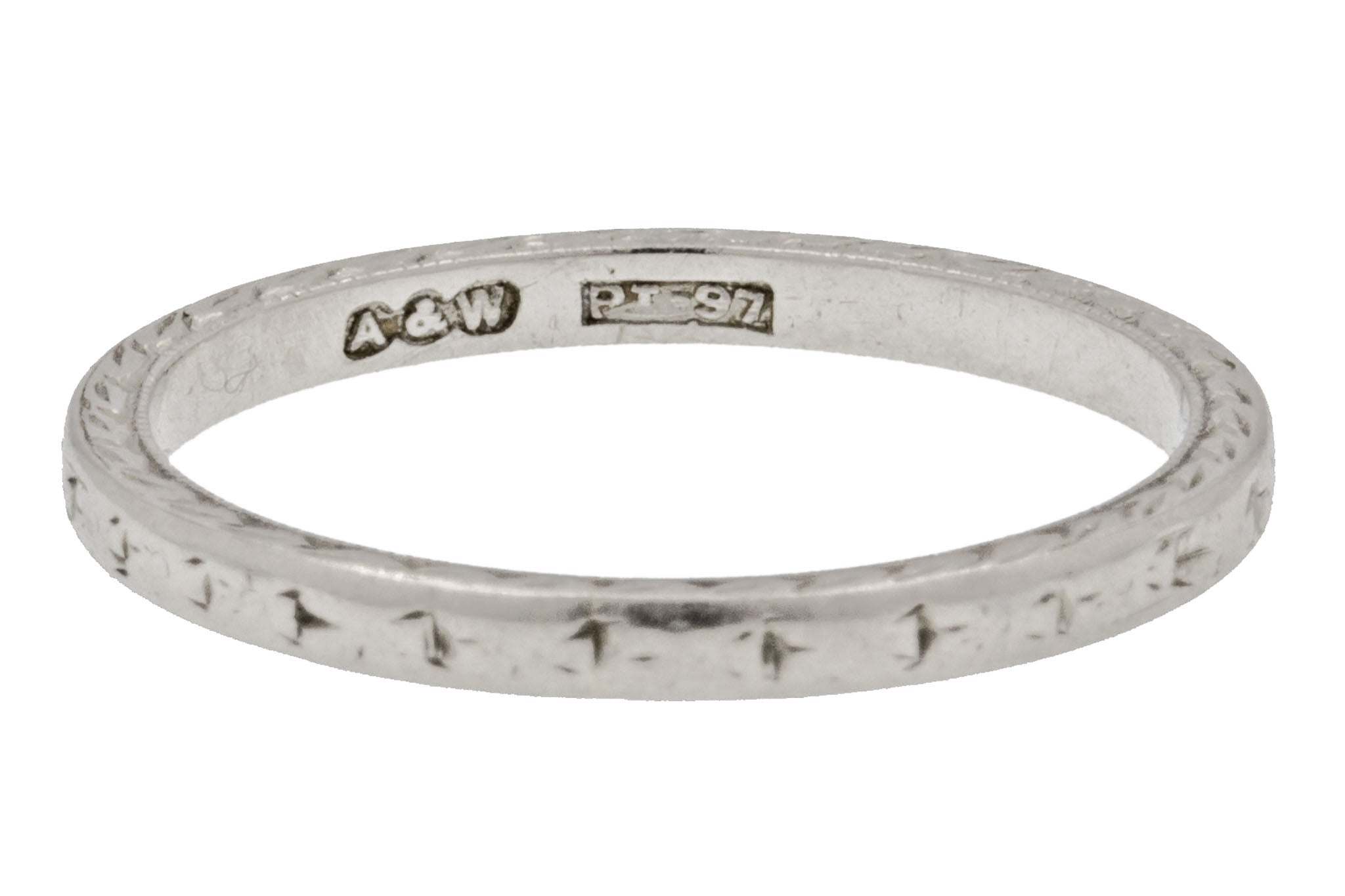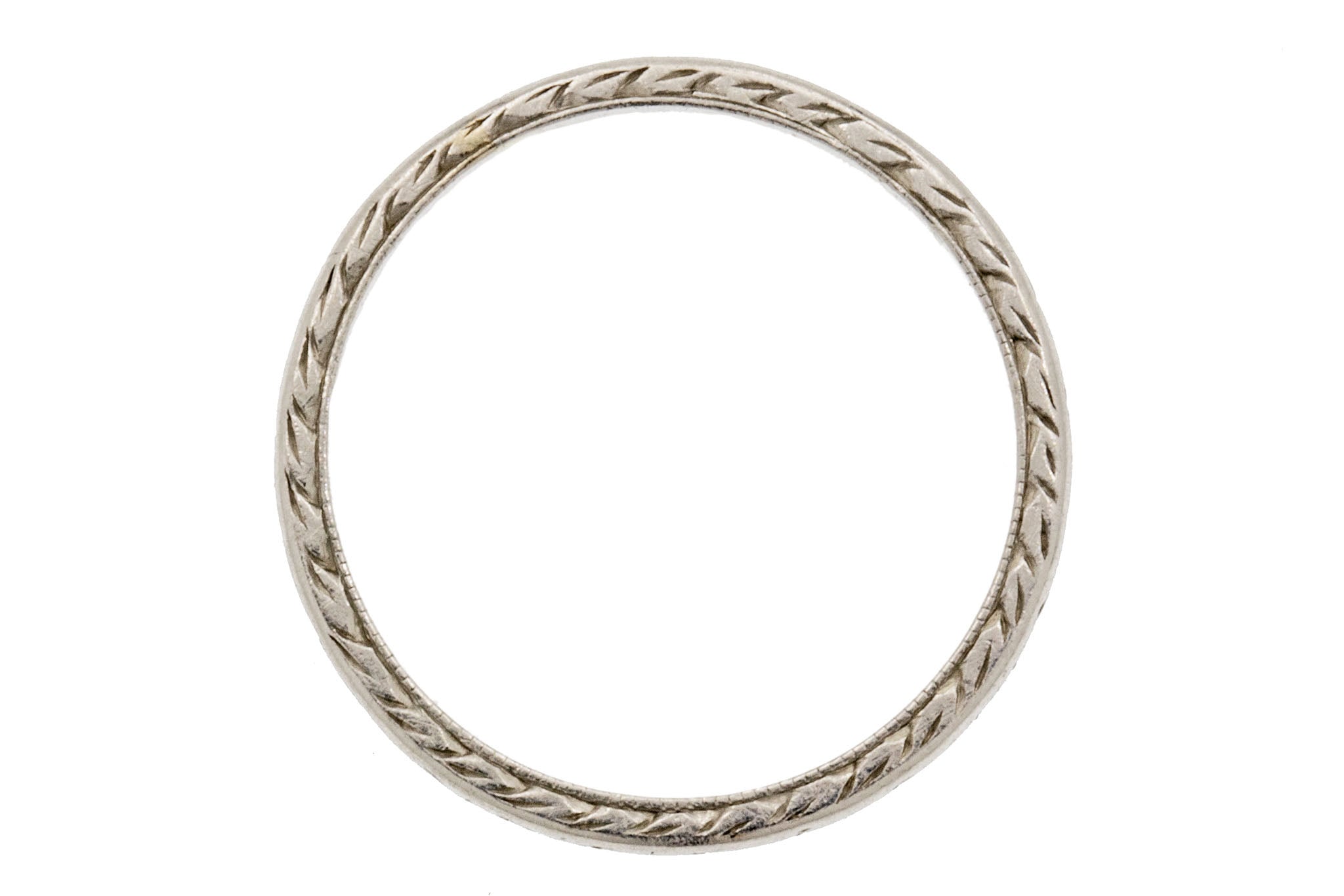 VERY GOOD. This Art Deco Platinum engraved wedding band is in very good condition. The ring has beautifully engraved sides, and the is hallmarked on the inside. The band has some faded orange blossom engravings across its front, which have slowly worn away after years of love. The piece is robust so can be worn every day with confidence!