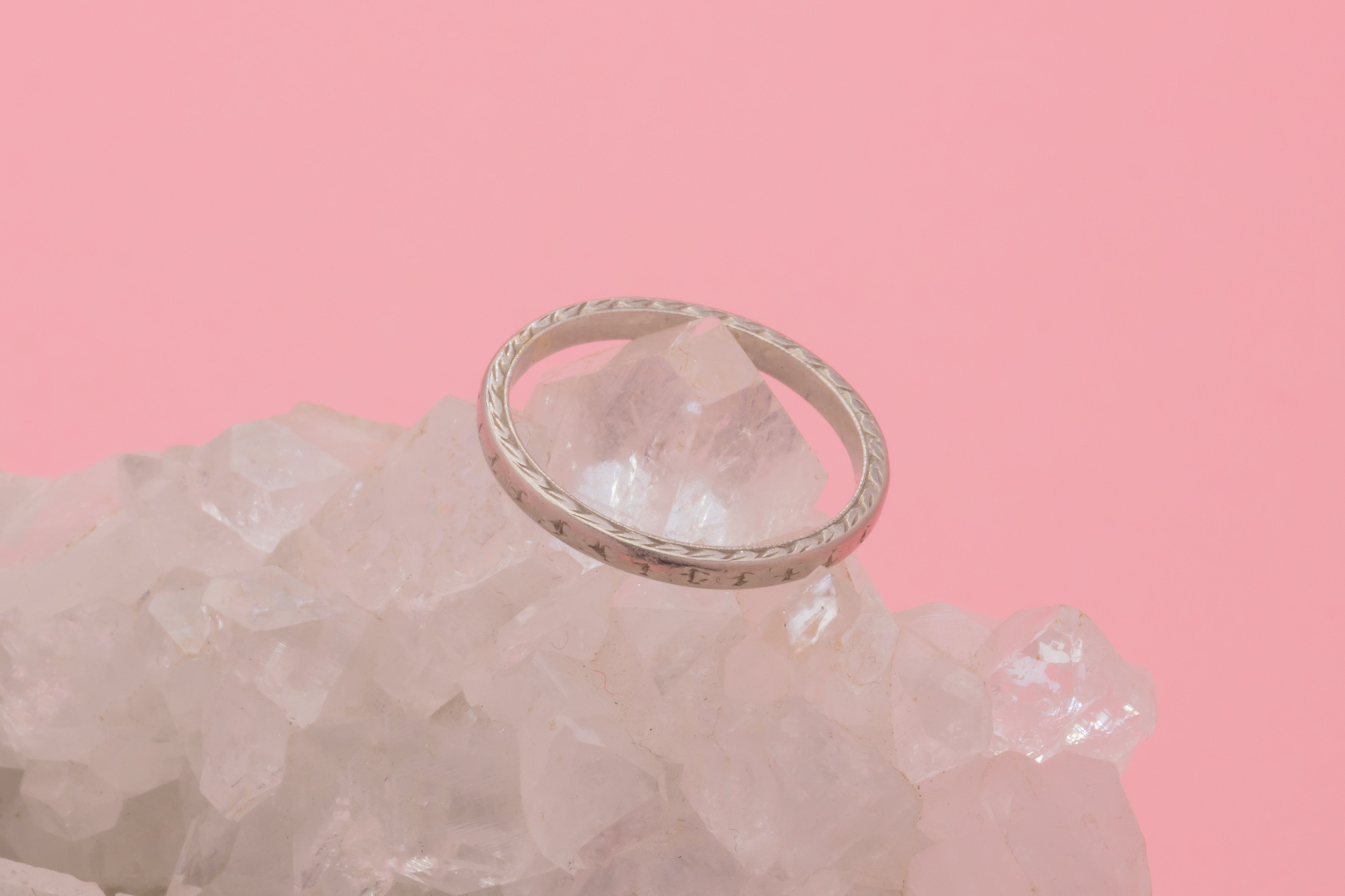 This Art Deco engraved Platinum wedding band is sure to become your go-to piece! The ring has beautifully engraved edges, and the remnants of what we think is orange blossom, fittingly romantic...