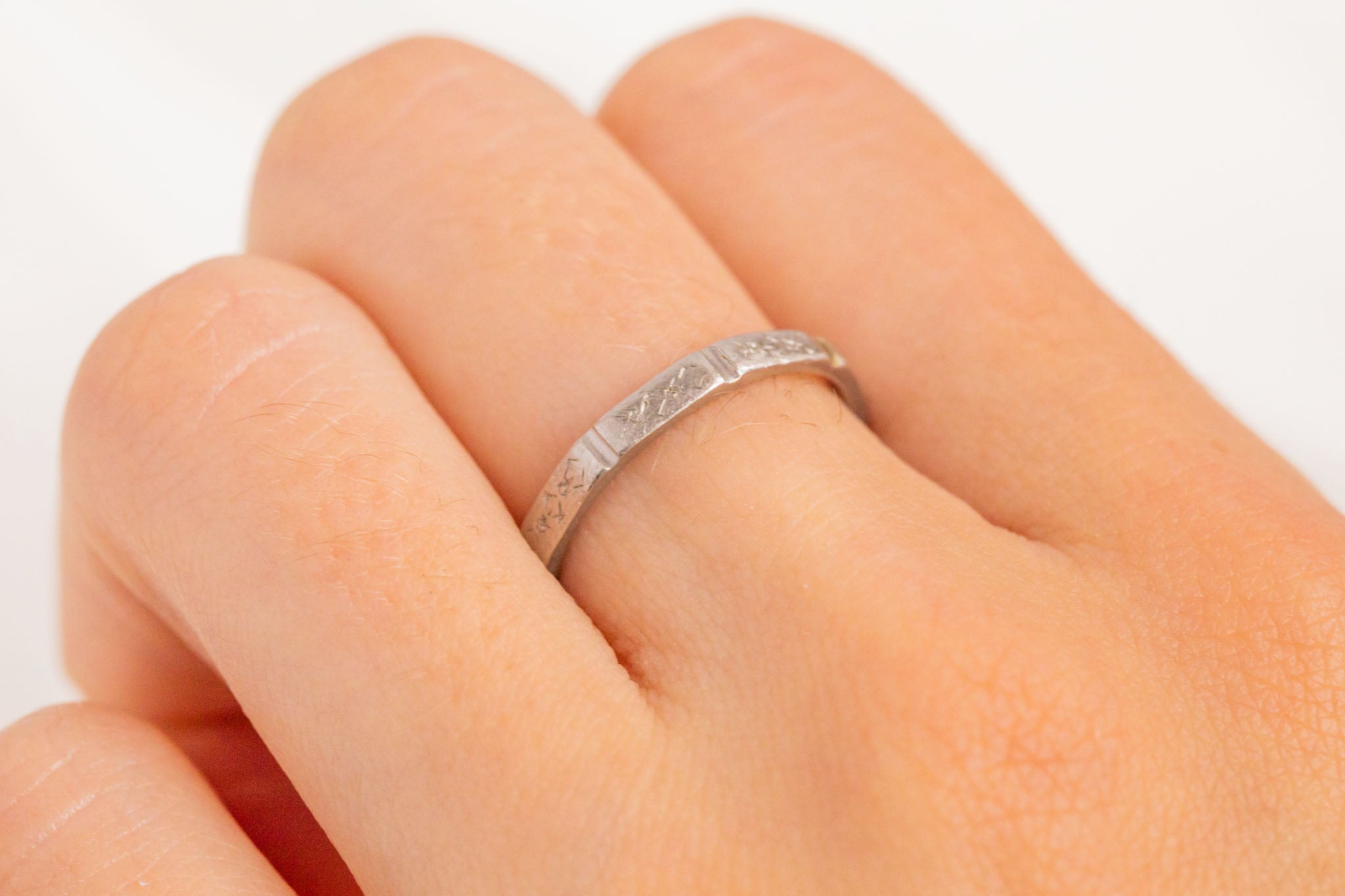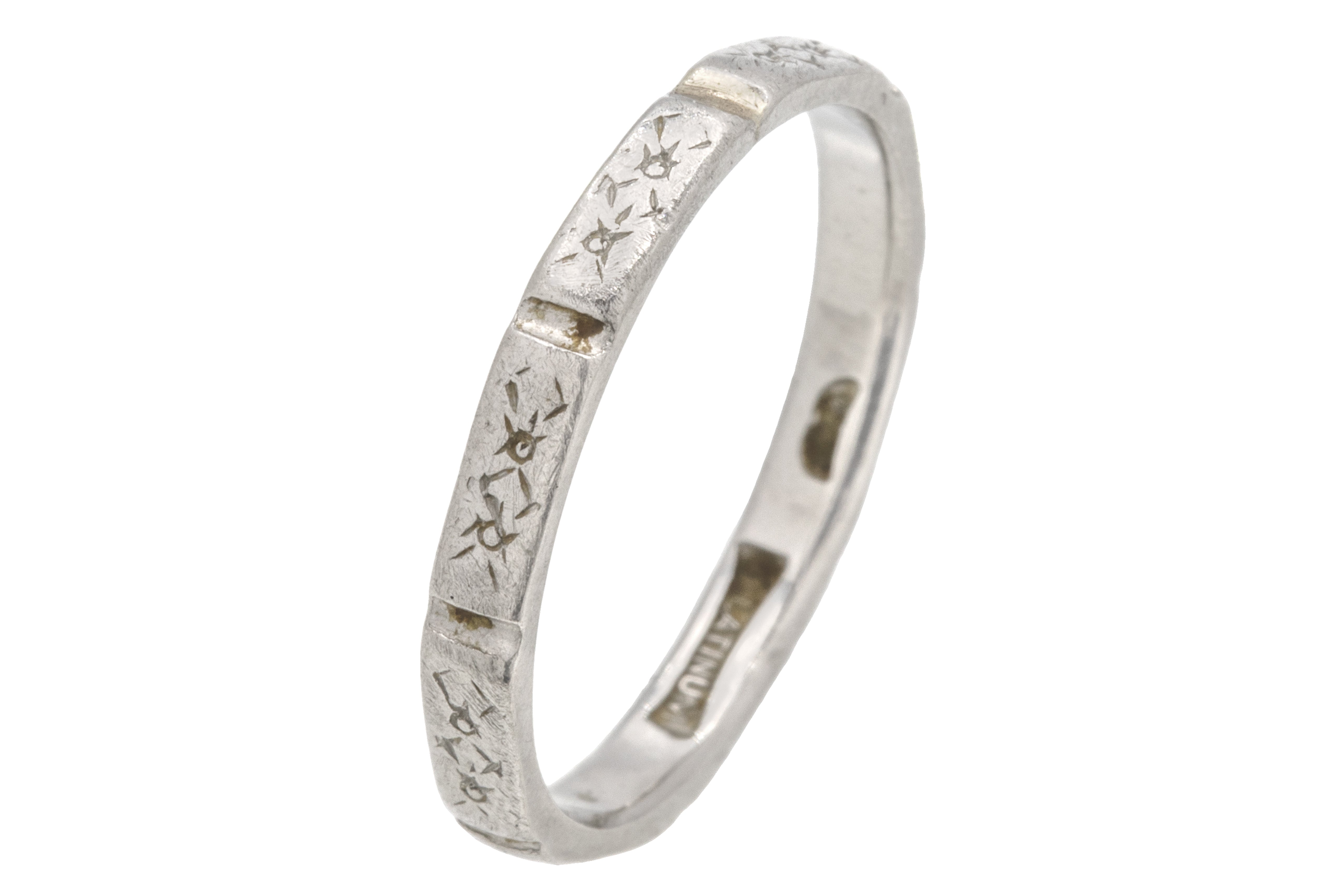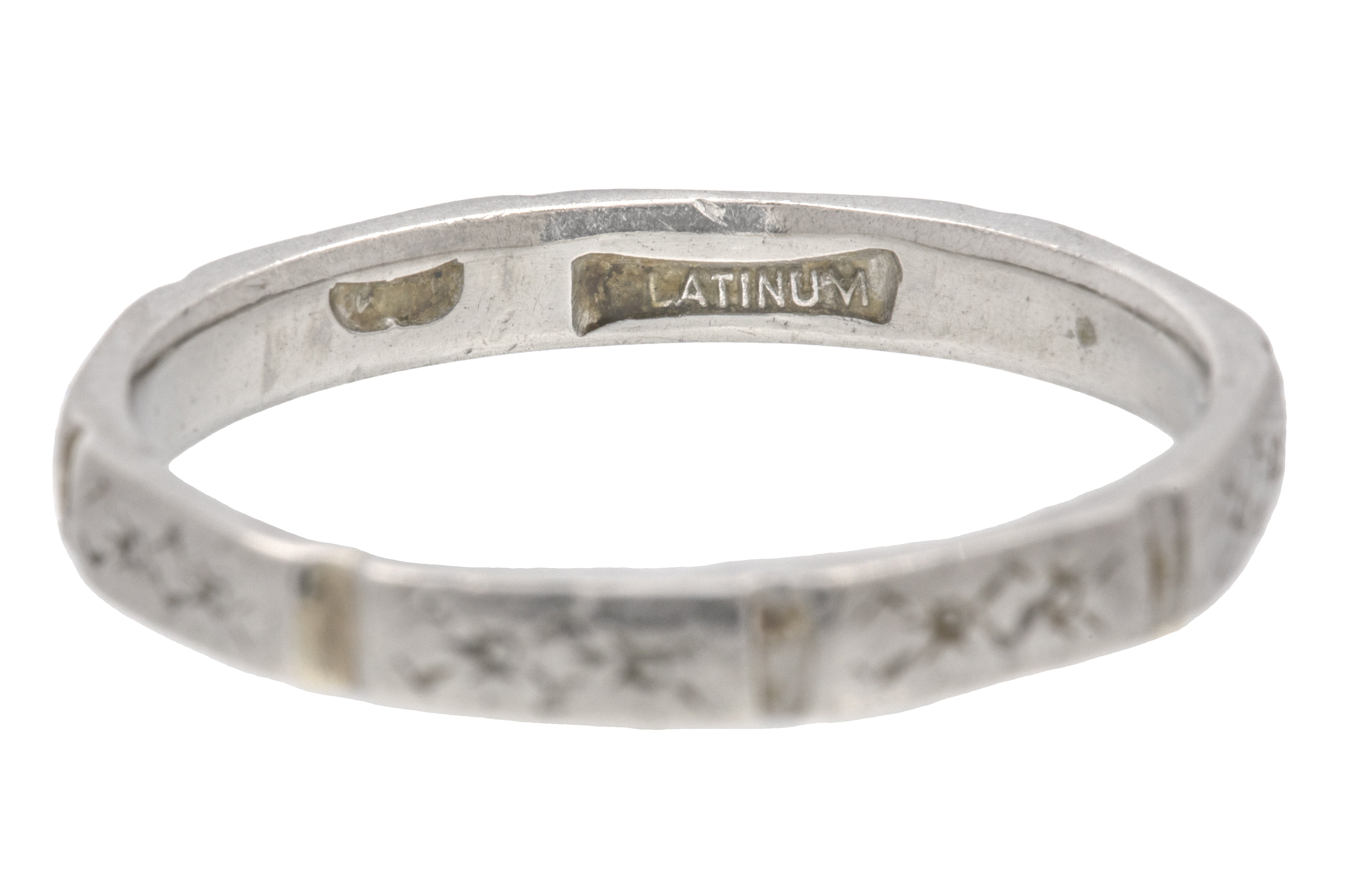 VERY GOOD. This Art Deco Platinum orange blossom engraved band is in very good condition! Each faceted edge has gorgeous delicate engravings, some areas are worn but they are still visible. The ring band has retained its structural integrity and wears comfortably. Aside from some subtle wear, commensurate with age, this Art Deco ring is in beautiful condition and is calling your name!