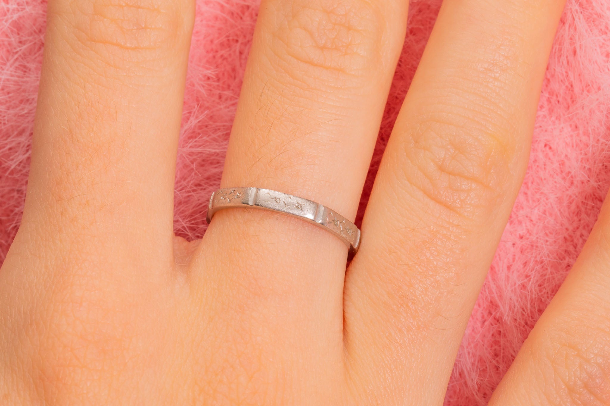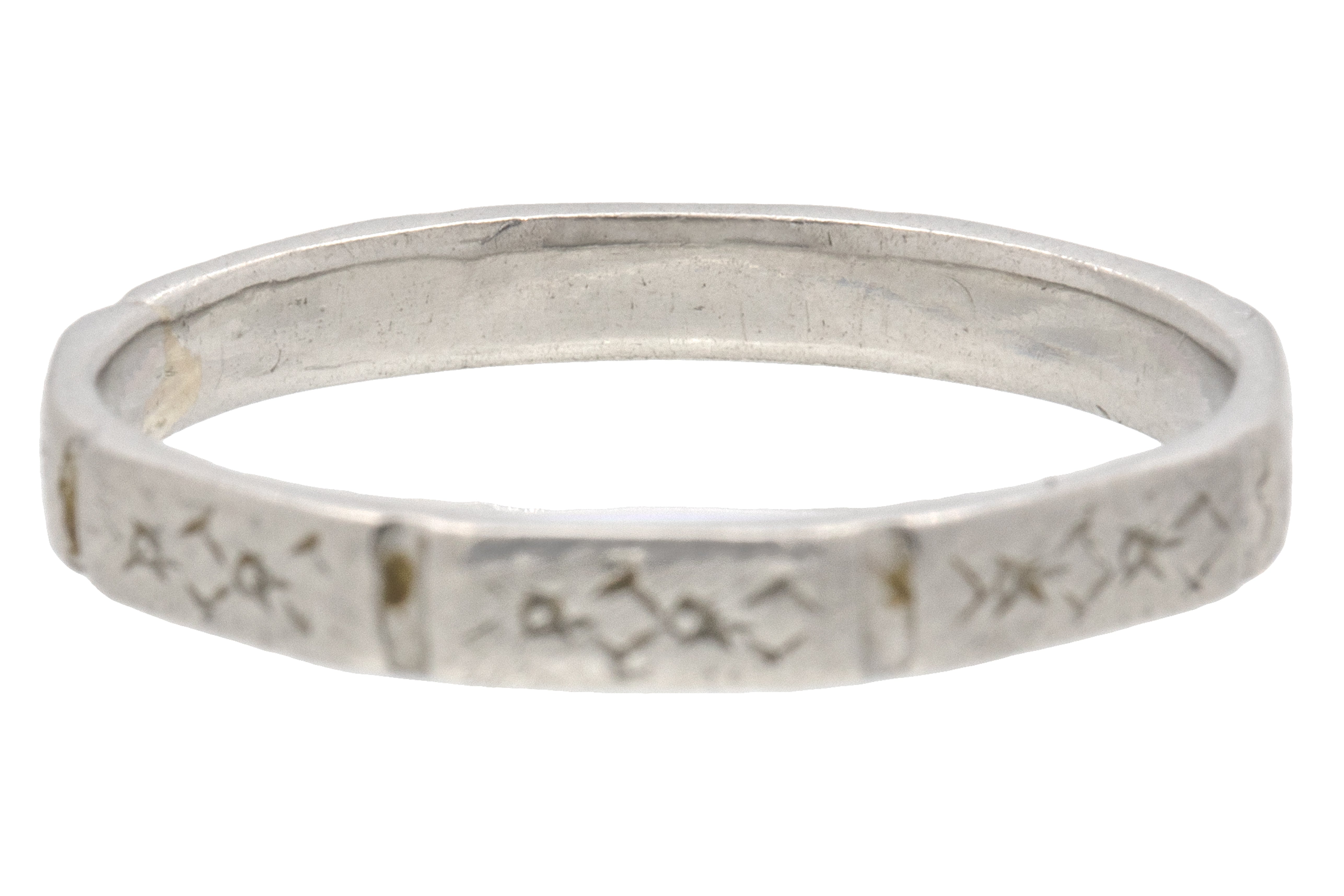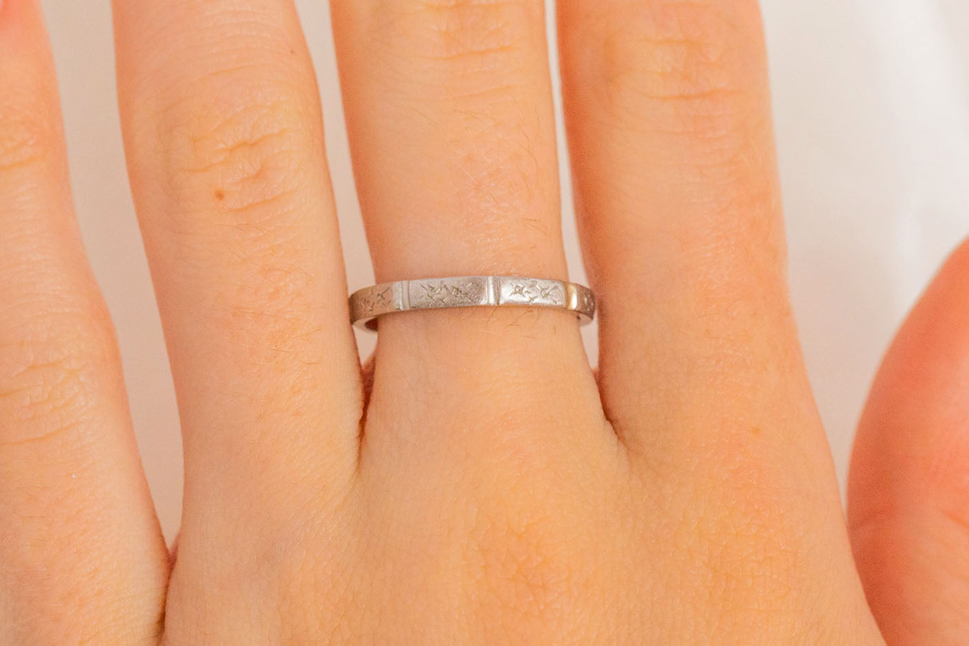 VERY GOOD. This Art Deco Platinum orange blossom engraved band is in very good condition! Each faceted edge has gorgeous delicate engravings, some areas are worn but they are still visible. The ring band has retained its structural integrity and wears comfortably. Aside from some subtle wear, commensurate with age, this Art Deco ring is in beautiful condition and is calling your name!