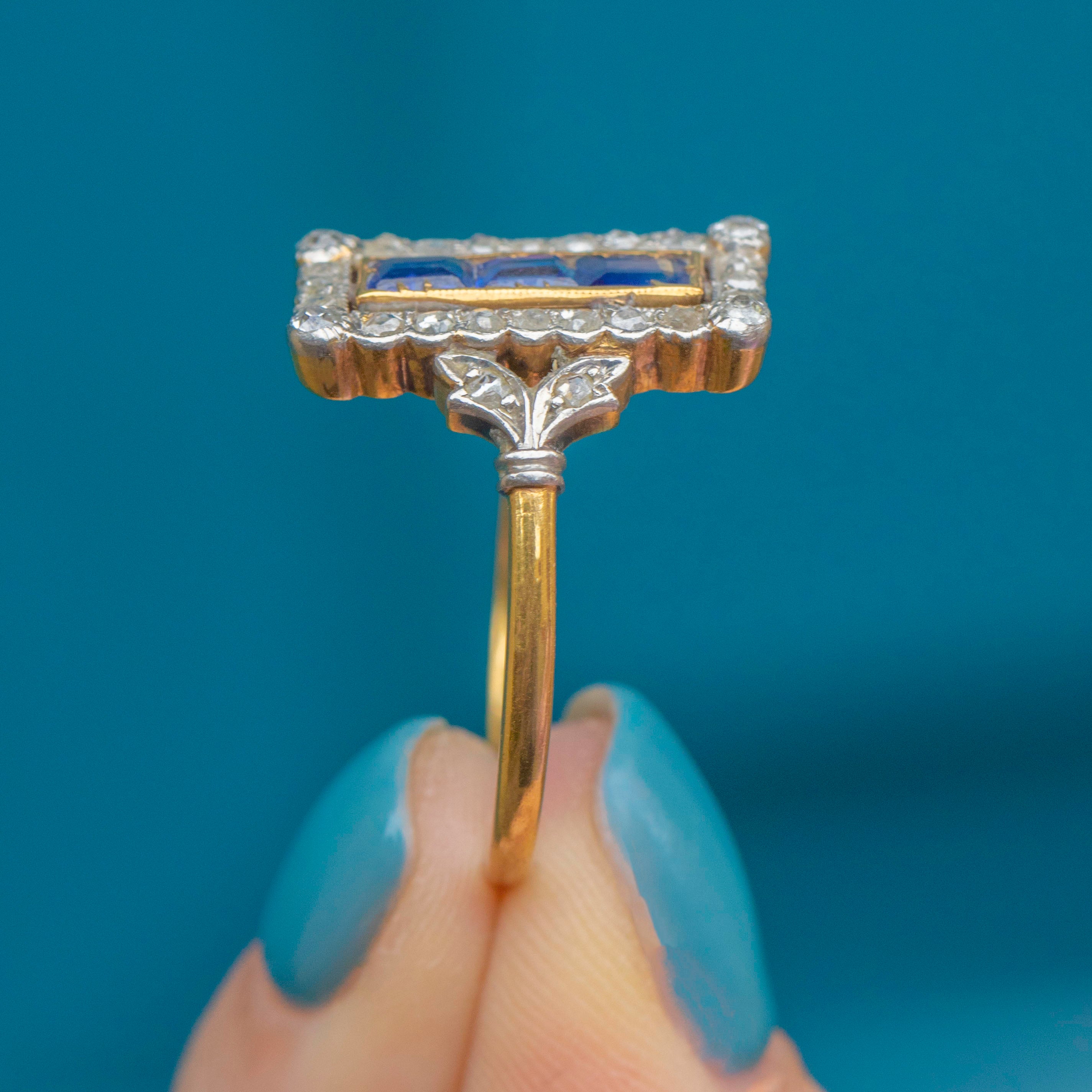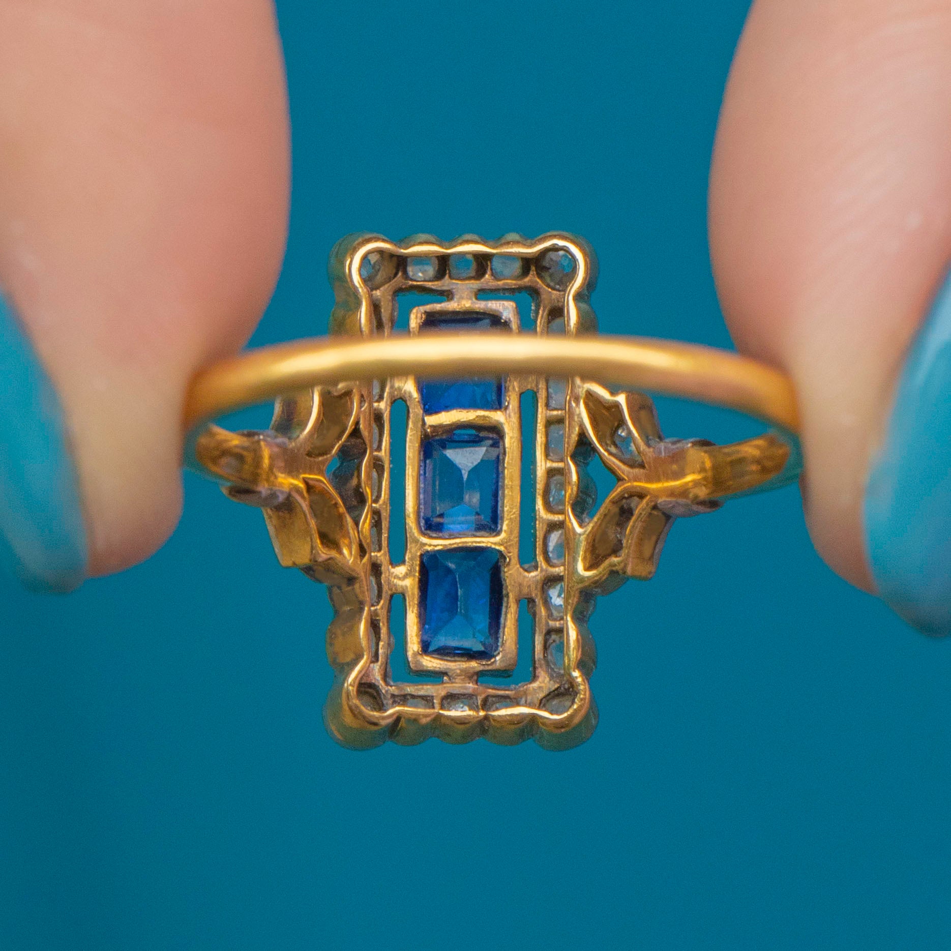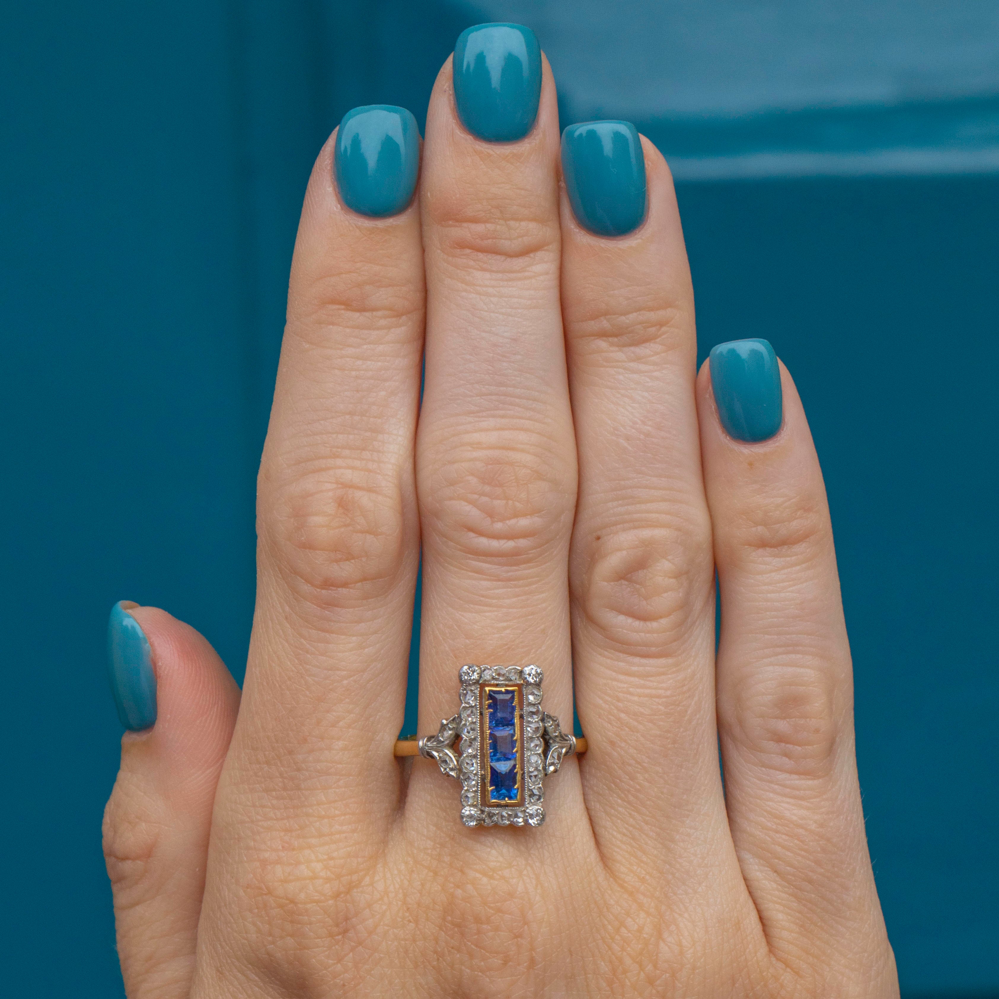 VERY GOOD-EXCELLENT. This 18ct Gold Art Deco Sapphire Diamond panel ring is in wonderful condition throughout. The gemstones are all present and securely set, free from chips or abrasions. Some of the claws holding the Sapphires have worn down over the years, but rest assured that they have remained securely set. The Platinum is lustrous and the 18ct Gold is brightly saturated; this is an exceptionally rare piece of Art Deco jewellery that will take pride of place in your collection!