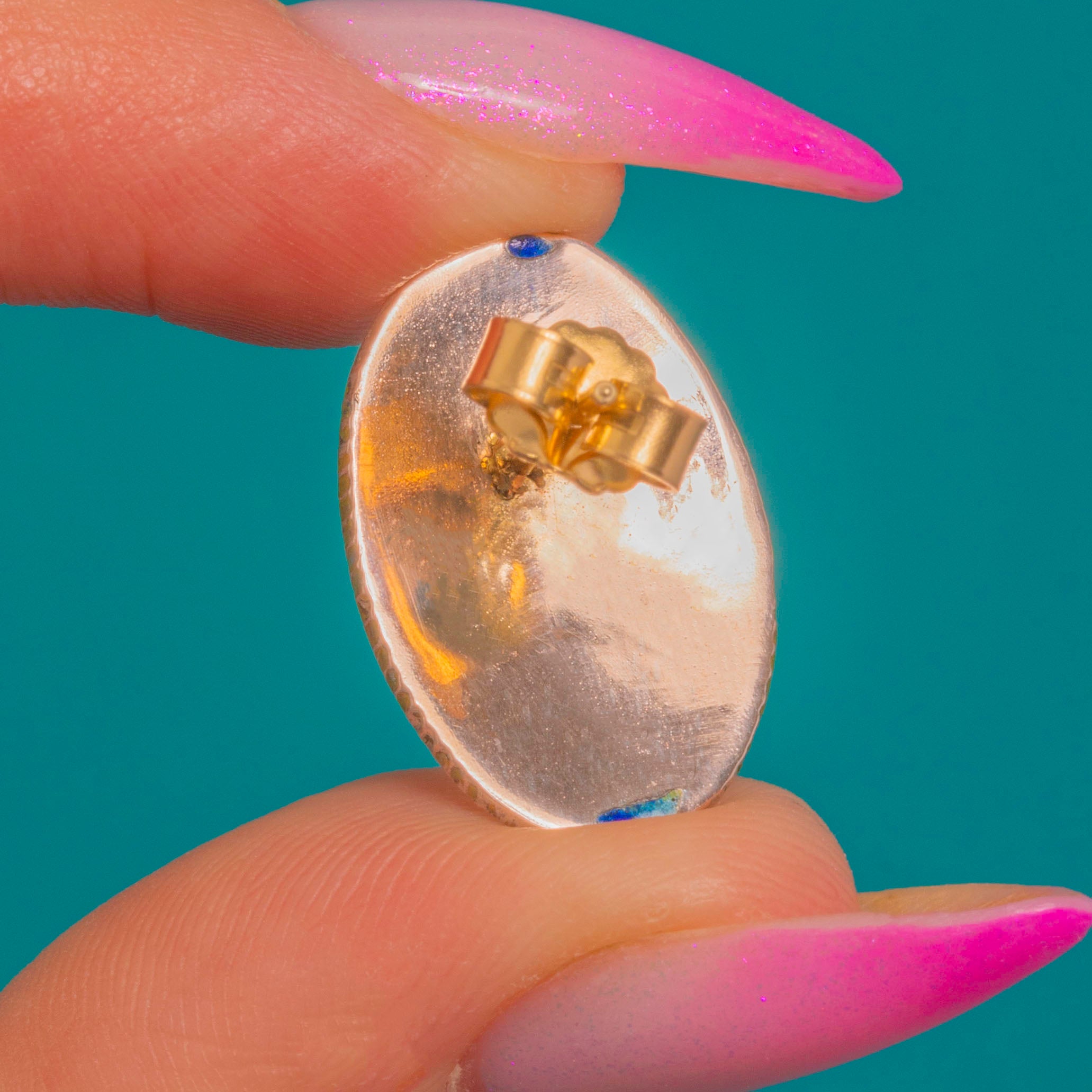 Finished with 9ct Gold backs and secure butterfly fittings, they sit flush on the ear. A striking, wearable Deco design that brings joyous colour and artisan charm to any outfit.