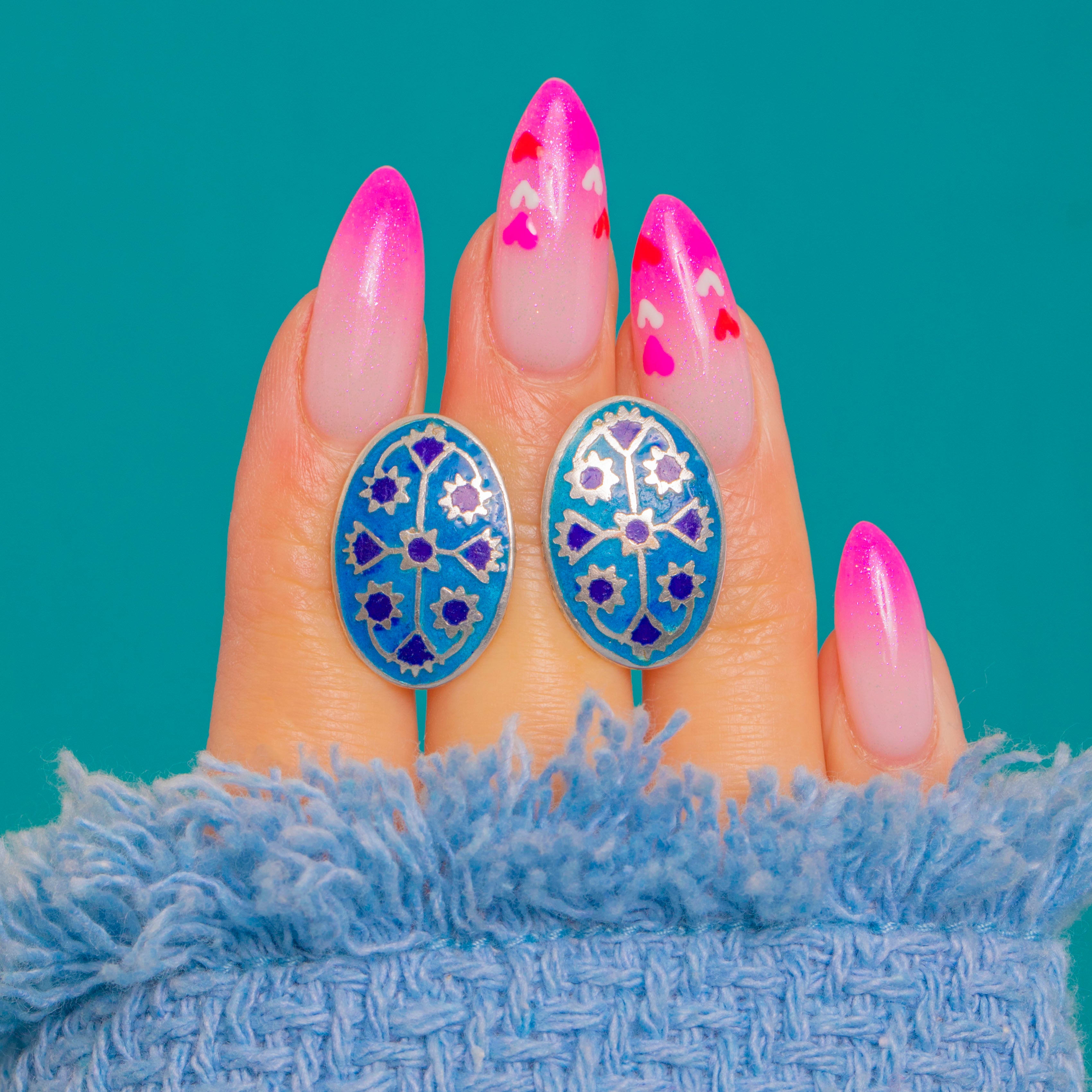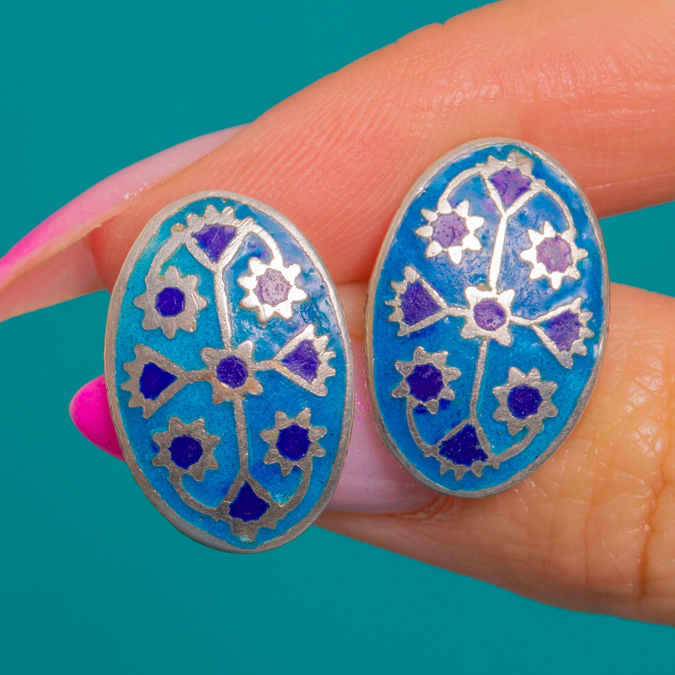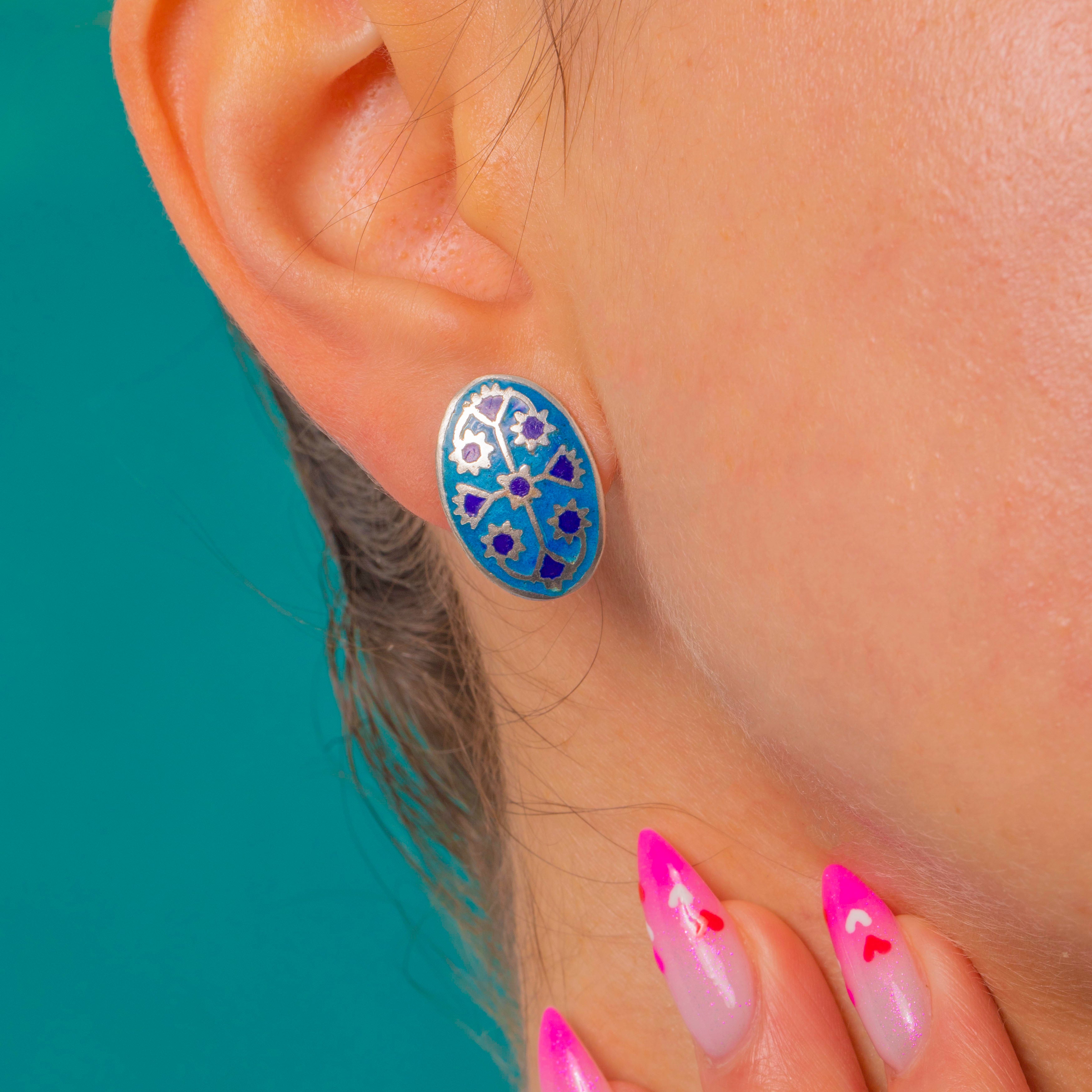 Vibrant and graphic, these Art Deco stud earrings showcase oval Blue Enamel panels in a vivid turquoise ground, punctuated by deep cobalt stylised rosette motifs. Fine Silver partitions define each element, creating a bold pop of colour with refined symmetry.