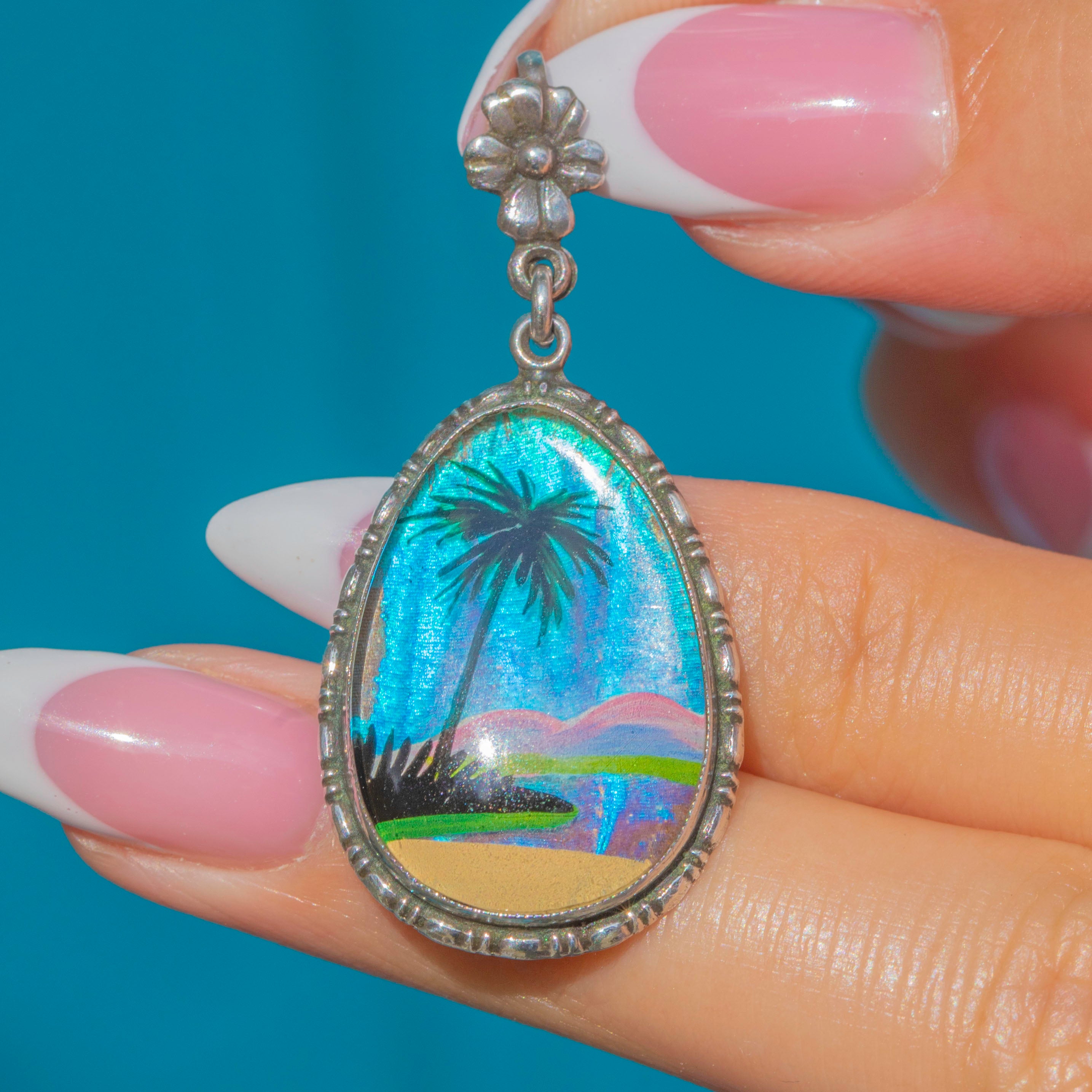 VERY GOOD-EXCELLENT: The tropical beach detailing is crisp and the butterfly wing has retained its neon hues. The grooves have accrued a patina, adding to her antique charm. On the back, there is a maker's mark stamp for Thomas Mott which has worn slightly but is still legible. You'll want to suspend her from a chain as soon as she's yours!