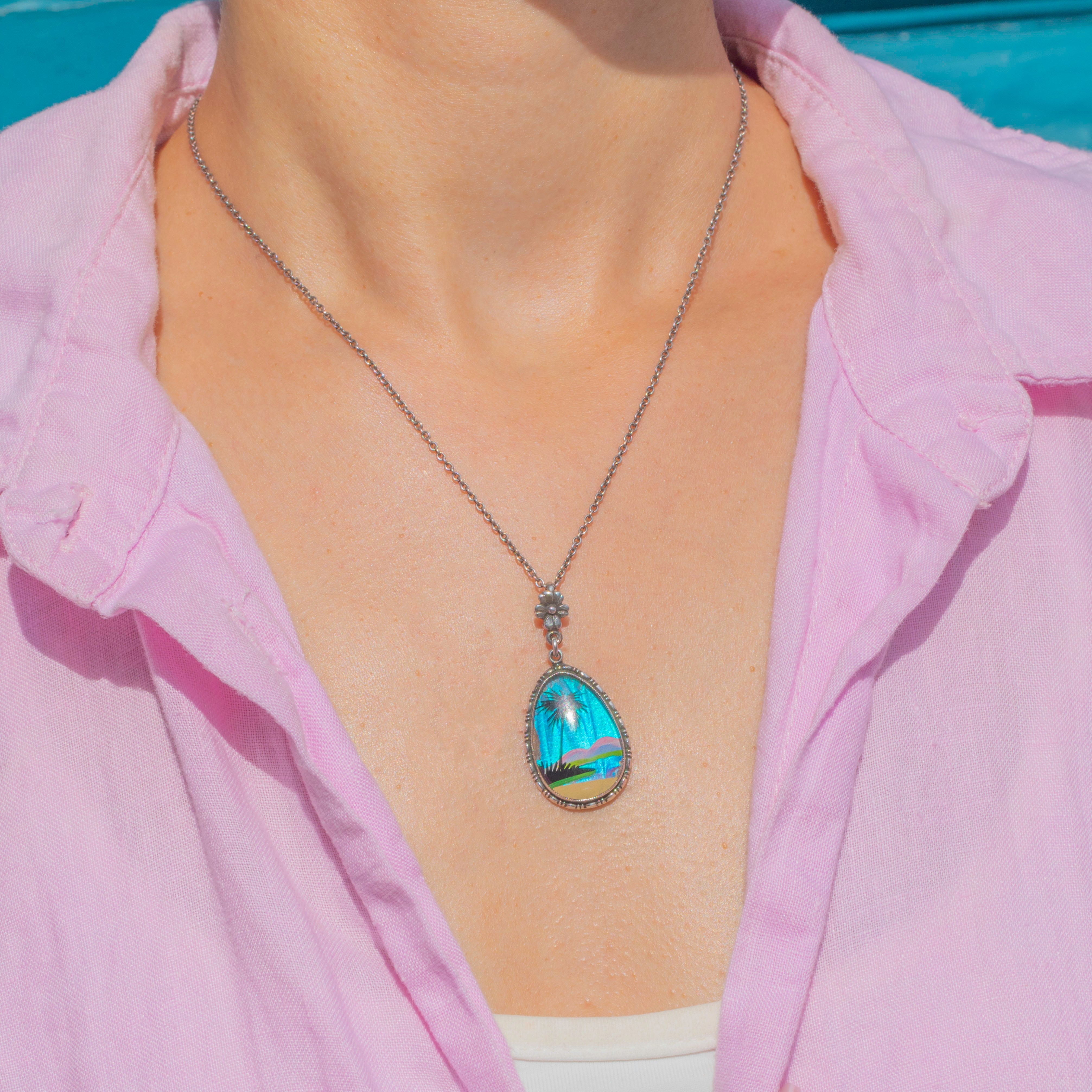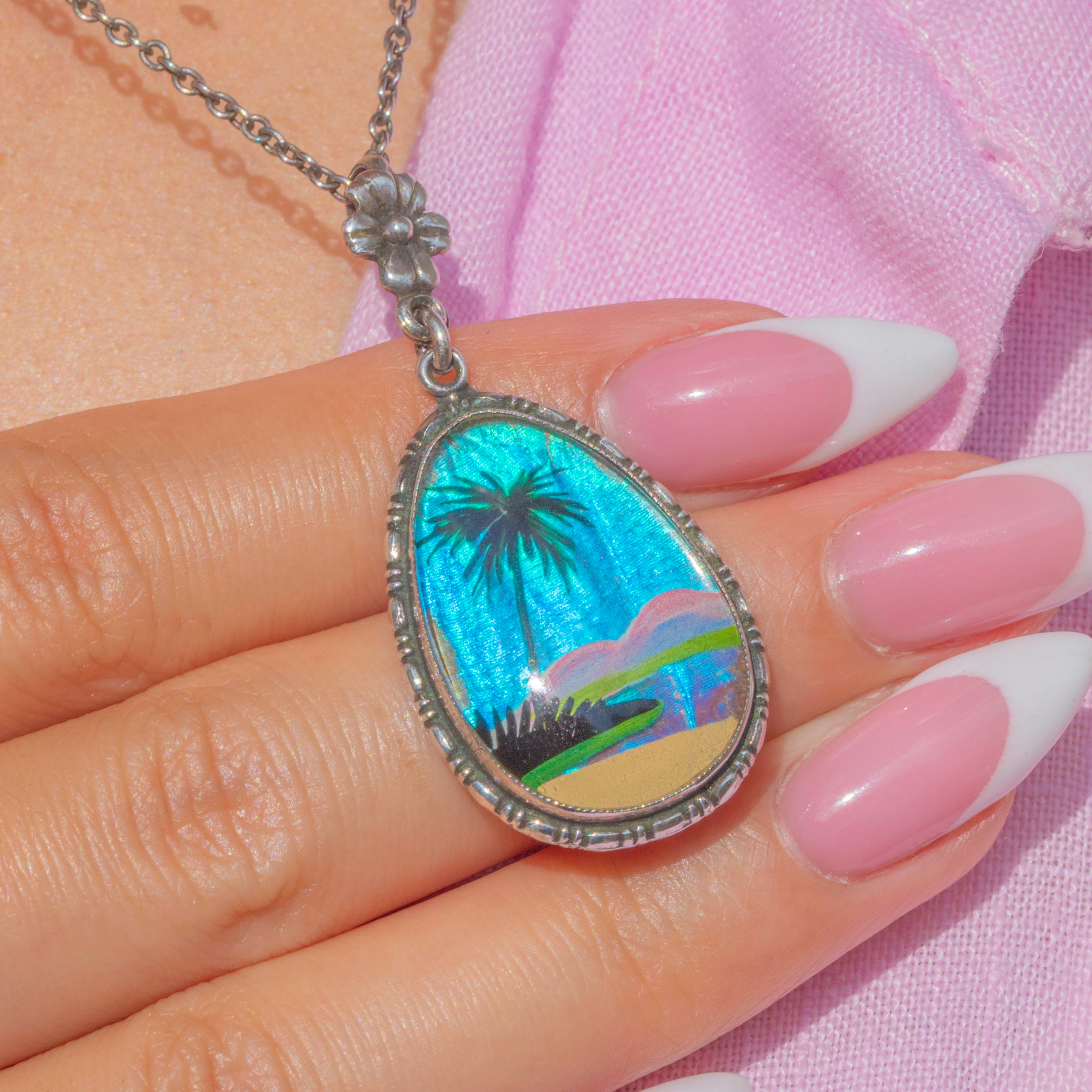 Beautifully smooth, she depicts a tropical beach setting which makes us want to crawl inside! We love the vibrant colours encased within this Art Deco pendant, she really is a standout piece. What's more, butterfly wing jewellery is highly collectible, so what better way to grow your collection than with this Thomas Mott pendant?!