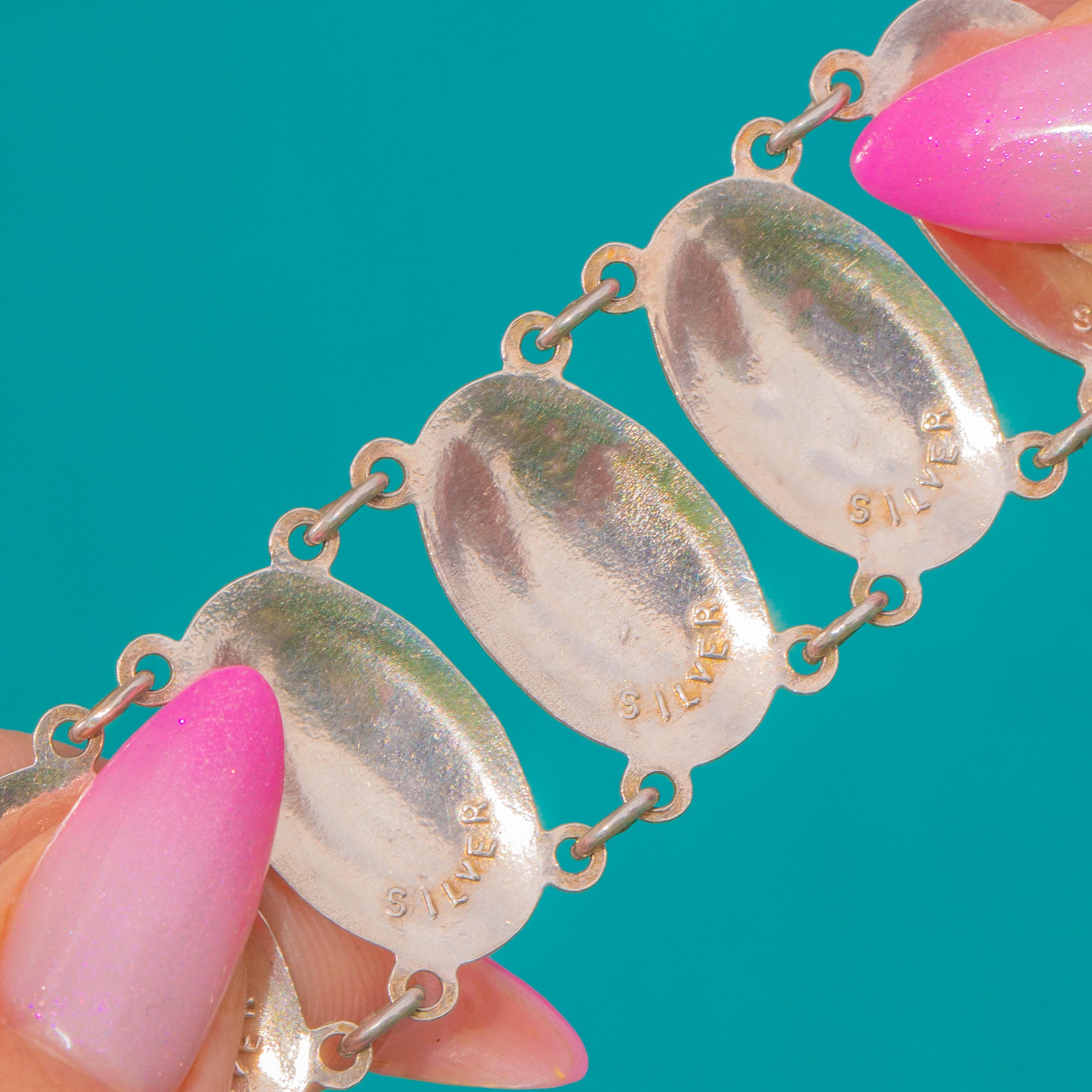 EXCELLENT: The Enamel insets are bright and glossy with only the lightest surface abrasions visible under close inspection, and no chips noted. The Sterling Silver shows minimal surface wear with a gentle, even patina; the engraved borders remain crisp and well-defined. All links are secure and the box clasp closes firmly.