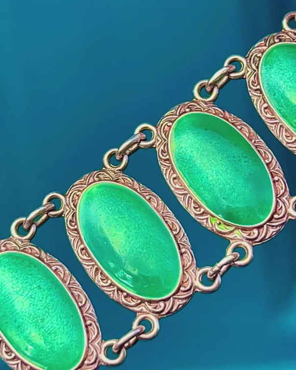 Vivid emerald-green Enamel domes glow from a sequence of oval panels, each finely framed with foliate and scroll details in Sterling Silver. The articulated construction gives this statement bracelet beautiful movement and presence, with each link catching the light as it drapes around the wrist.