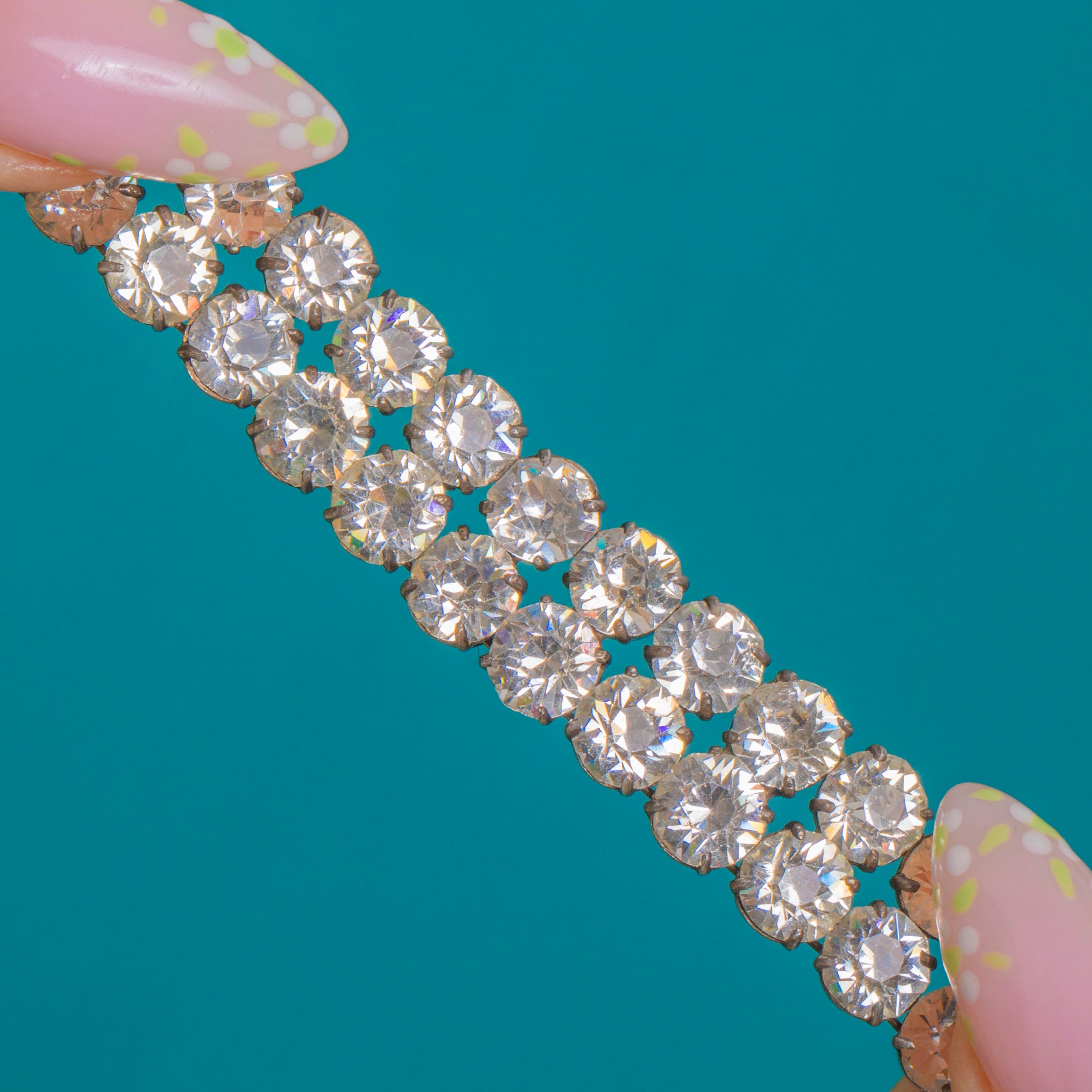 Elegant, klar und von endlosem Funkeln durchzogen, fängt dieses Art Deco Doppelreihen-Armband die Liebe der Epoche zu Präzision und Licht ein. Zwei perfekt ausgerichtete Reihen leuchtender White Paste-Steine ruhen in ordentlichen, vierzackigen Chaton-Fassungen und bilden ein schlankes Band aus Strahlkraft, das sich geschmeidig dem Handgelenk anpasst.