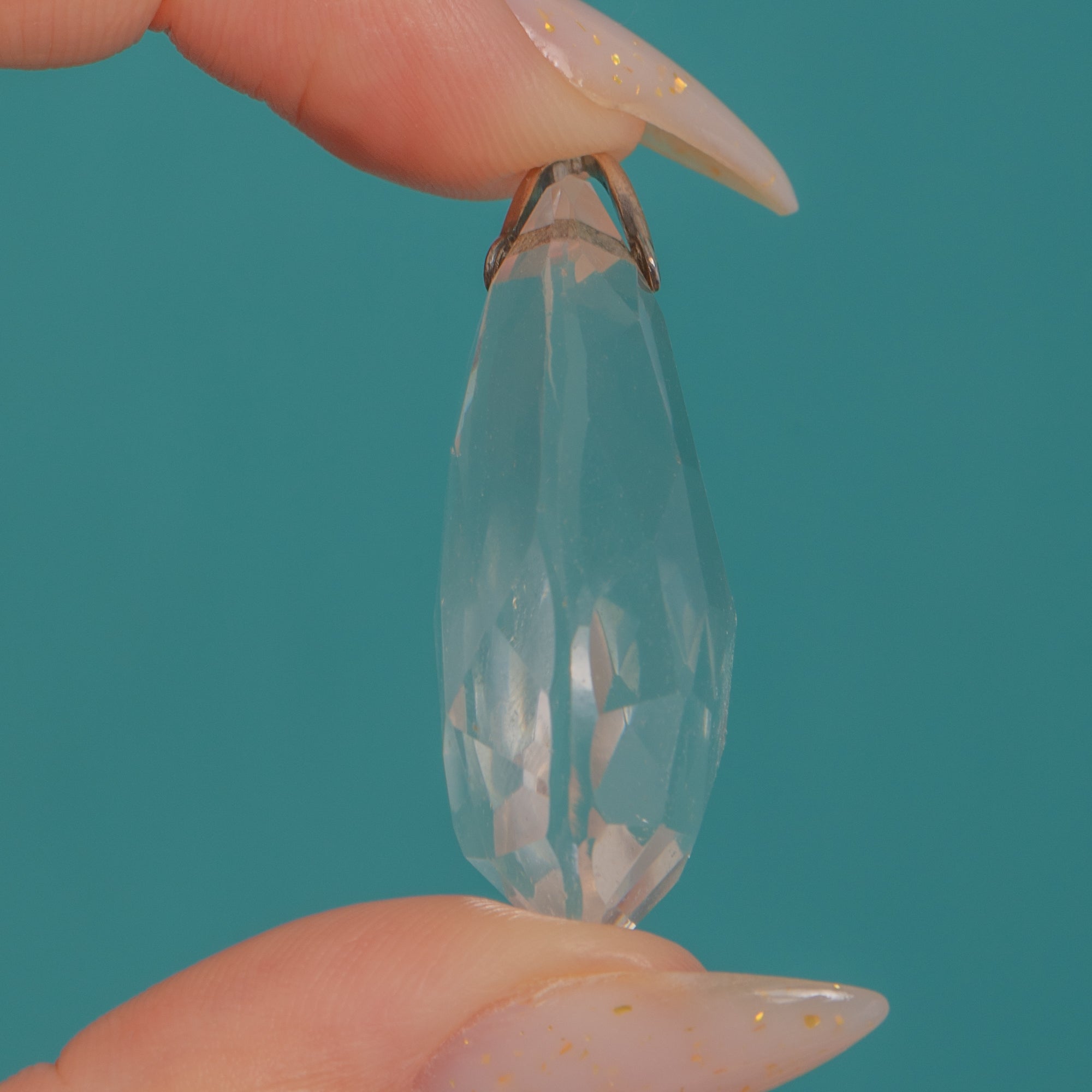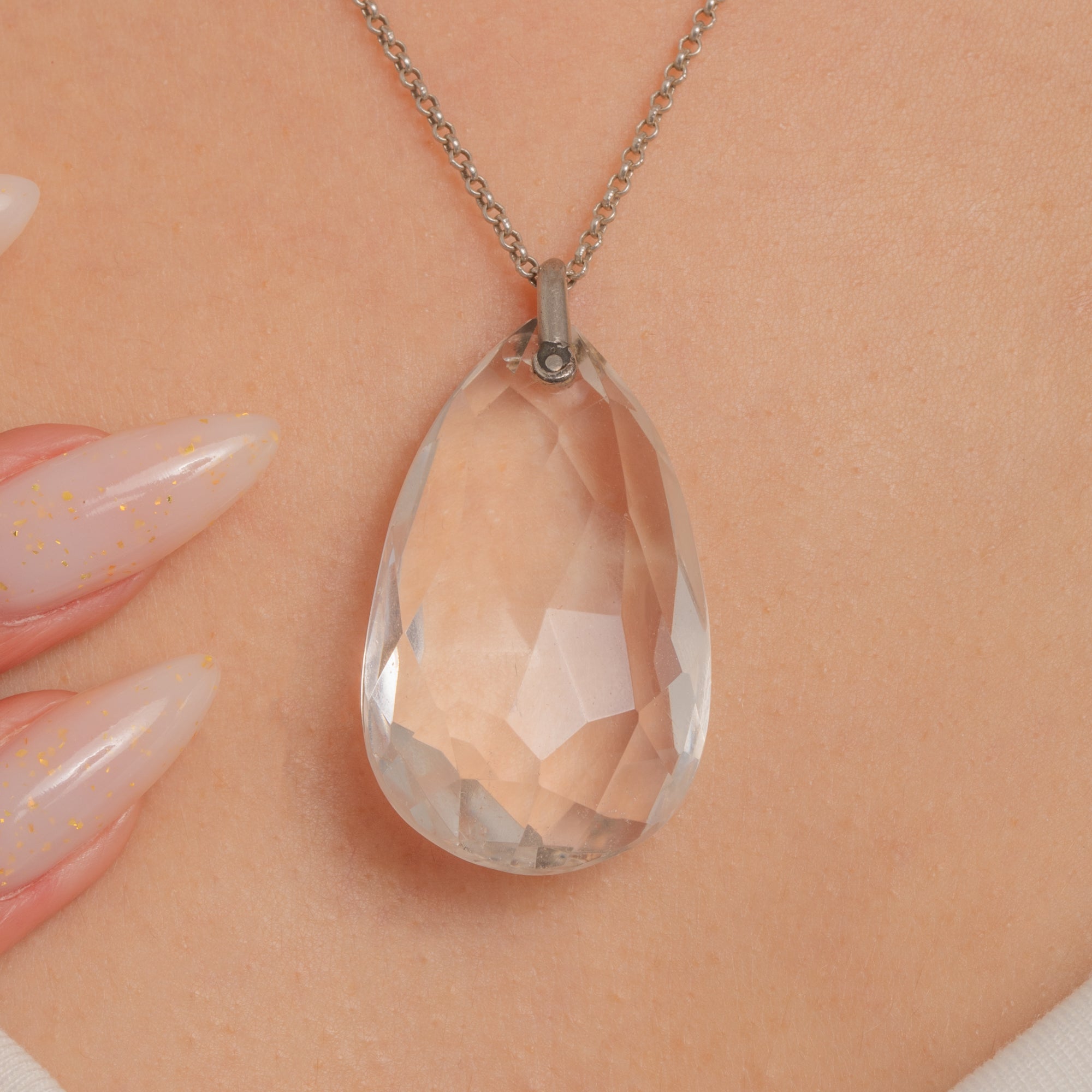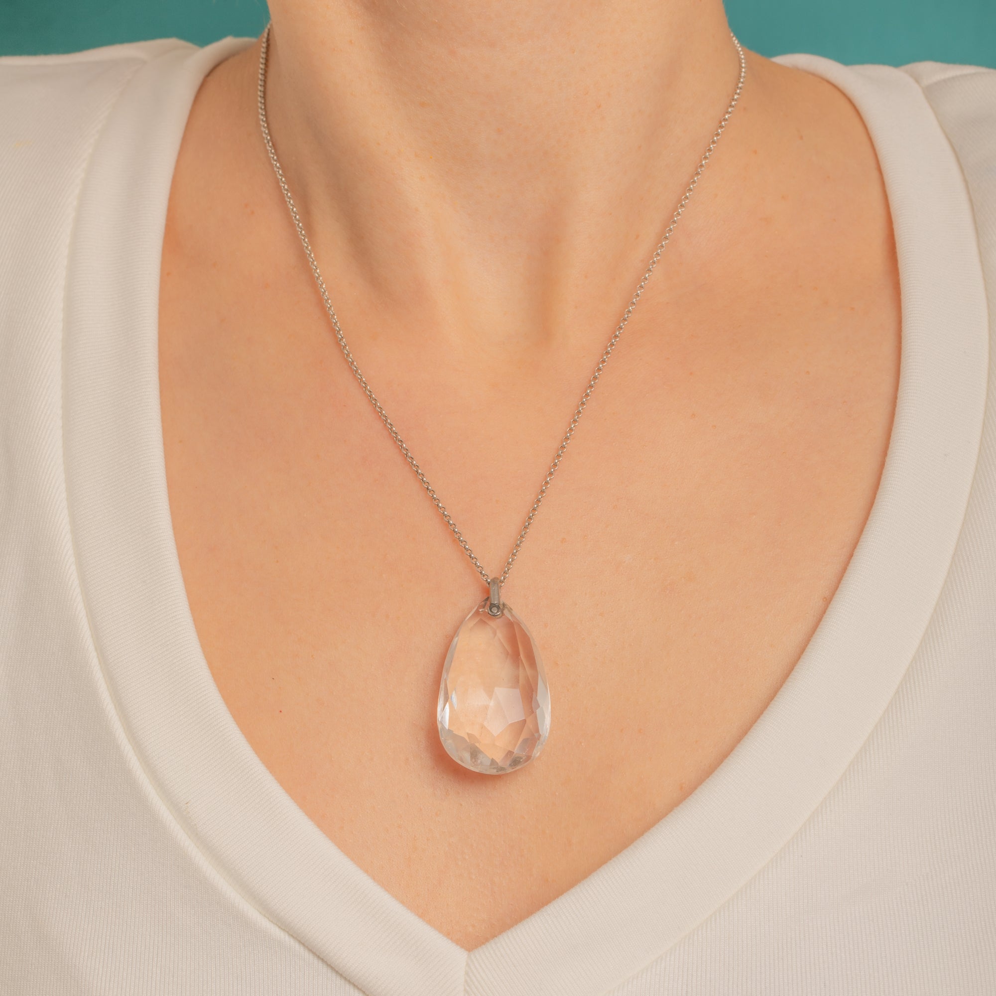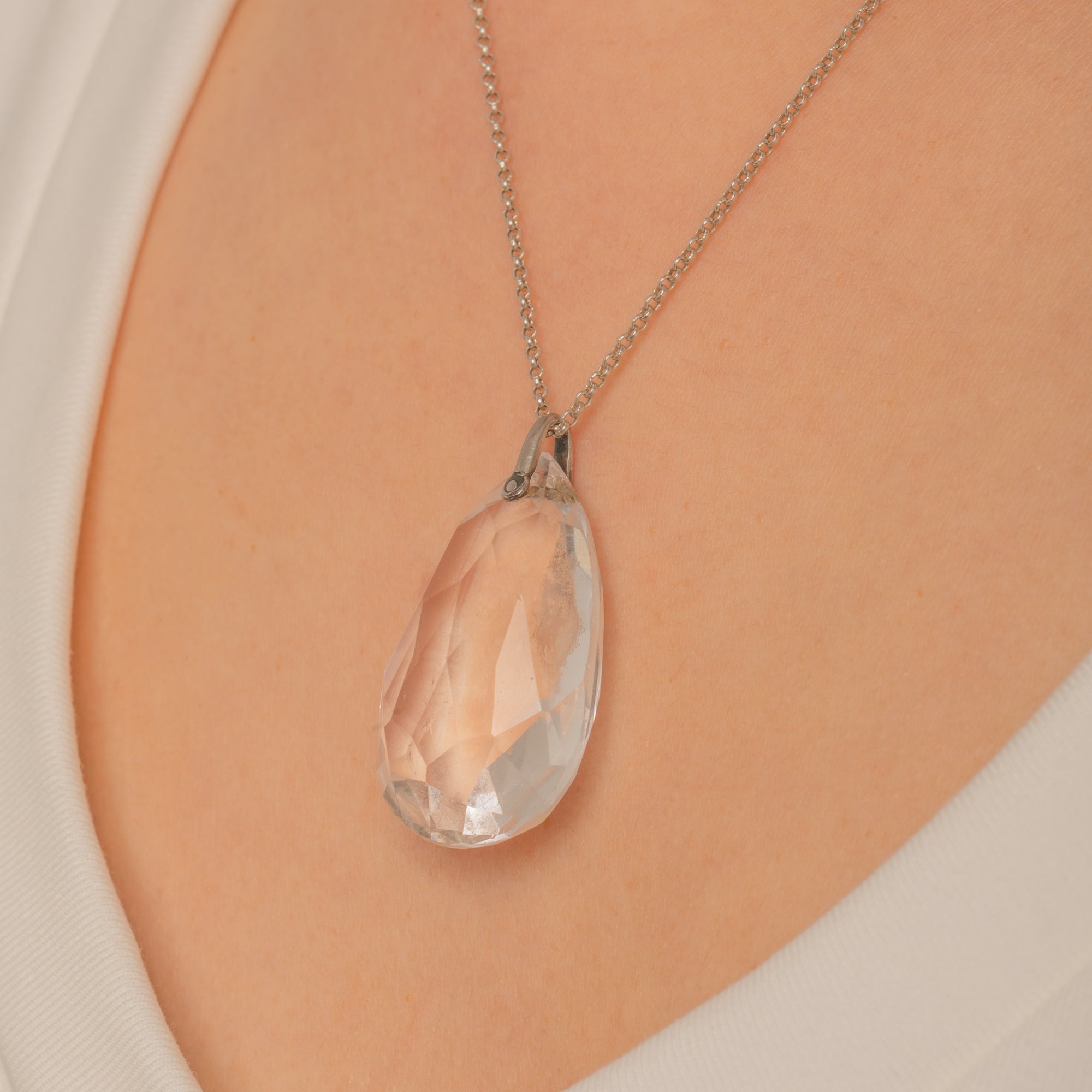 A luminous Rock Crystal briolette takes centre stage in this sleek Art Deco pendant. The large, sculptural teardrop is intricately faceted to catch the light from every angle, its open, top-drilled construction capped with a simple Silver bail for a clean, modernist silhouette.