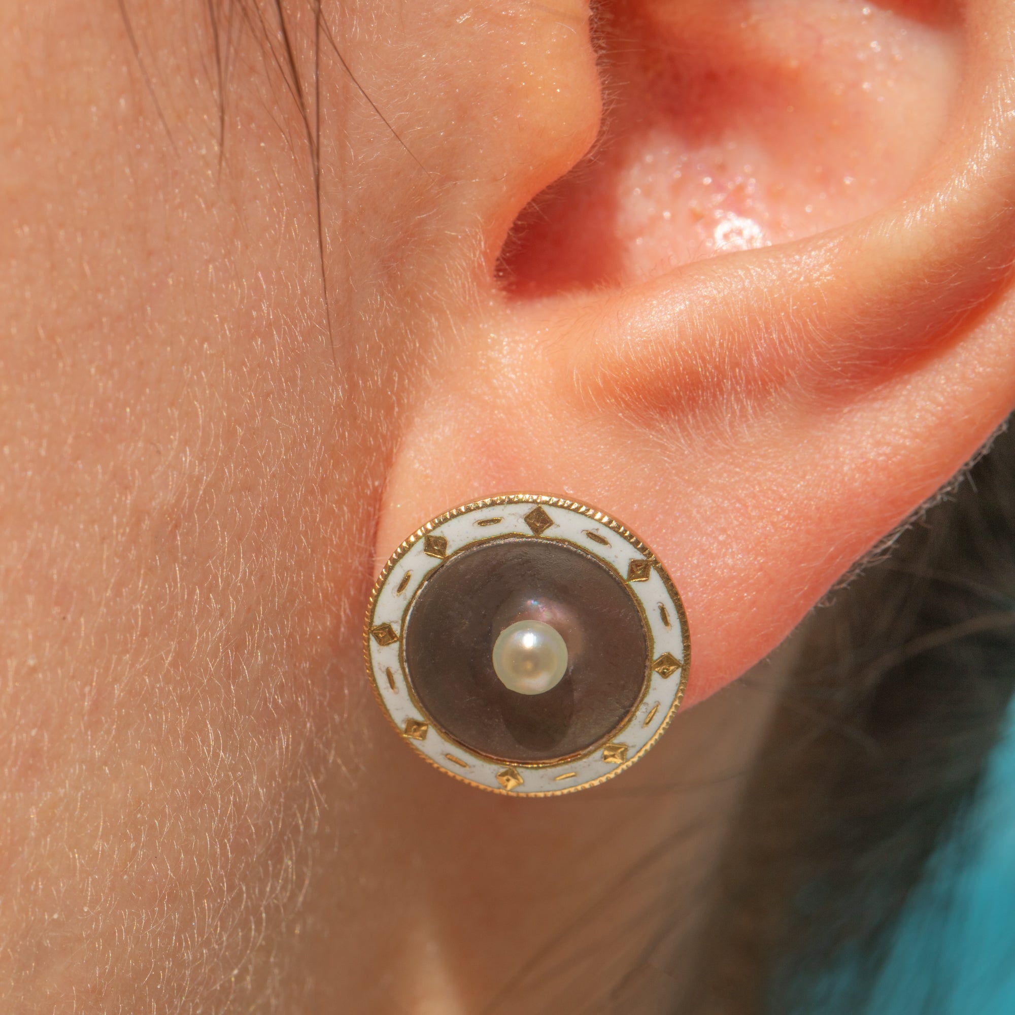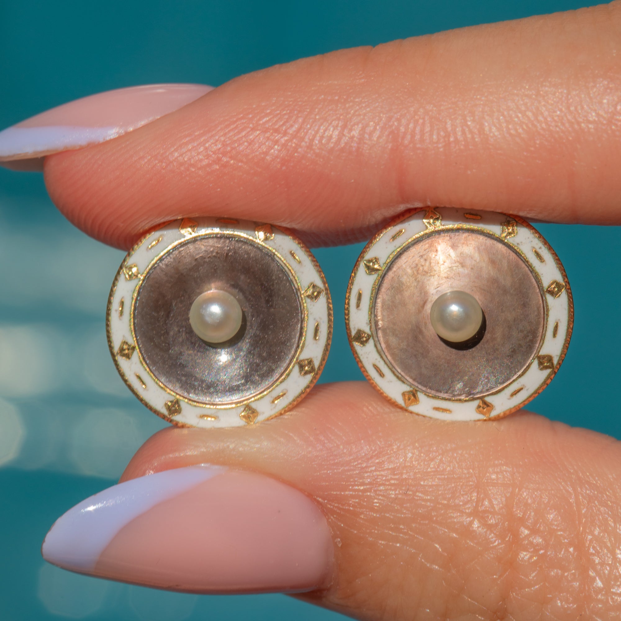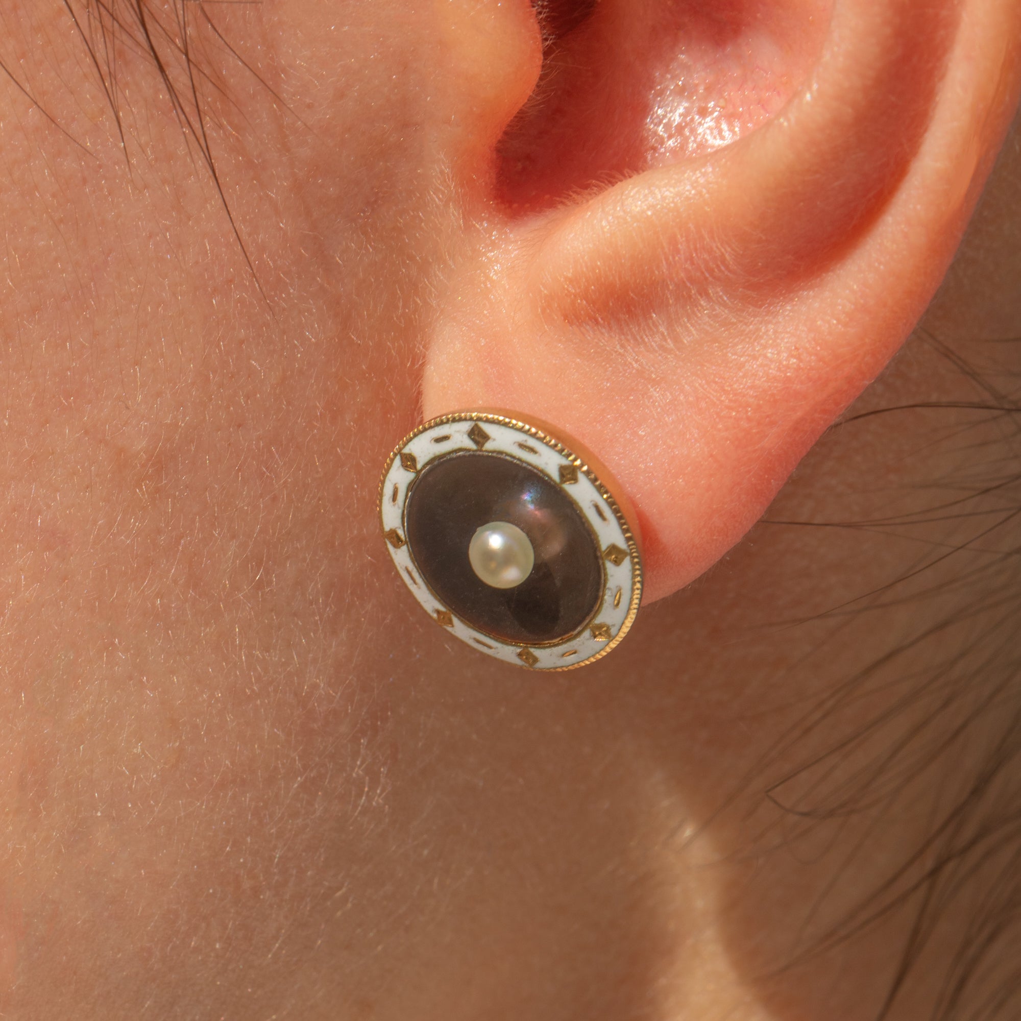 Crafted from buttery 18ct Gold, these round studs are adorned with a creamy Pearl, complemented beautifully by the iridescence of her surrounding shimmery lilac mother of Pearl. These antique studs are complete with a white Enamel border encircling the Pearl, with added Gold detail providing a wonderful texture.