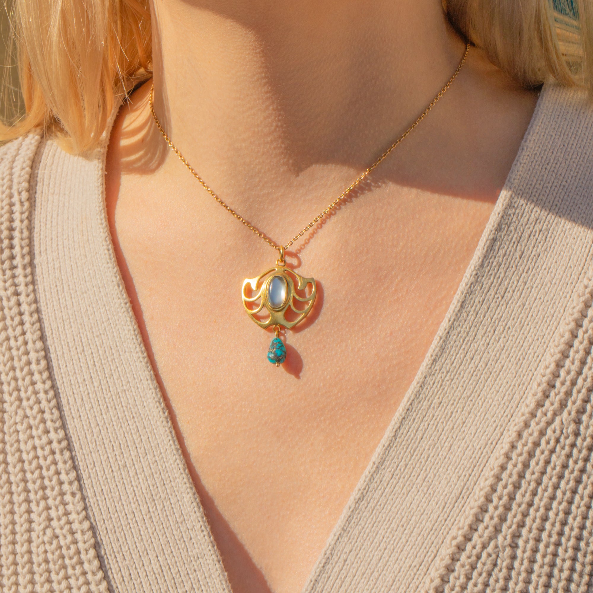 This 15ct Gold pendant takes on a classic Art Nouveau form, with fluid lines and an unmistakable silhouette. We love the choice of gemstones on this Art Nouveau pendant, with a glowing cabochon-cut Moonstone and a vivid Turquoise gemstone boasting its natural matrix!