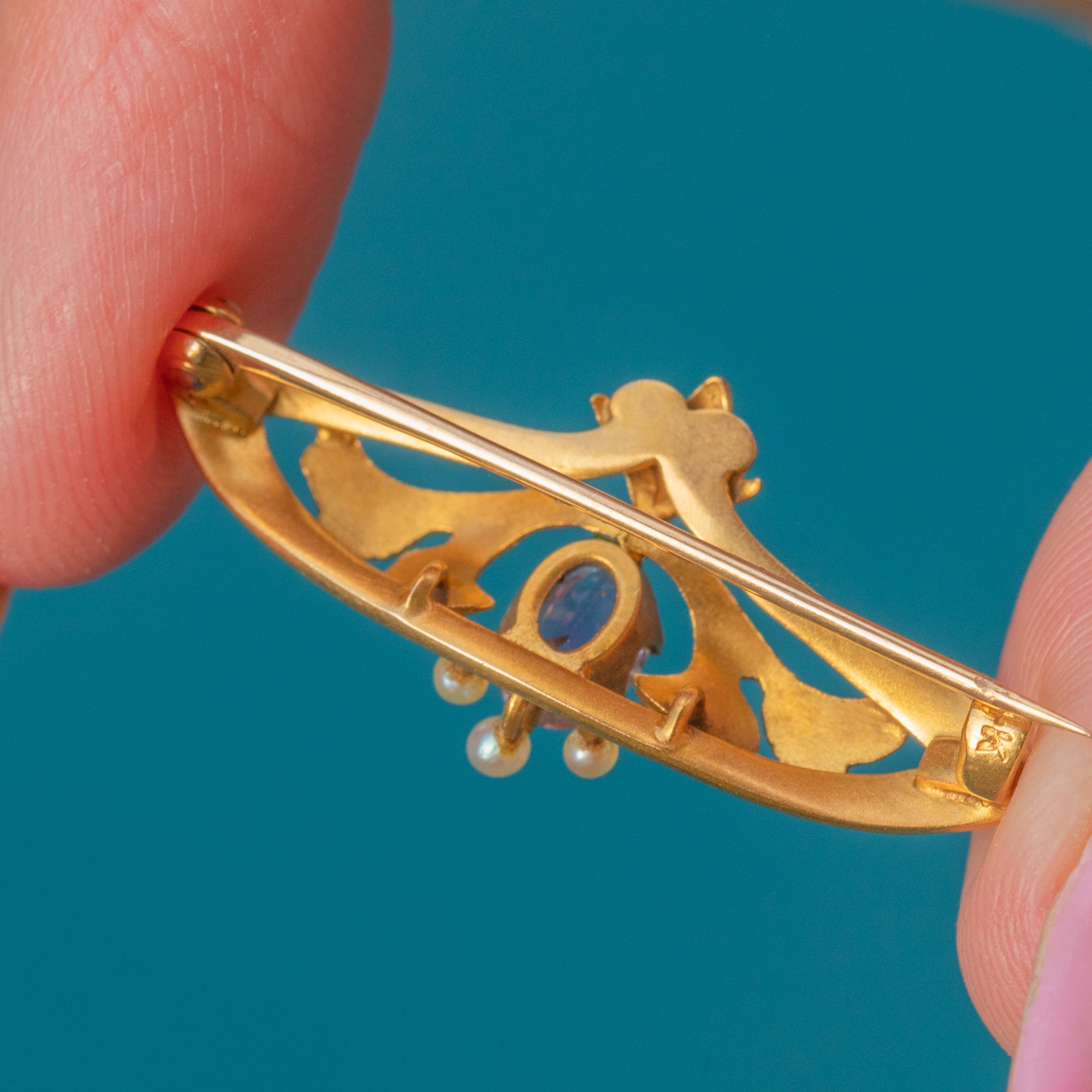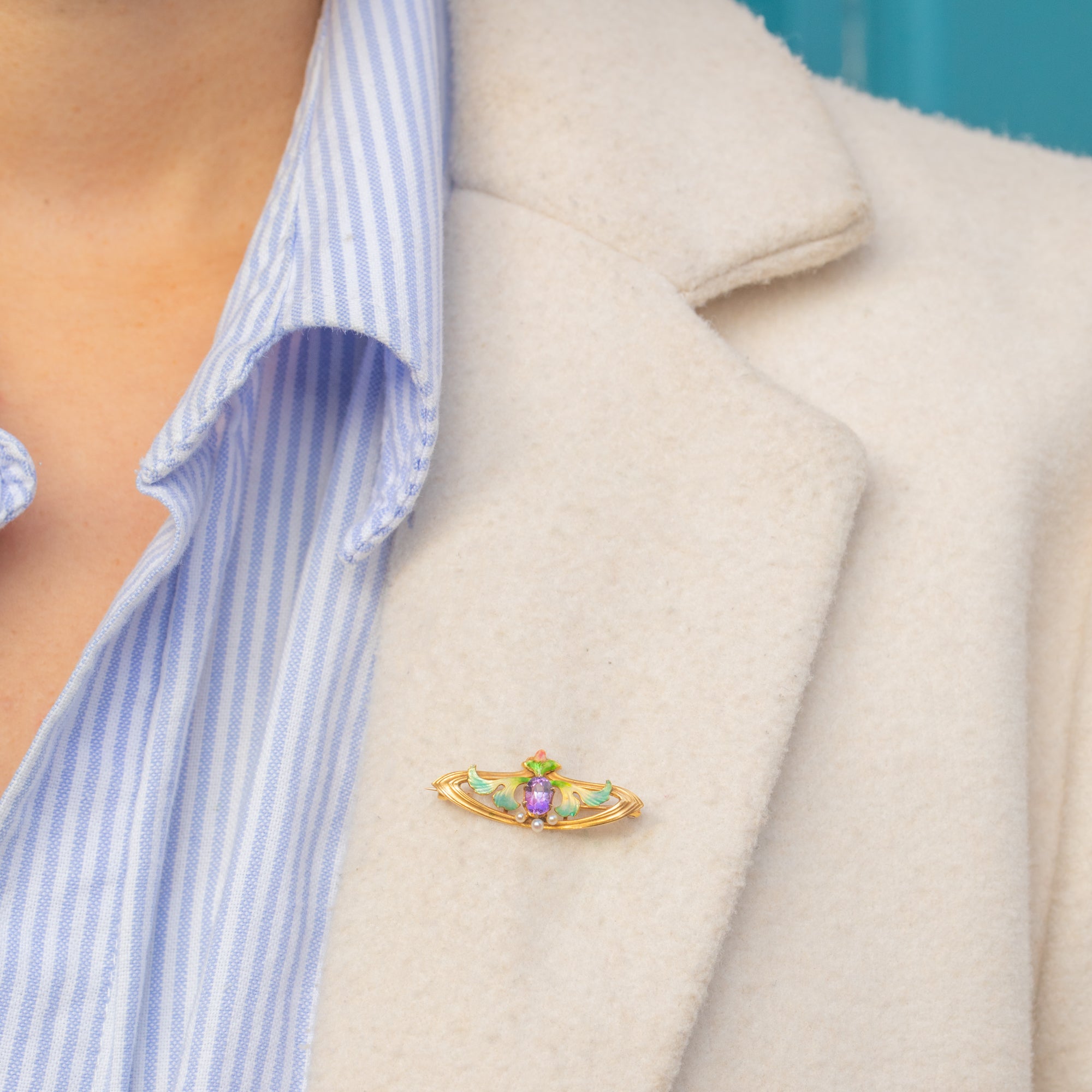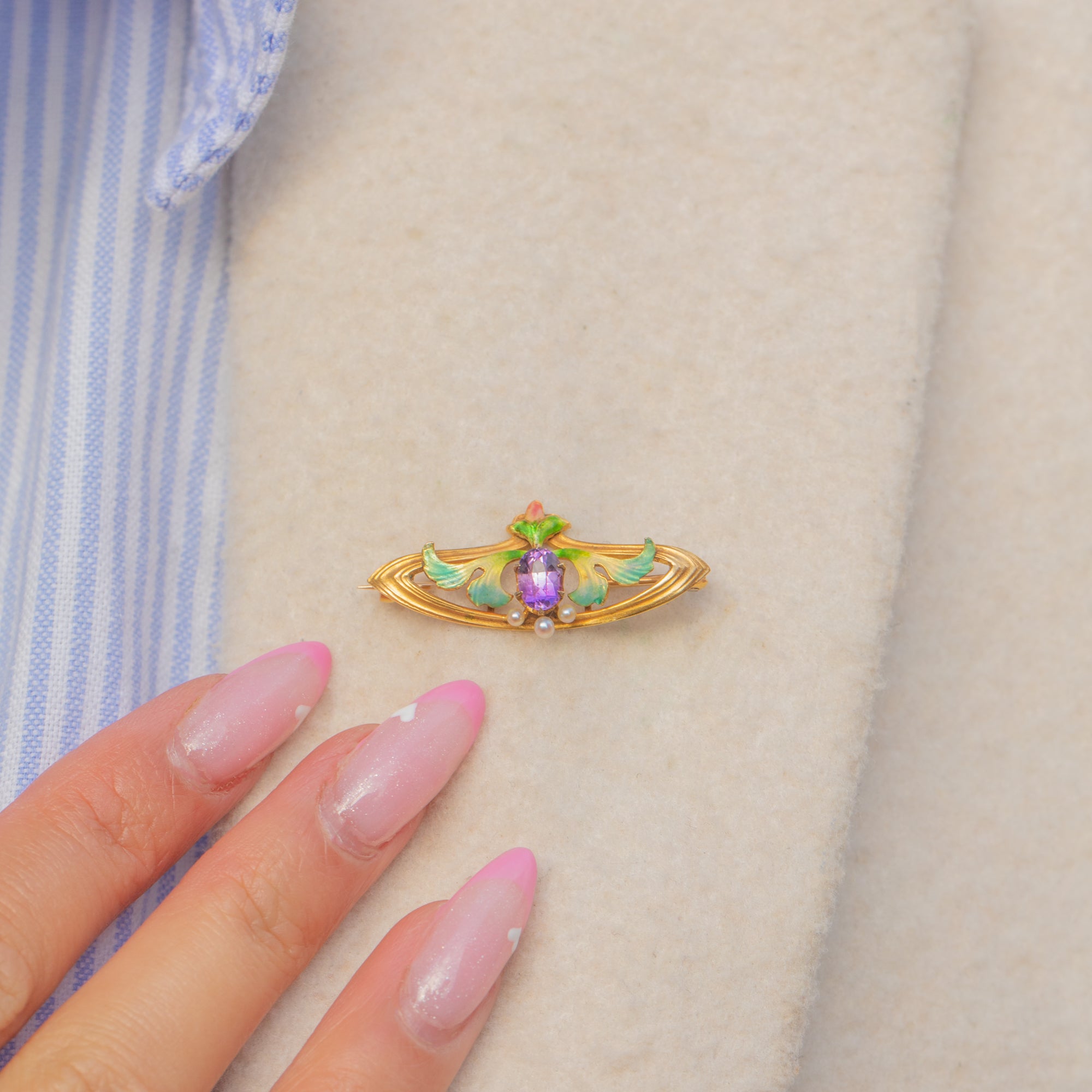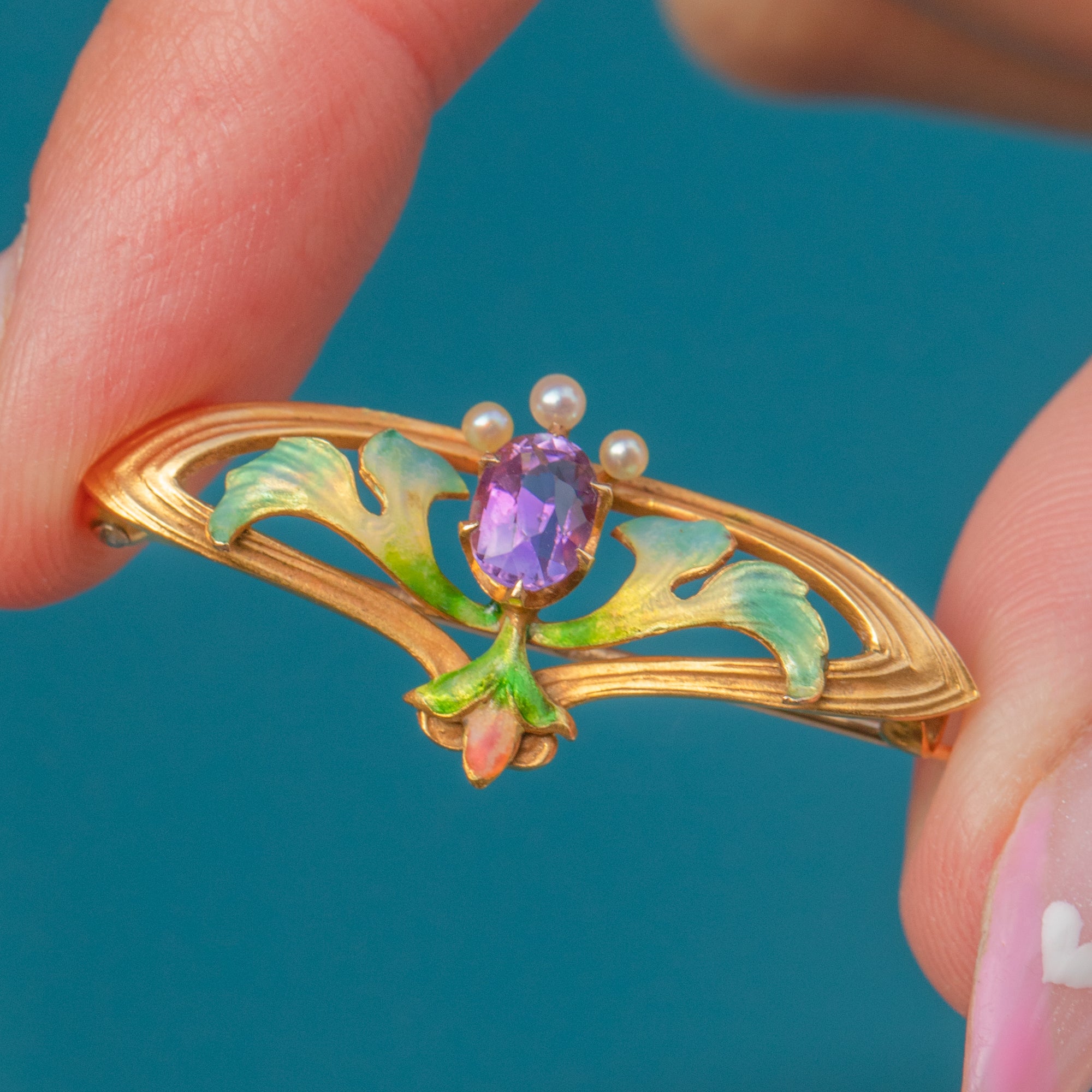 This stunning Art Nouveau floral brooch is crafted in solid 18ct Gold and decorated with exquisite Enamel in soft shades of green, blue and rose. At its centre glows a rich violet 0.40ct Amethyst, crowned by lustrous Seed Pearls that form the flower’s delicate stamens.