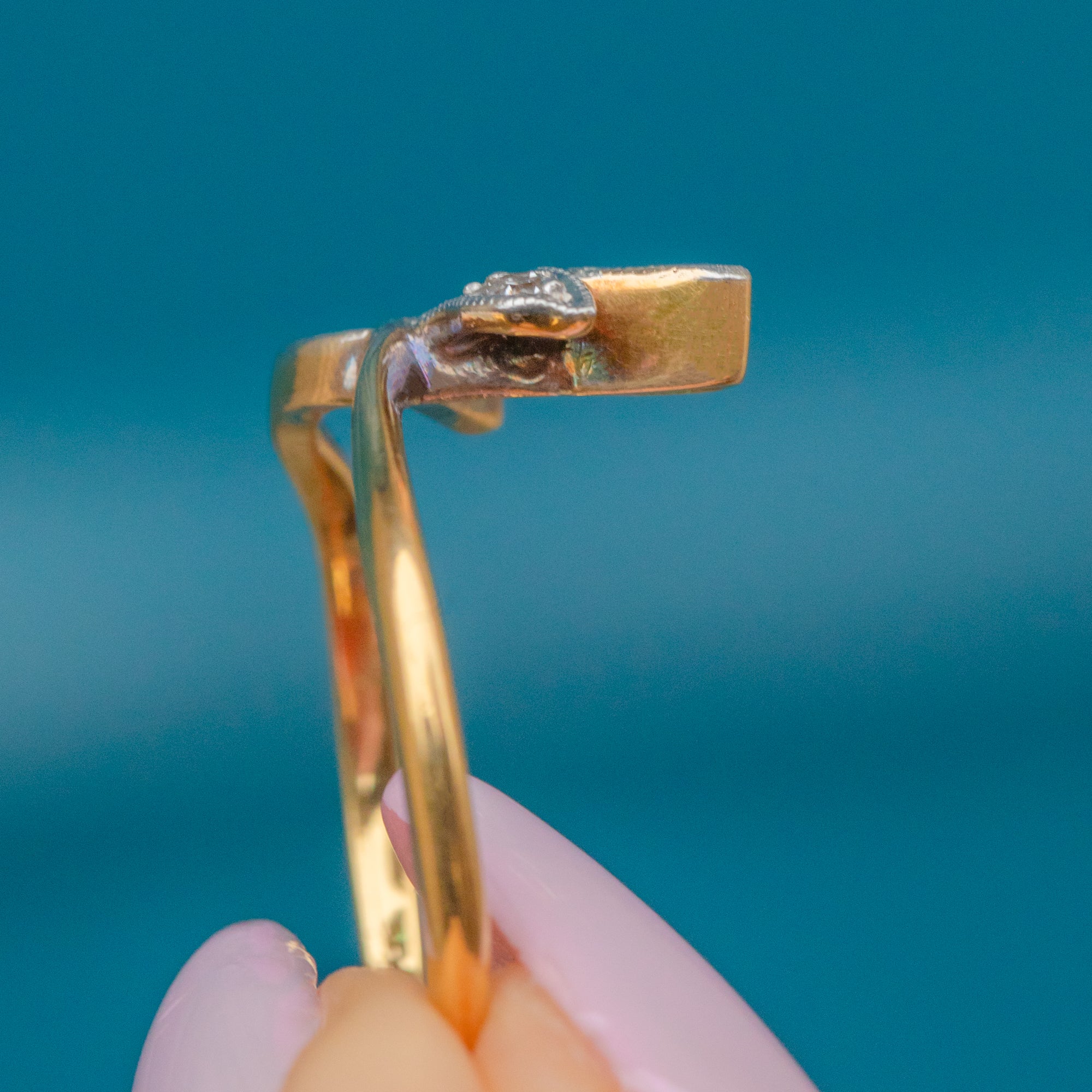 A delicate Art Nouveau ring designed as a stylised flower, set with a vivid green Emerald and twinkling rose-cut Diamonds. The asymmetric, organic lines of the petals and the flowing 18ct Gold band perfectly capture the graceful naturalism of the Art Nouveau era.