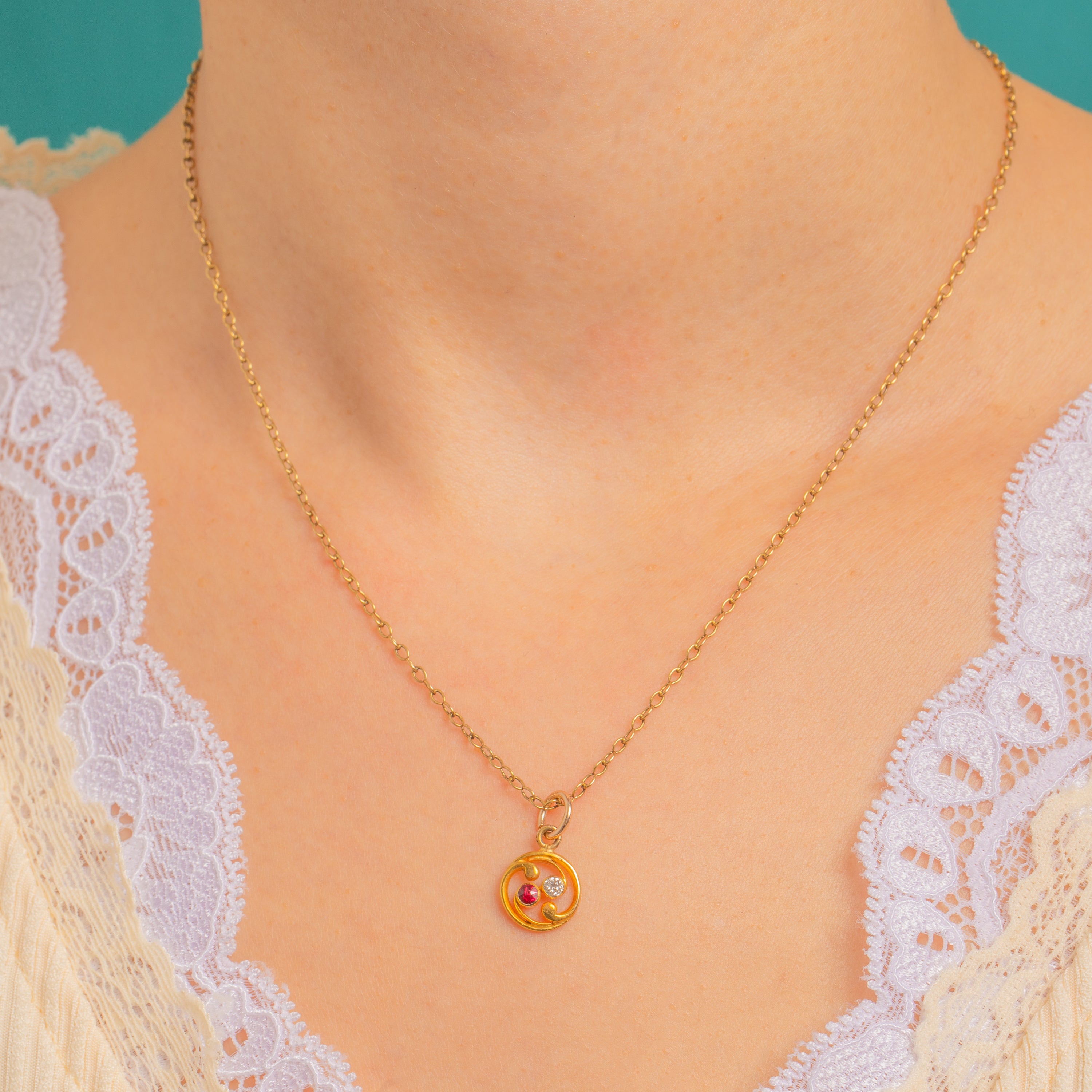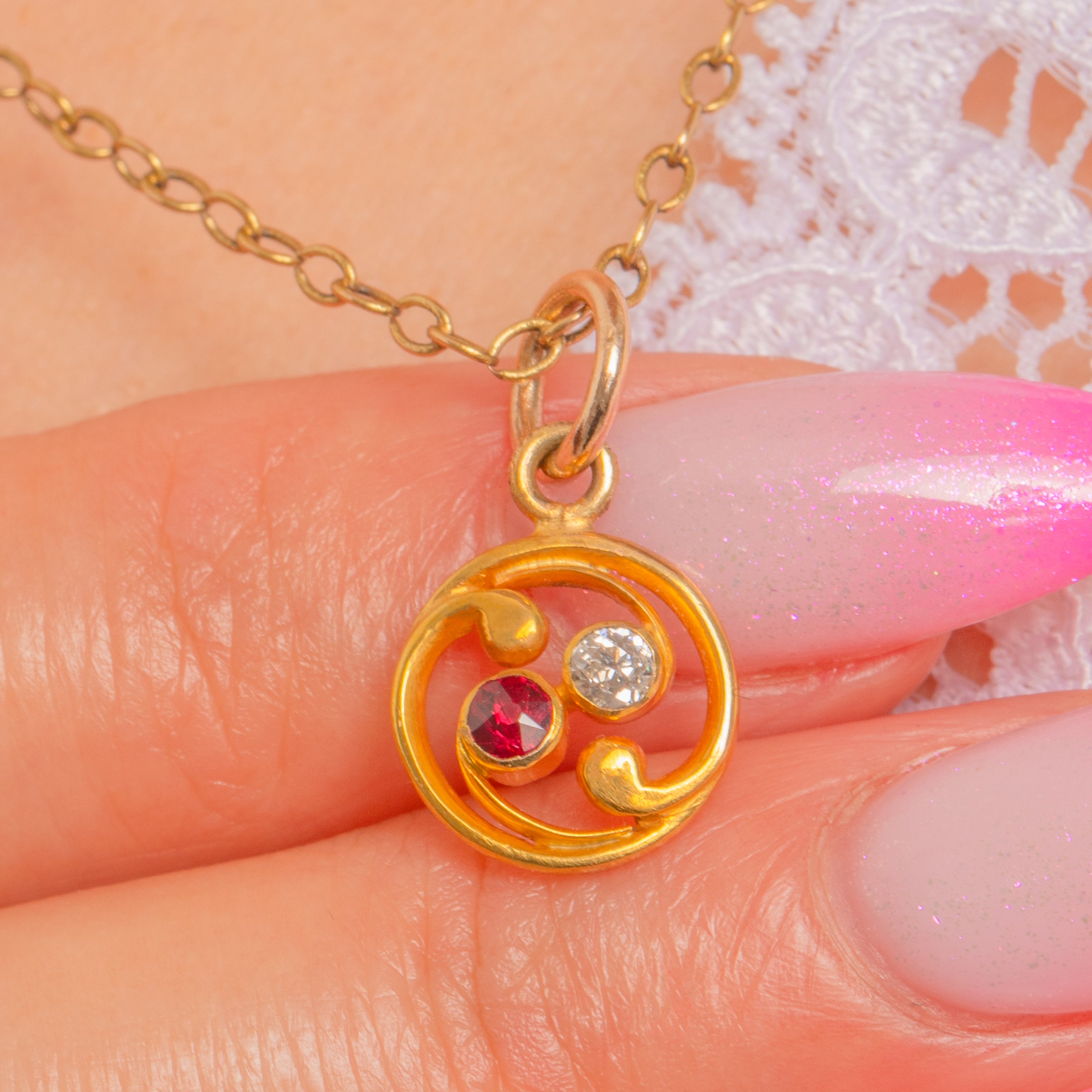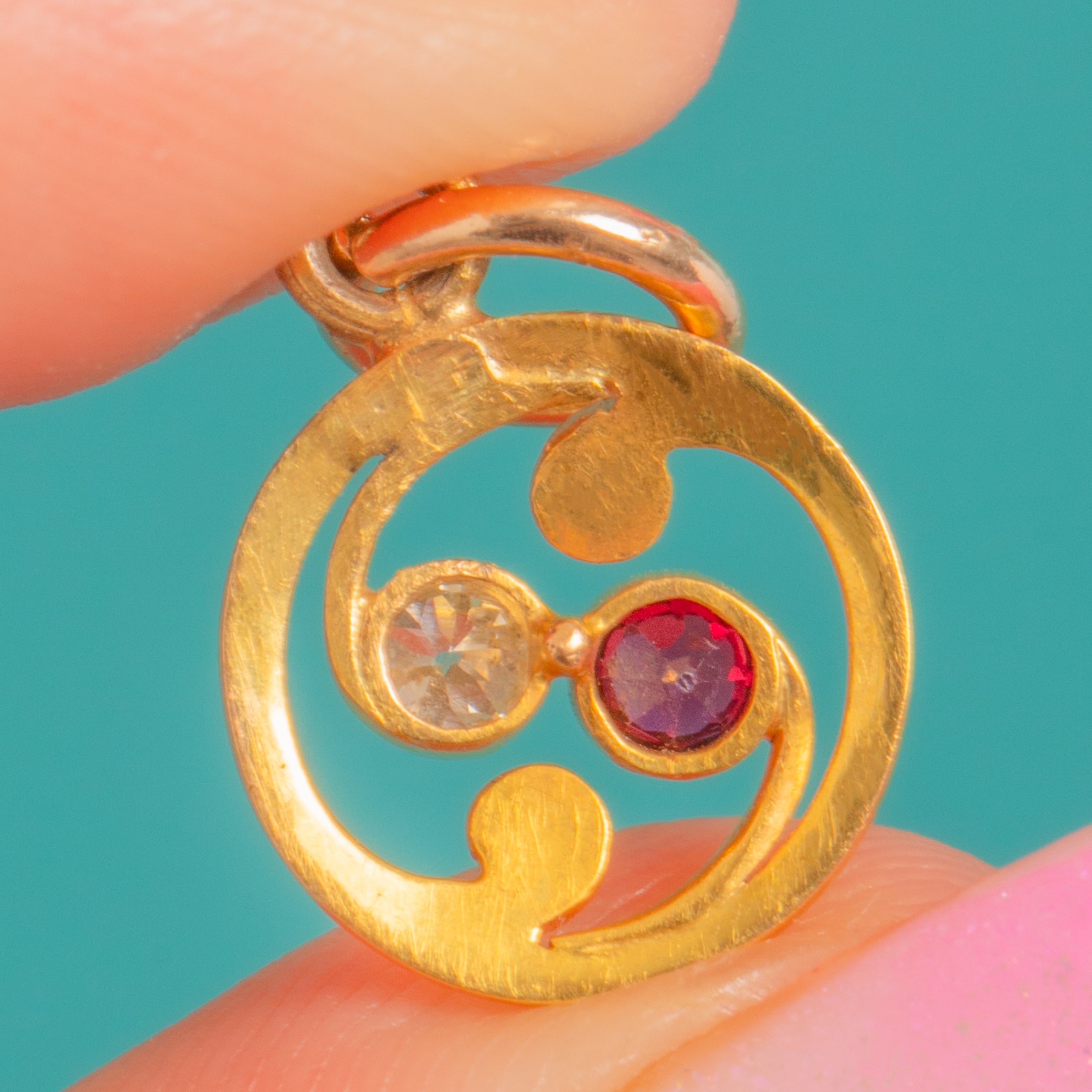 A dainty Art Nouveau treasure, this petite swirl charm is crafted in rich 18ct Gold and set with a poised duet of Ruby and Diamond. The openwork roundel flows with sinuous scrolls, drawing the eye to the two collet-set gems nestled together—one a deep, romantic Ruby and the other a lively, scintiallting Diamond.