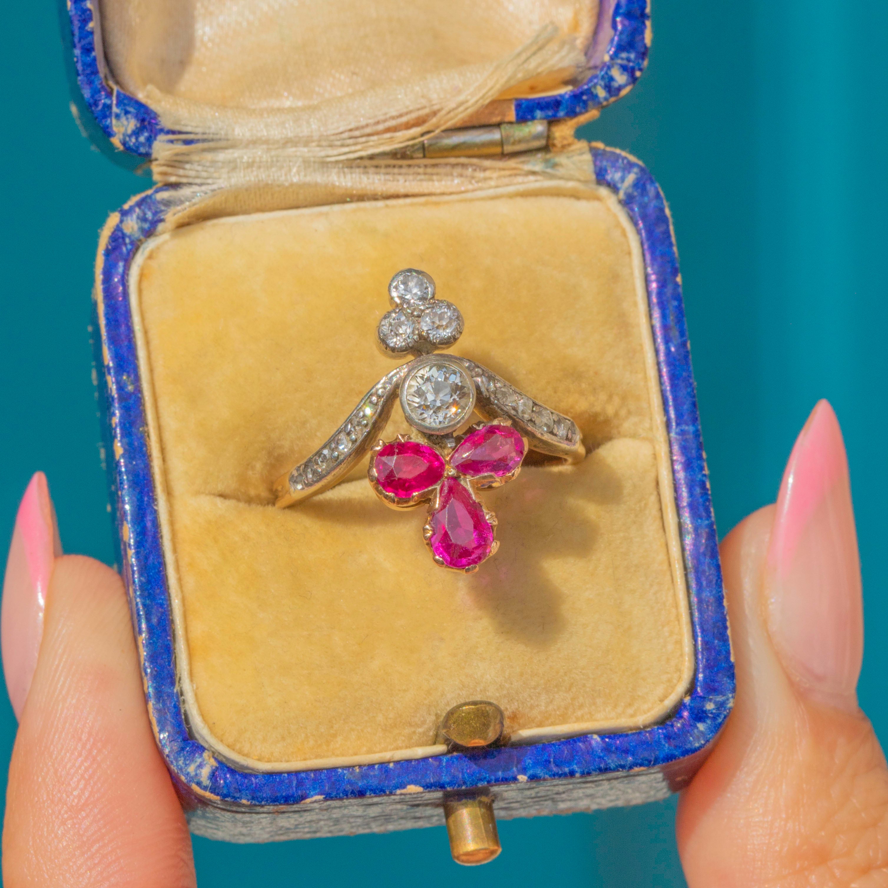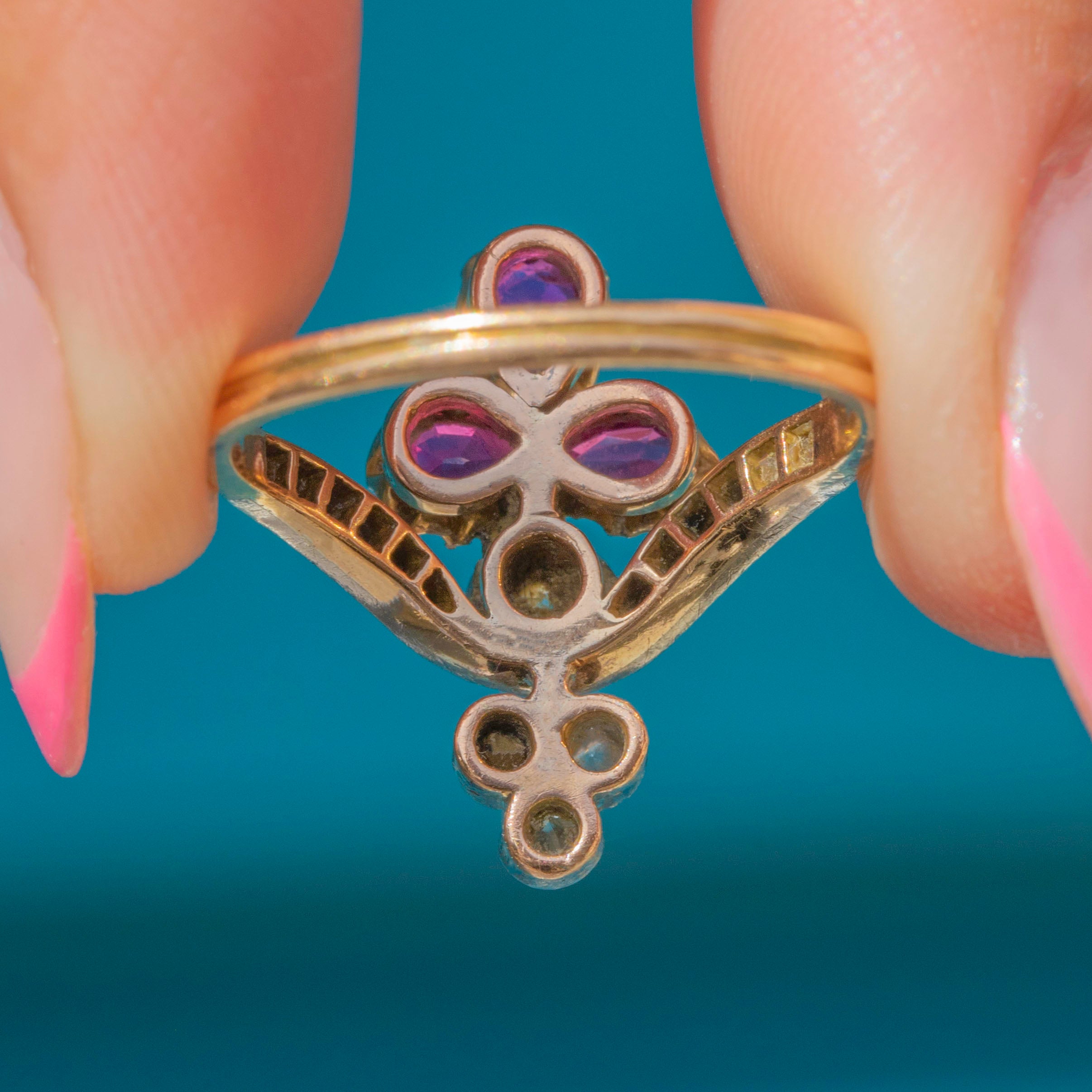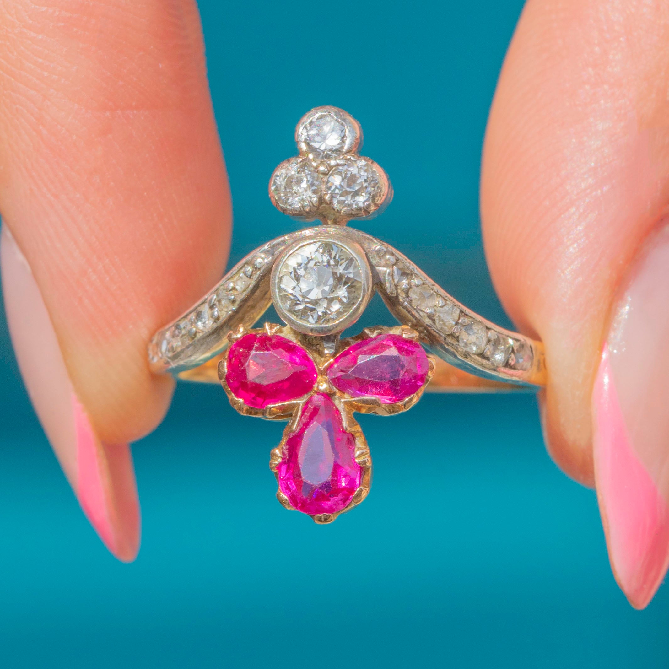 This divine Art Nouveau 18ct Gold Ruby & Diamond tiara ring is a real treasure, crafted from 18ct rosy-warm Gold with elegant curves and intricate detailing. At her heart sits a stunning large Diamond, catching the light wonderfully and flanked by dainty rose-cut Diamonds. They are complemented beautifully by three juicy fuchsia Rubies, giving this antique ring a wonderful vibrancy.