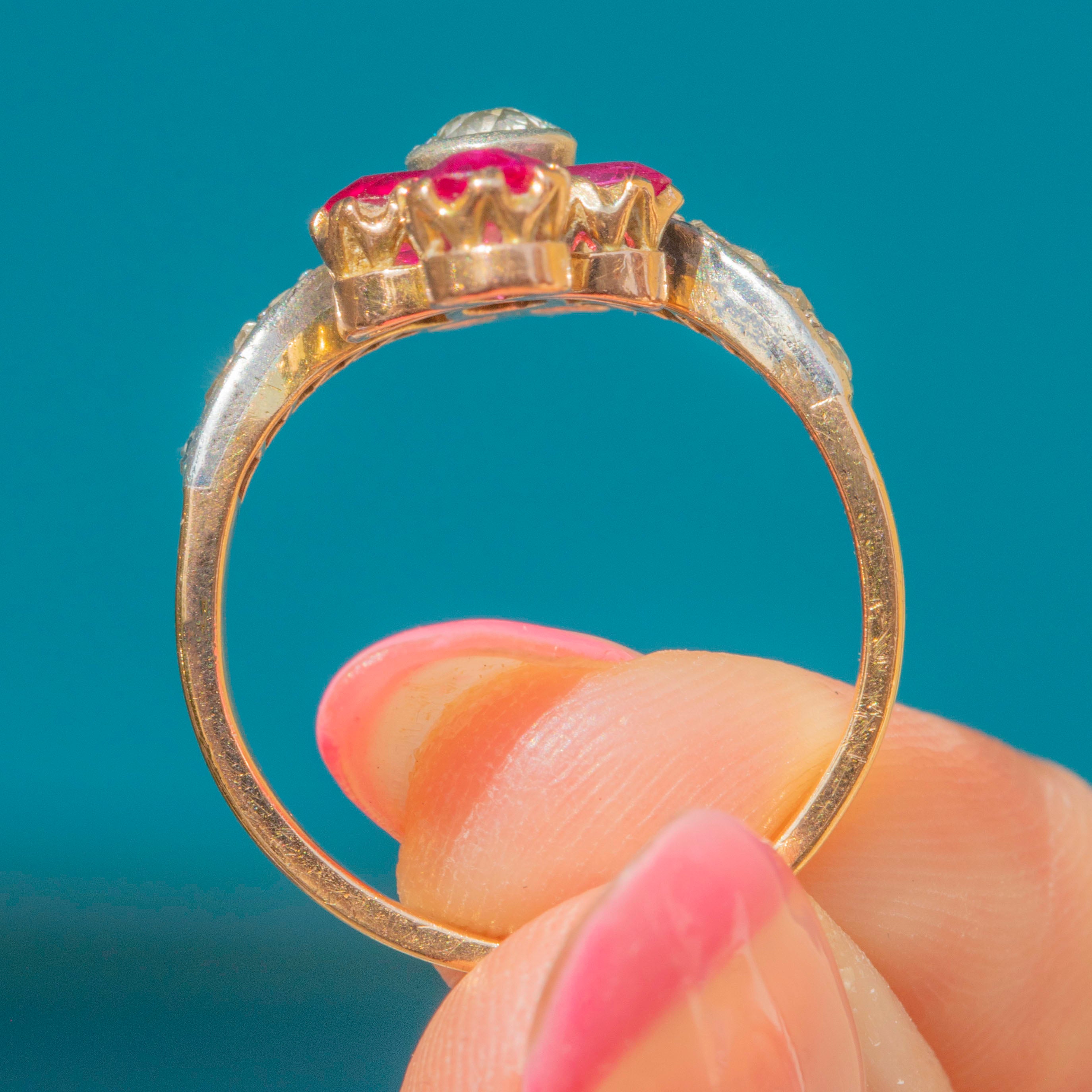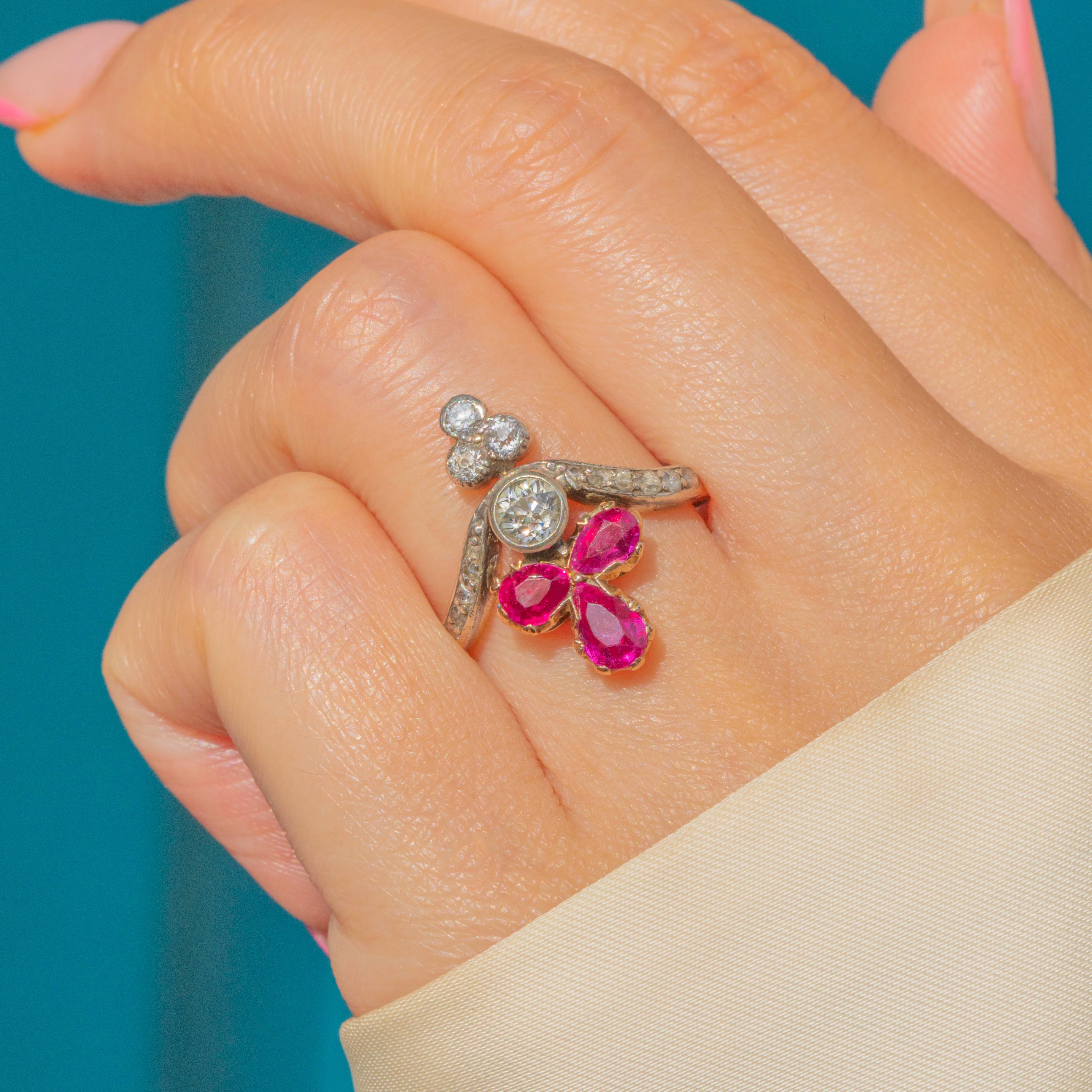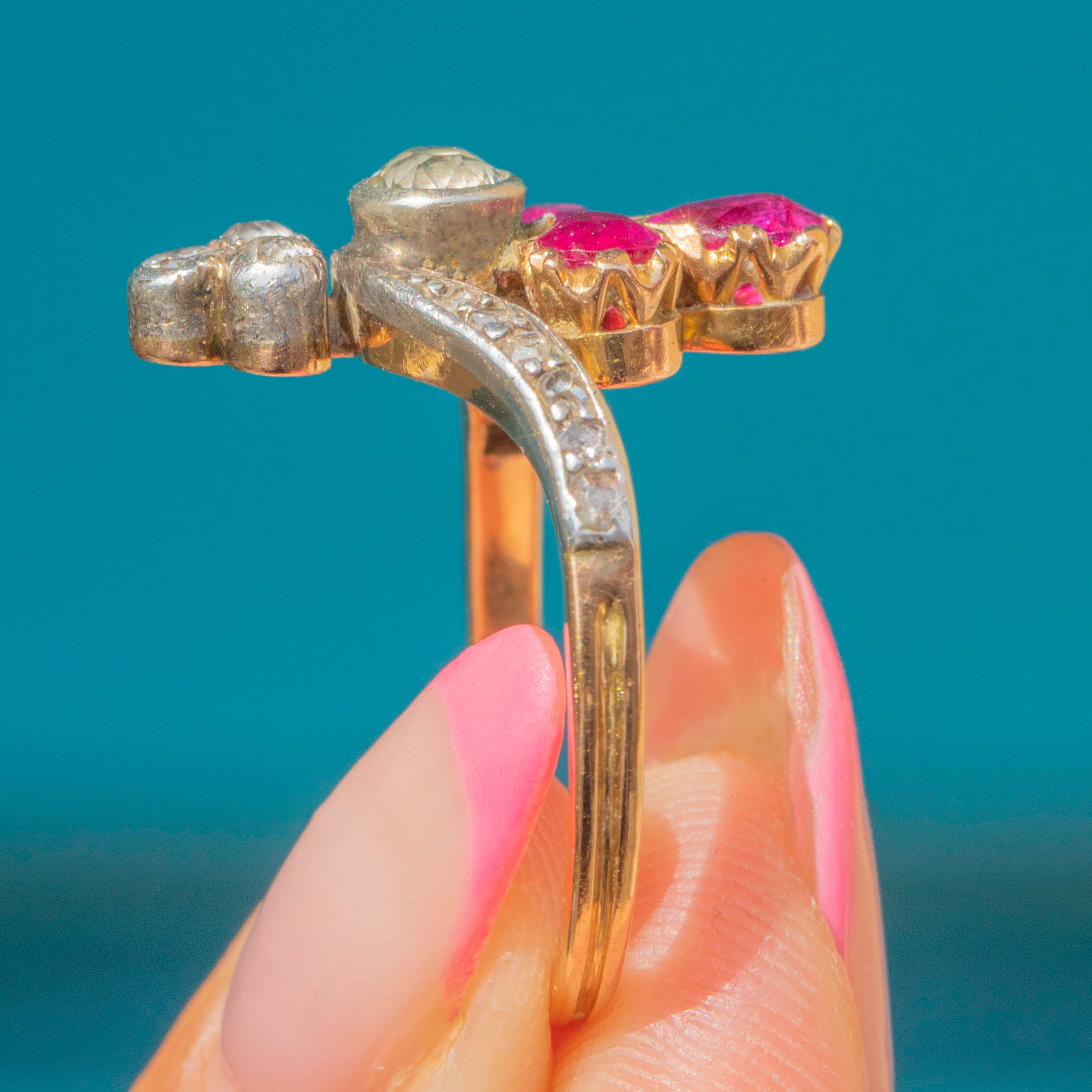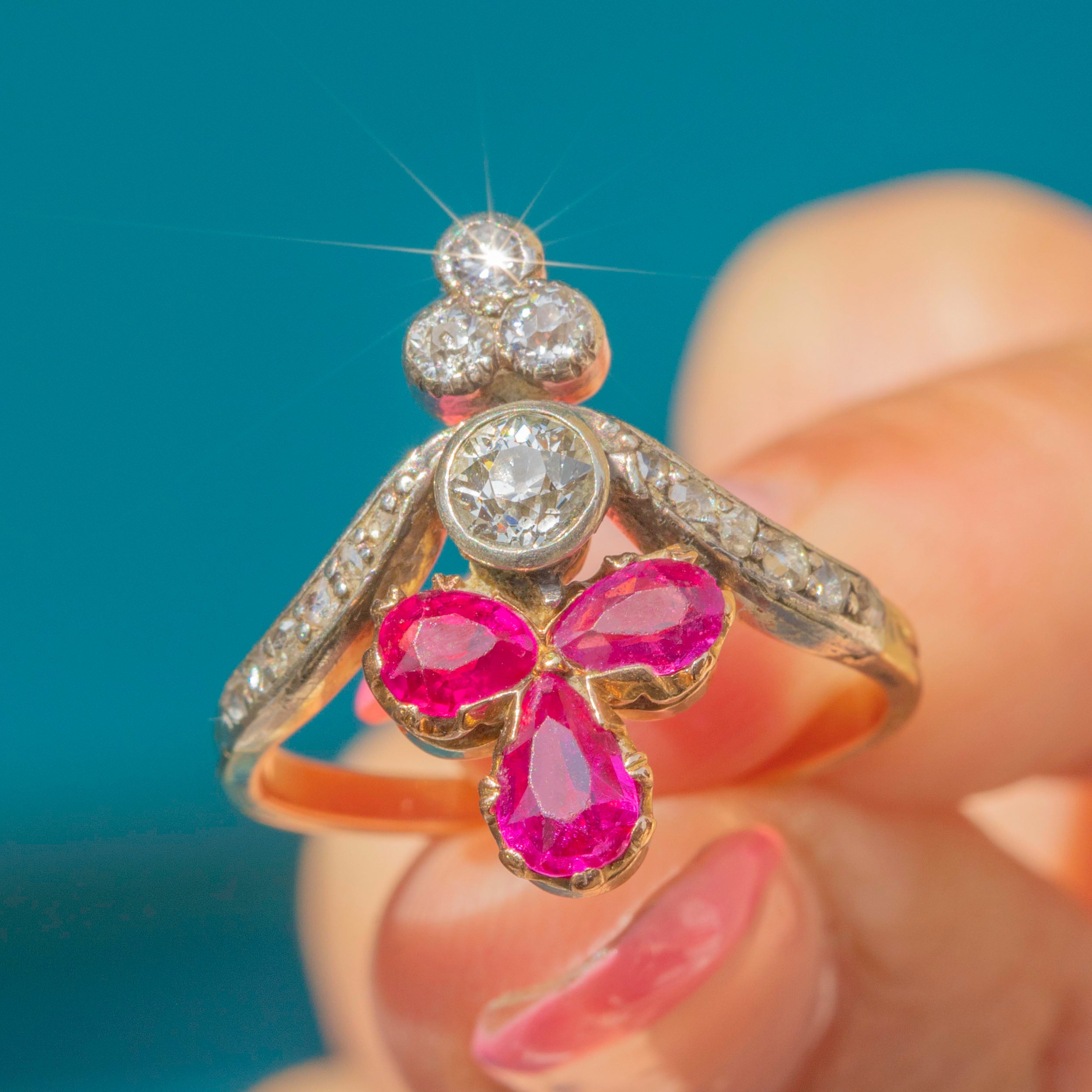 This divine Art Nouveau 18ct Gold Ruby & Diamond tiara ring is a real treasure, crafted from 18ct rosy-warm Gold with elegant curves and intricate detailing. At her heart sits a stunning large Diamond, catching the light wonderfully and flanked by dainty rose-cut Diamonds. They are complemented beautifully by three juicy fuchsia Rubies, giving this antique ring a wonderful vibrancy.