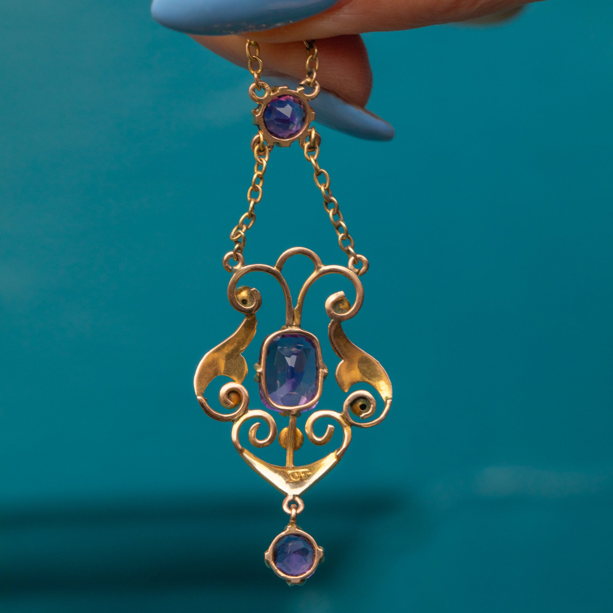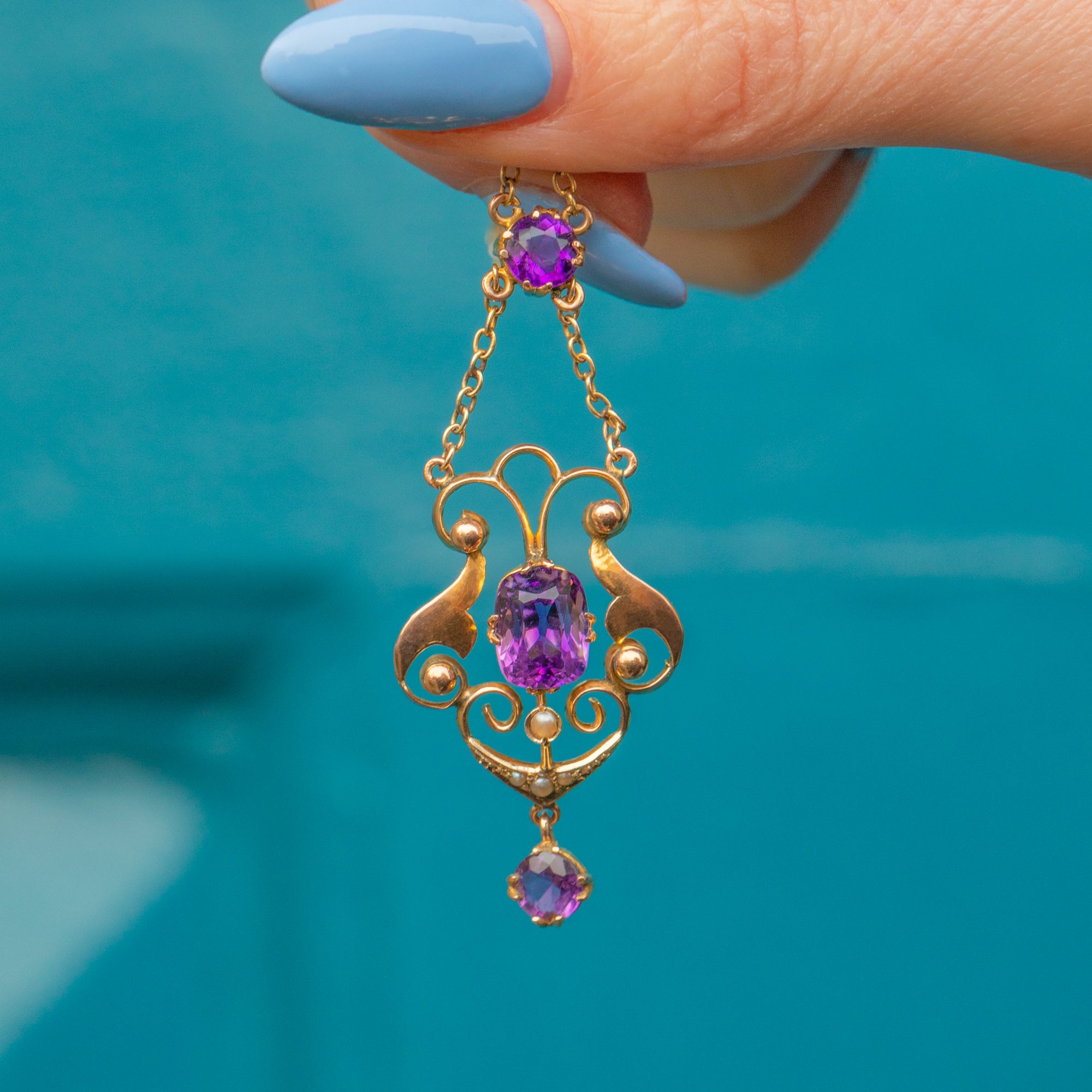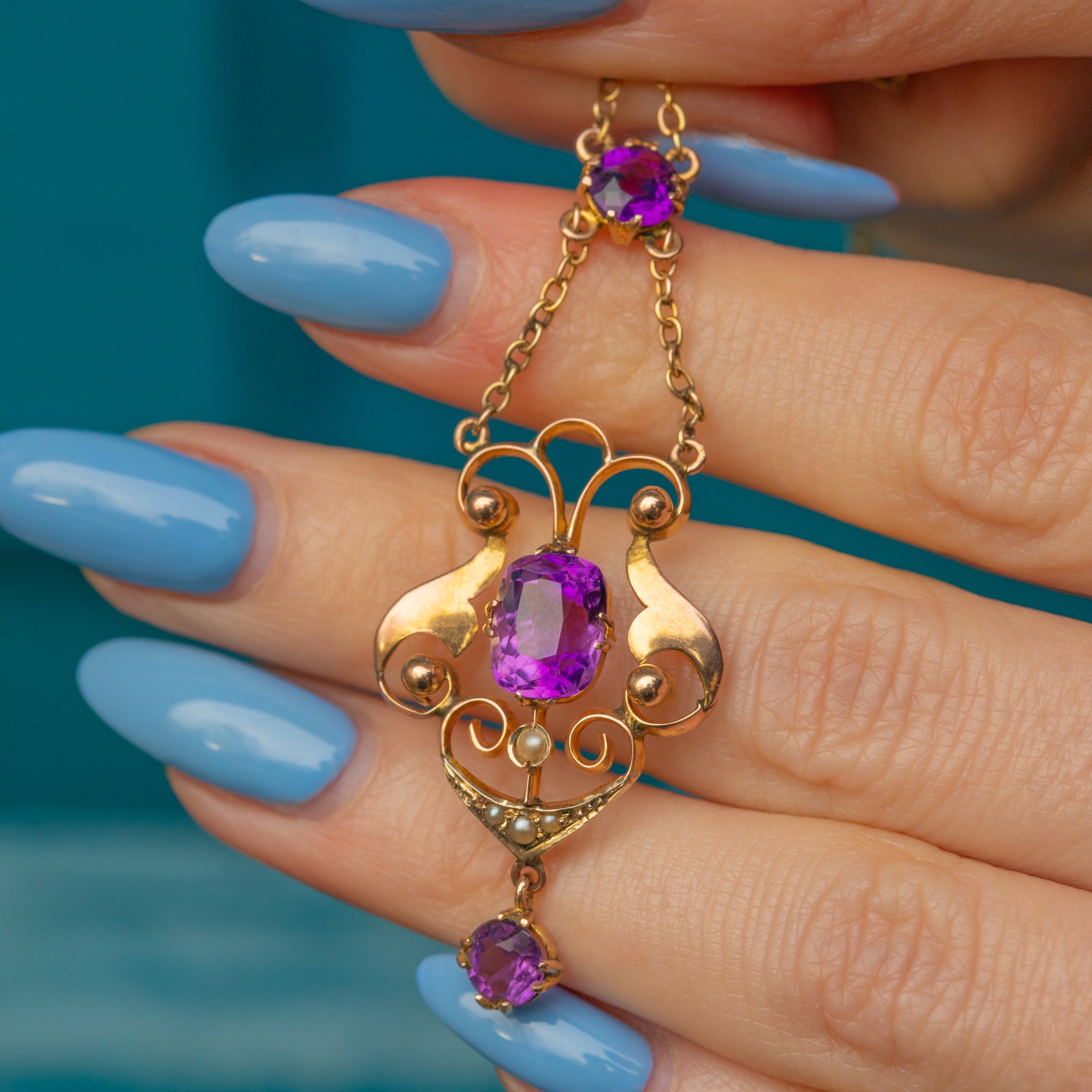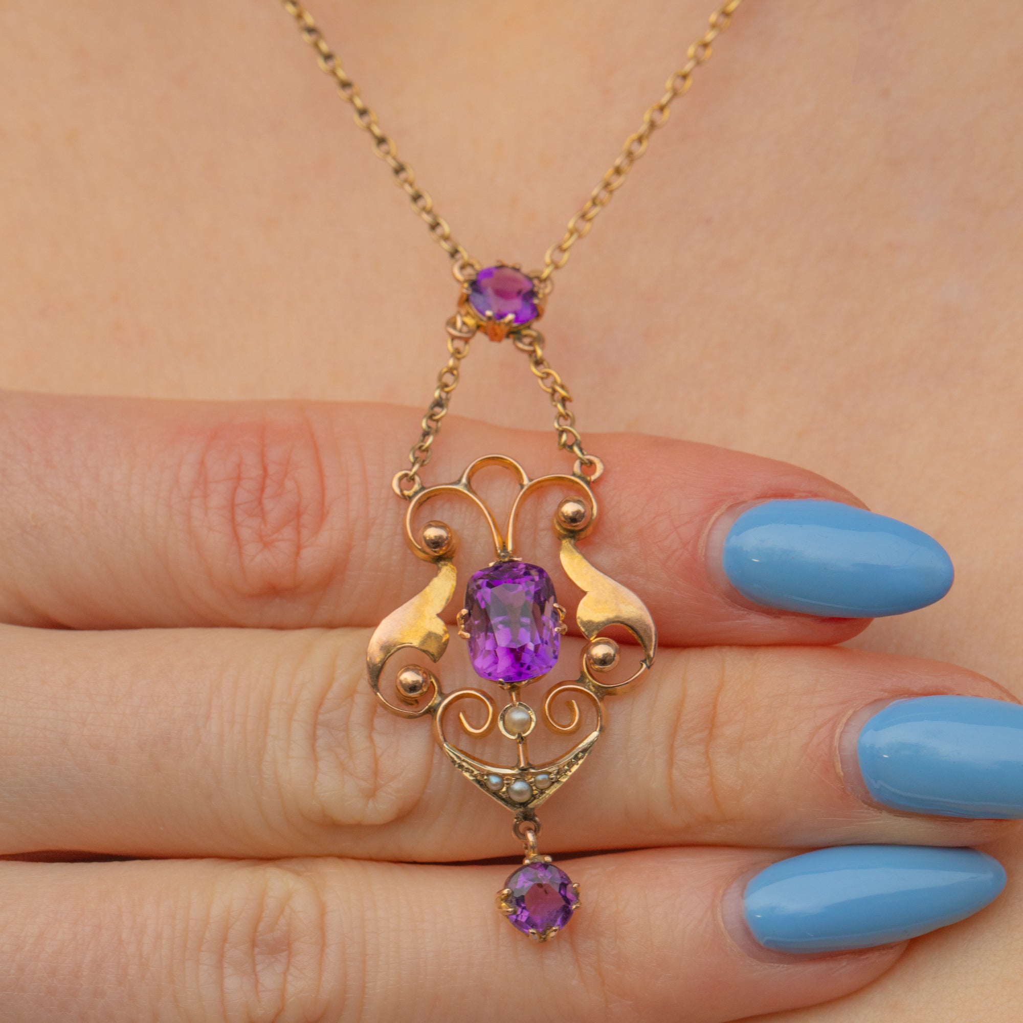 This Art Nouveau 9ct Gold Amethyst Pearl drop necklace is a wonderfully elegant piece to add to your collection.