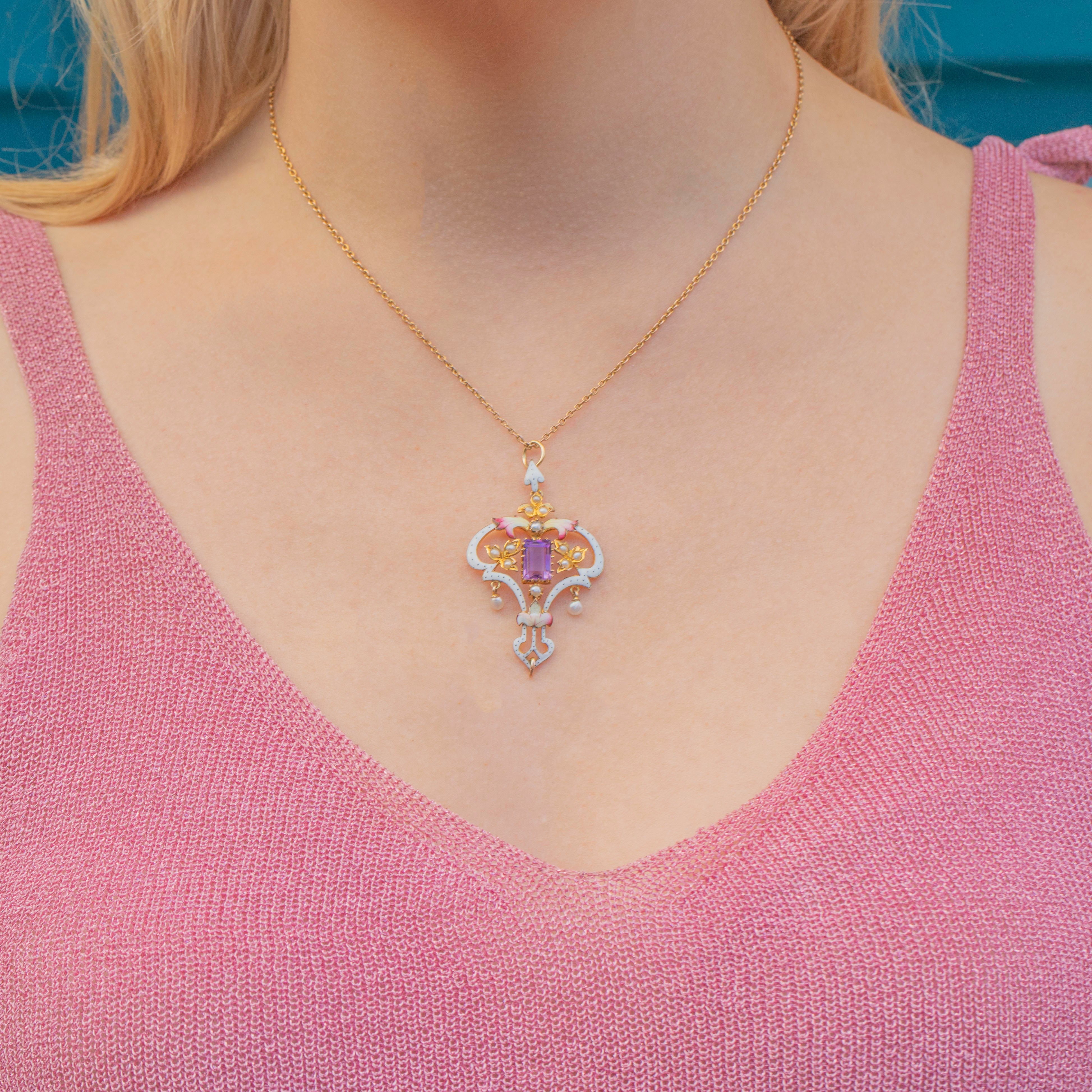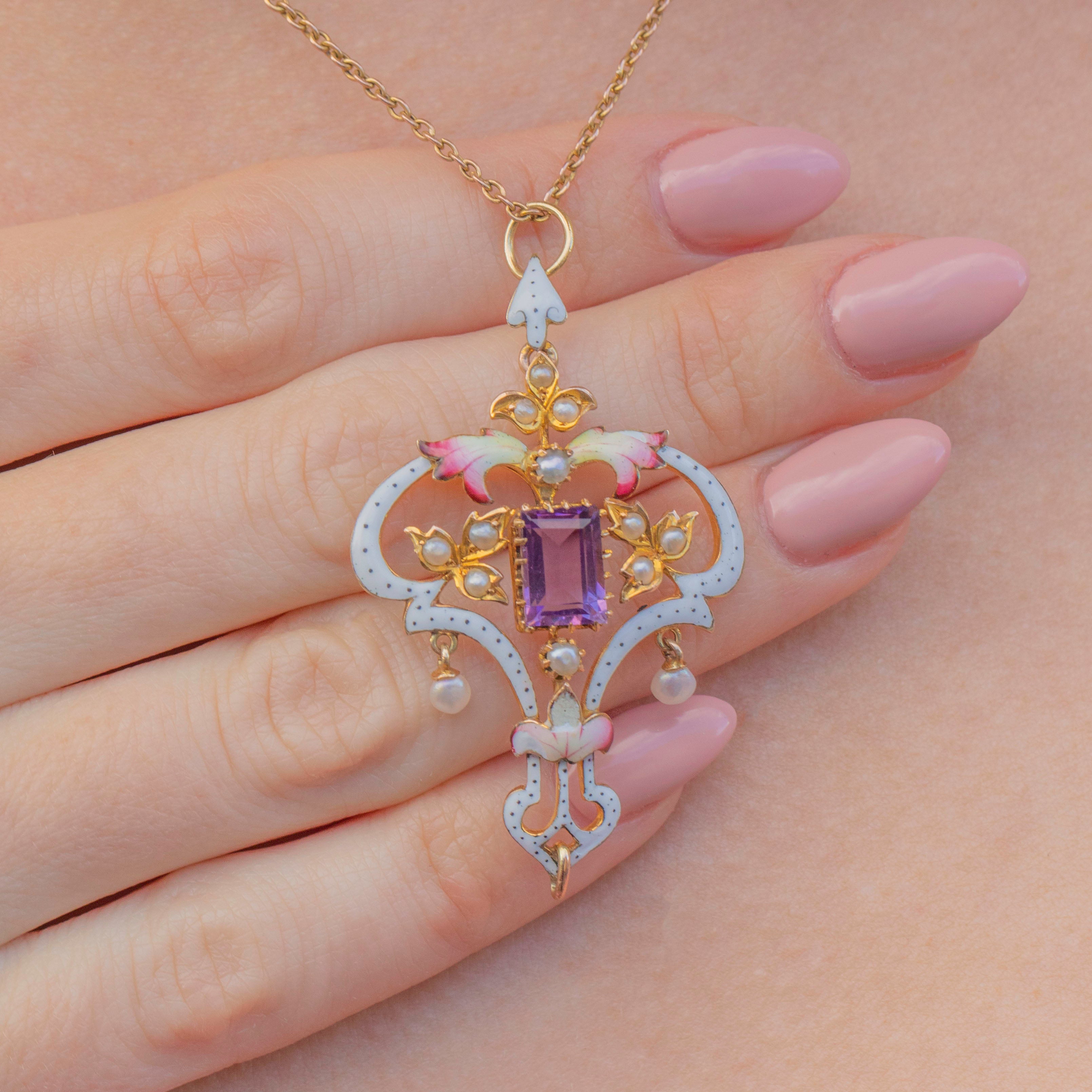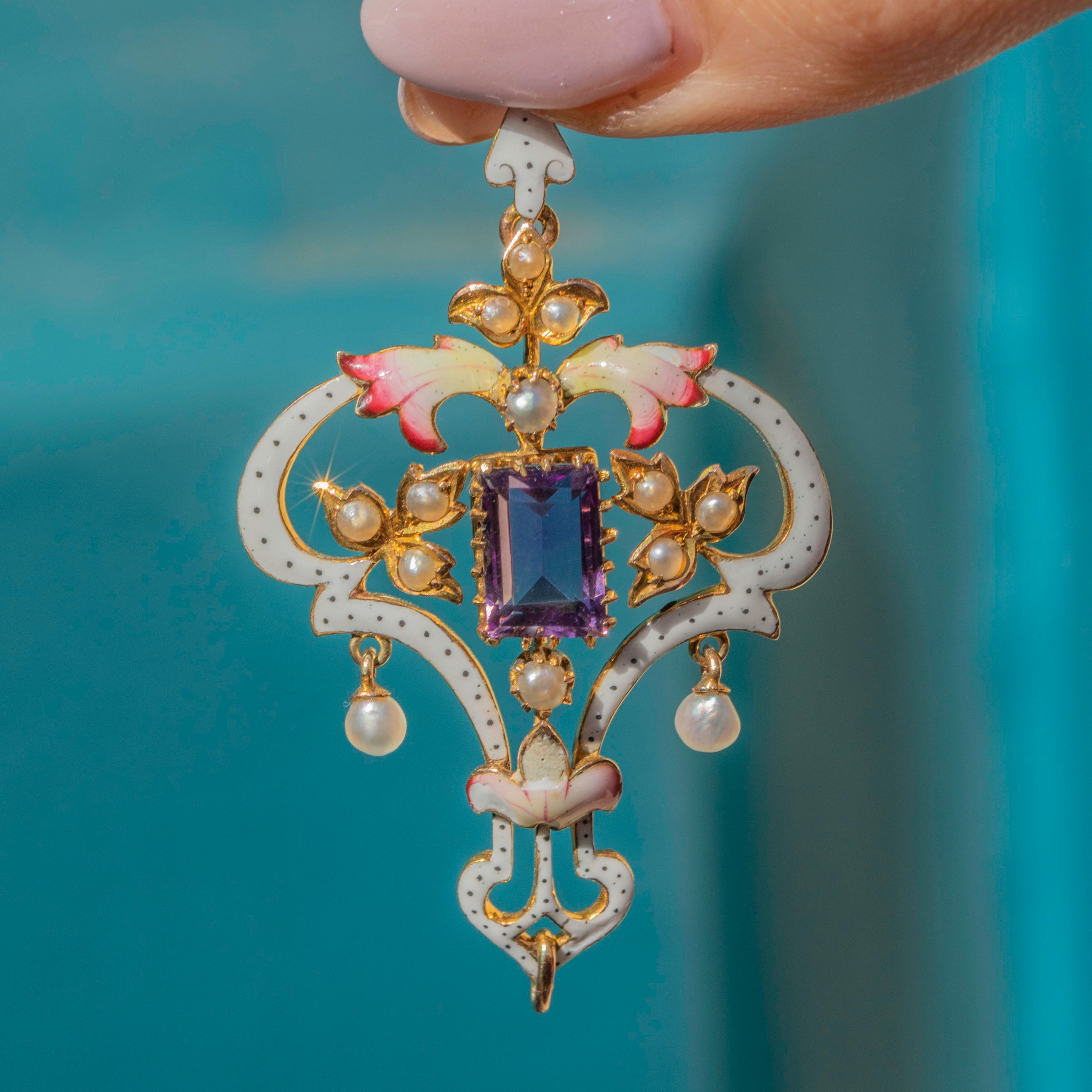 Straight out of a fairytale, this 9ct Gold Art Nouveau Enamel Amethyst & Pearl Lavalier pendant is home to a rectangular-cut lavender-hued Amethyst, Seed Pearls and glossy Enamel.
