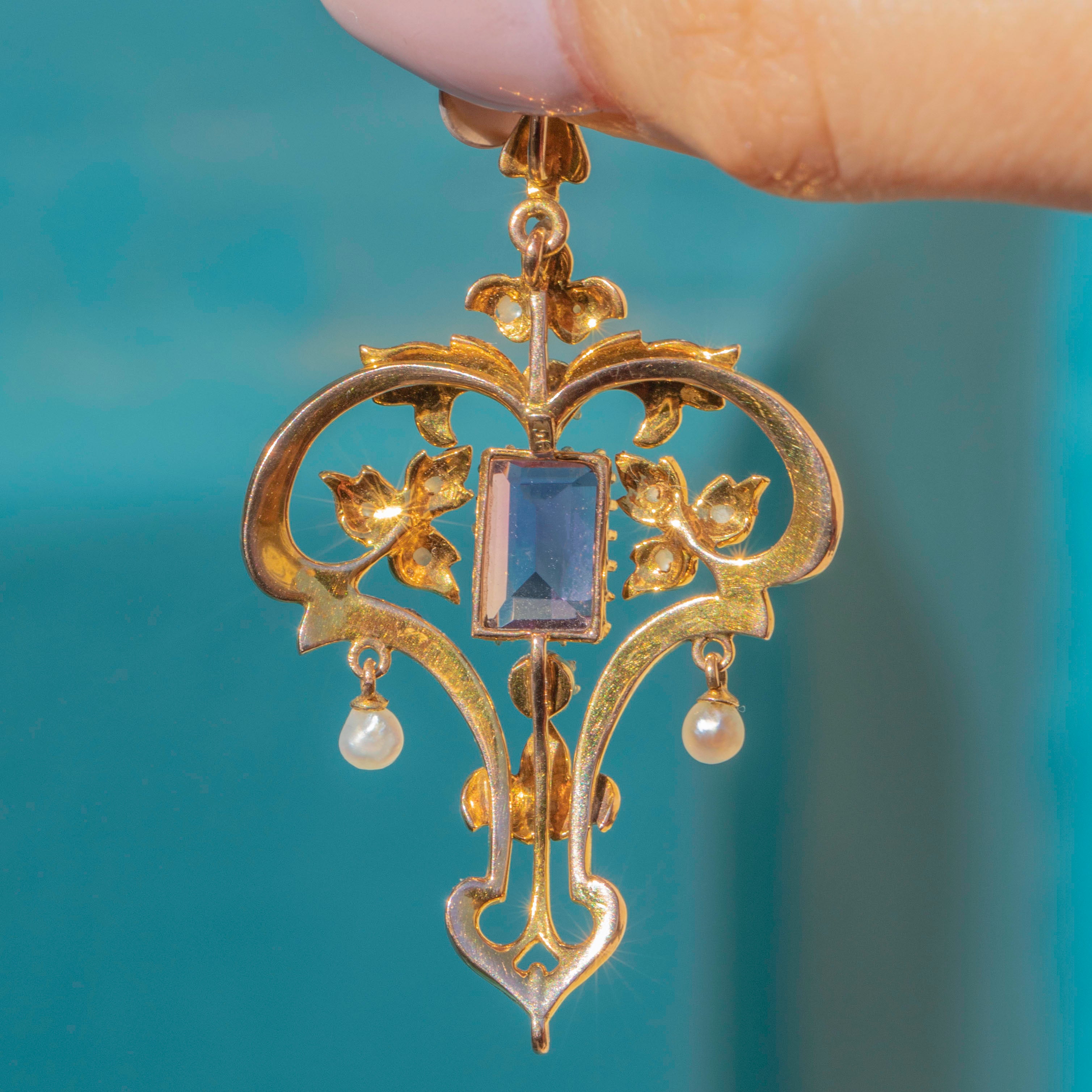 Art Nouveau 9ct Gold Enamel Amethyst & Pearl Lavalier Pendant
