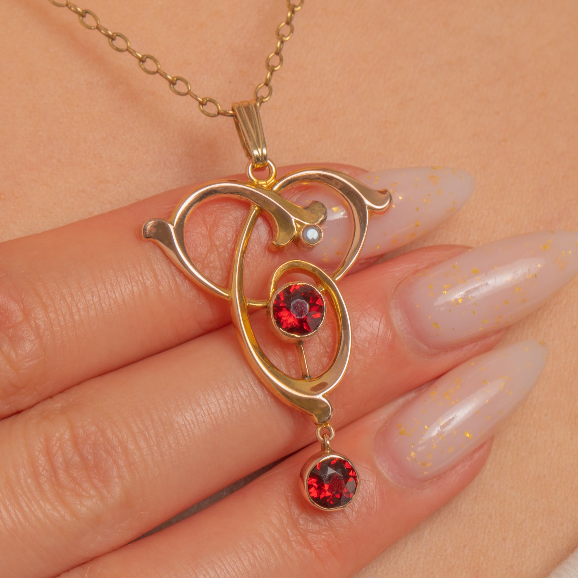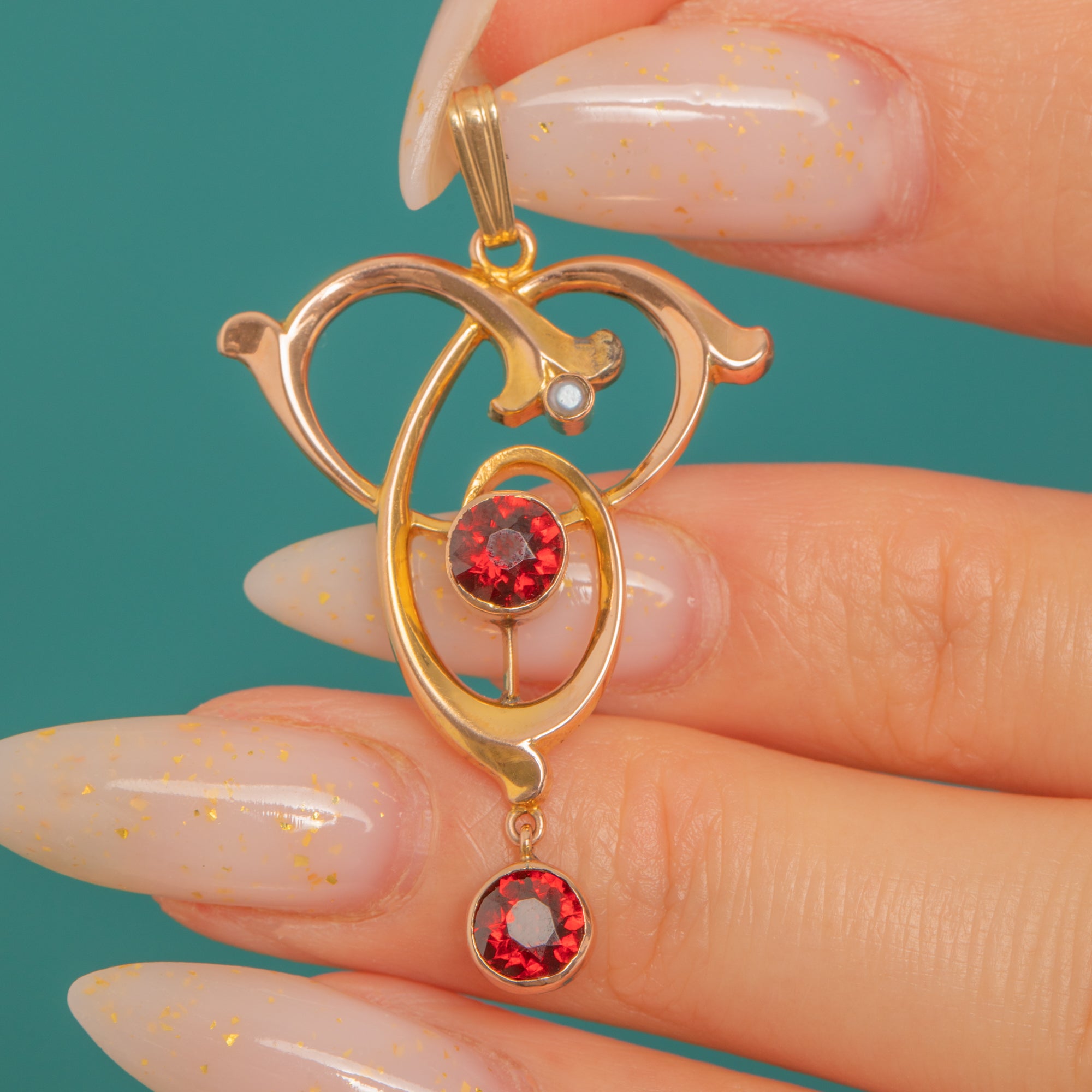 Art Nouveau 9ct Gold Garnet & Pearl Whiplash Drop Pendant