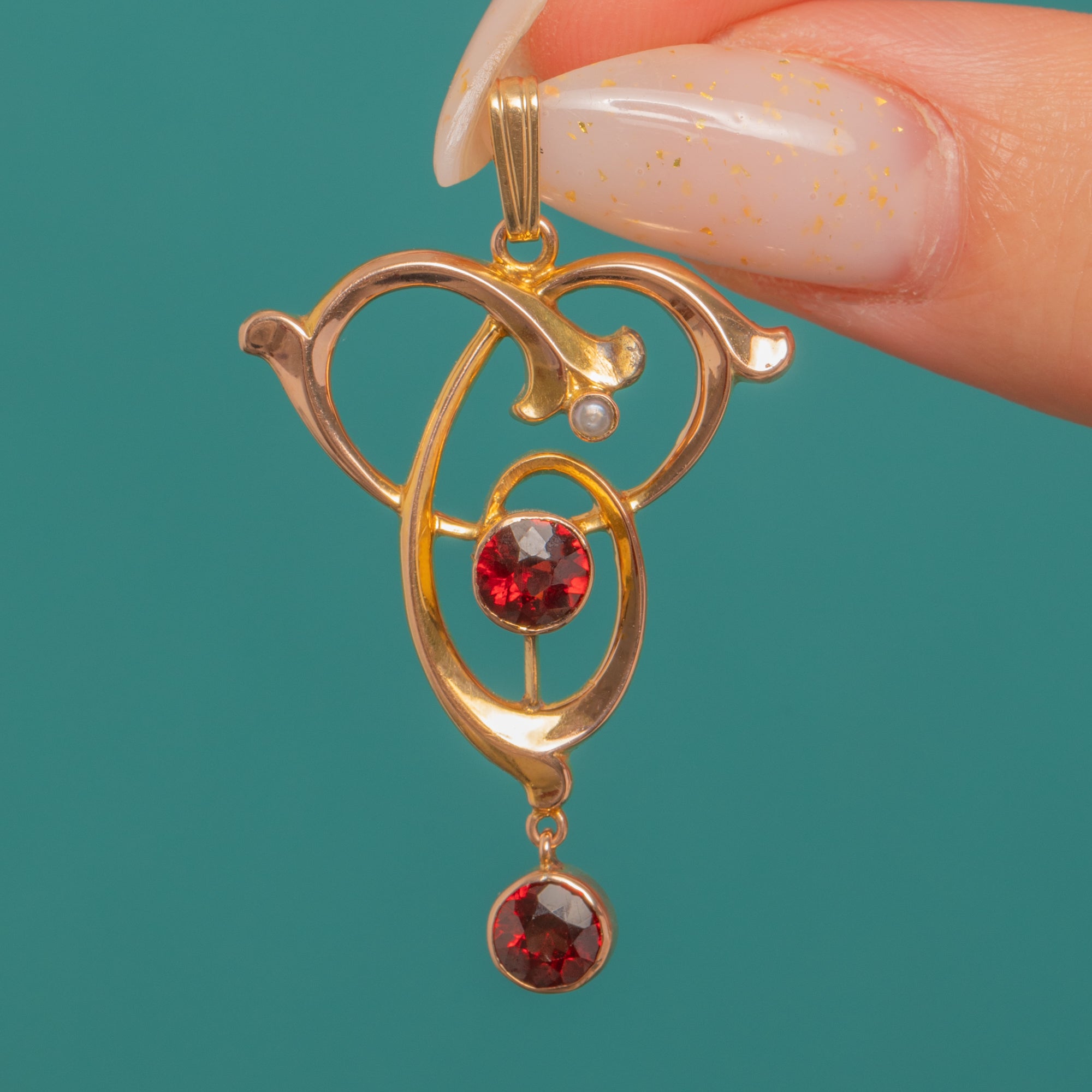 A graceful Art Nouveau pendant in 9ct Gold, designed with flowing, ribbon-like curves that capture the era’s love of organic line and movement. At its centre sits a vivid Garnet, with a second Garnet drop dancing below for that perfect touch of antique drama.