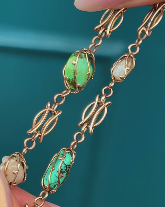 This Art Nouveau 9ct Gold necklace showcases a graceful arrangement of Matrix Turquoise and Baroque Pearls, beautifully graduating in size along the 16" chain.