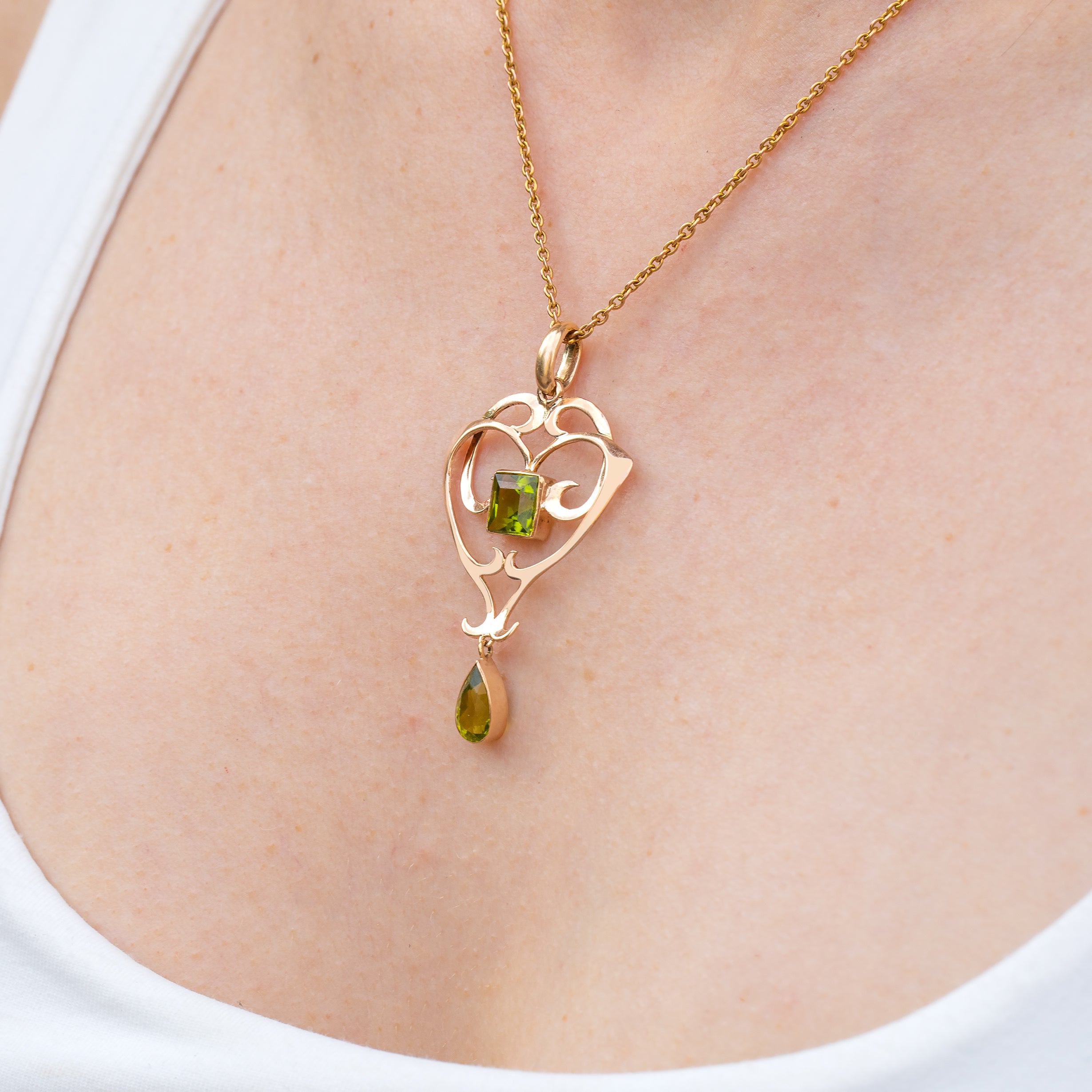 EXCELLENT. This Art Nouveau 9ct Gold Peridot lavalier pendant is in excellent condition. This pendant has secure Peridot gems that possess a gorgeous colour and are free from any wear and tear. The pendant is stamped on the back and has held its shape beautifully.