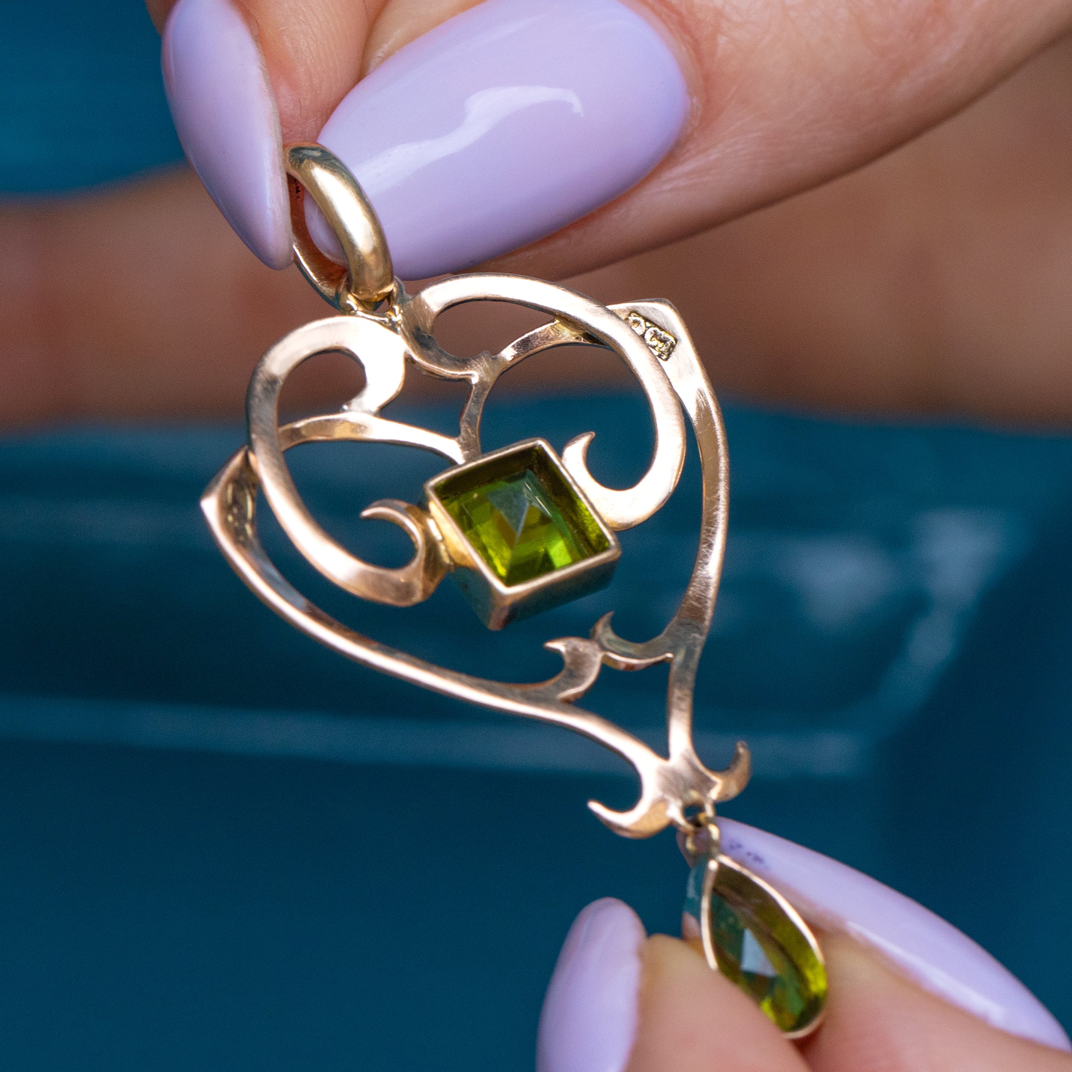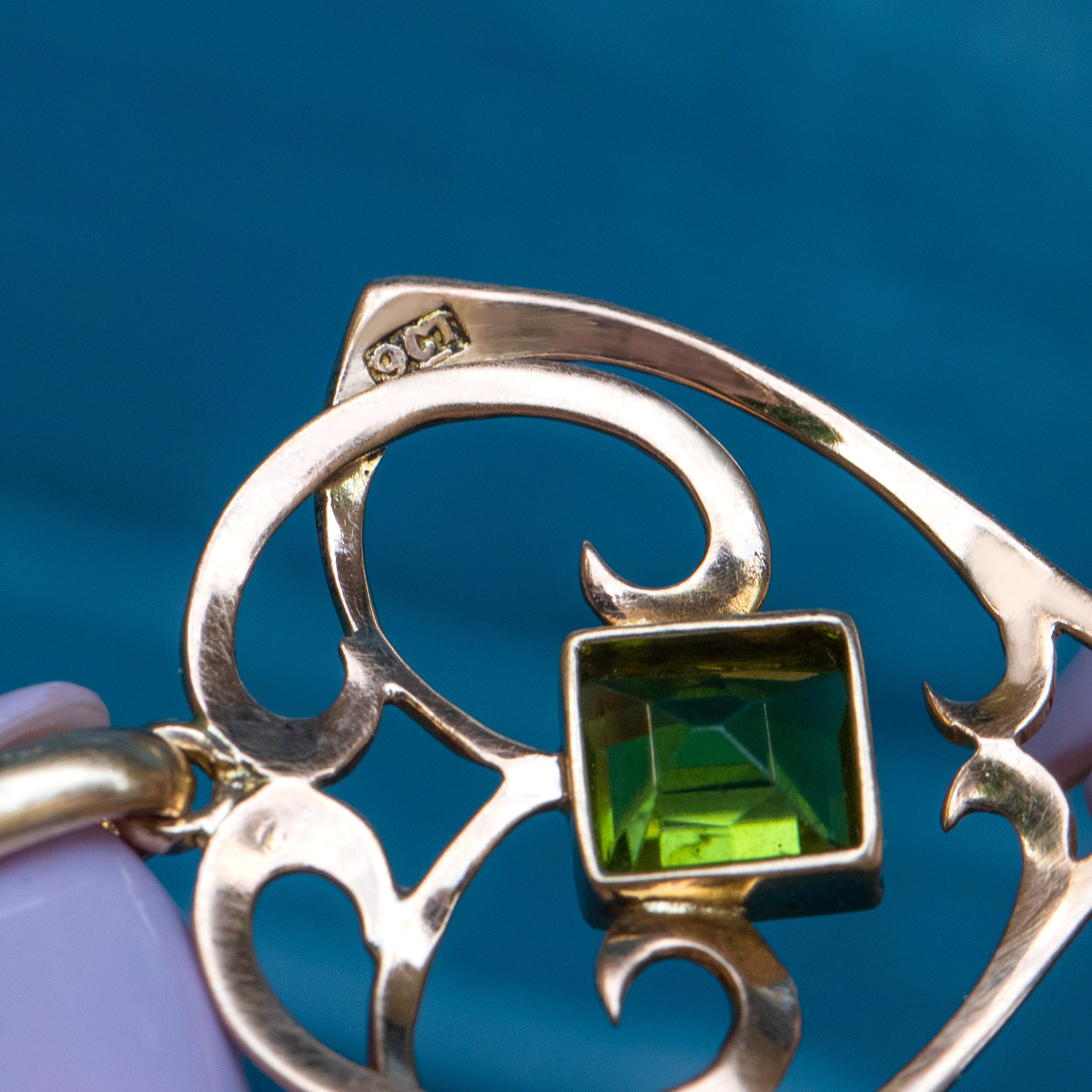 A whimsical Art Nouveau 9ct Gold Peridot pendant! This undeniable Art Nouveau treasure embraces all that was so loved about the era, with clean flowing lines drawing inspiration from nature.