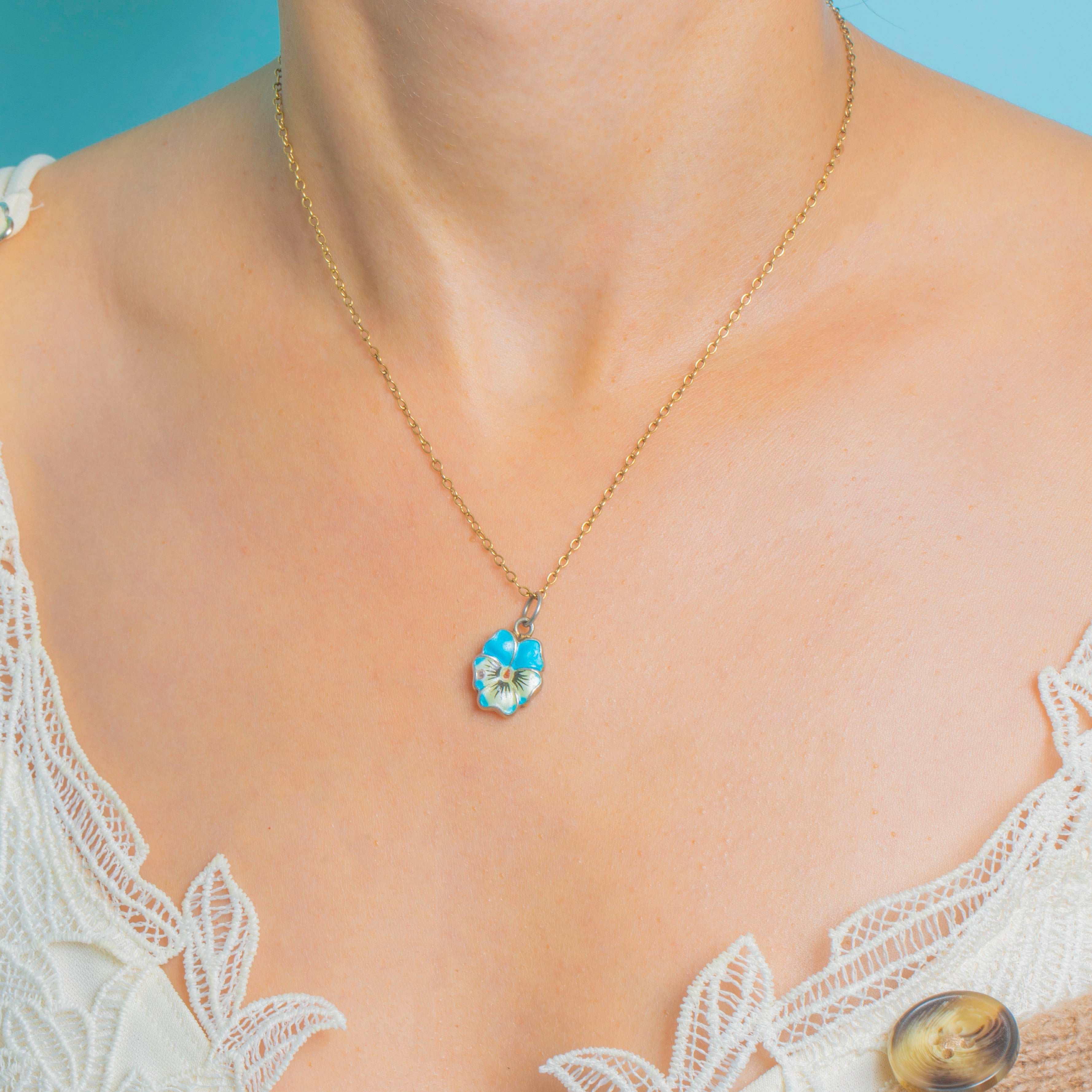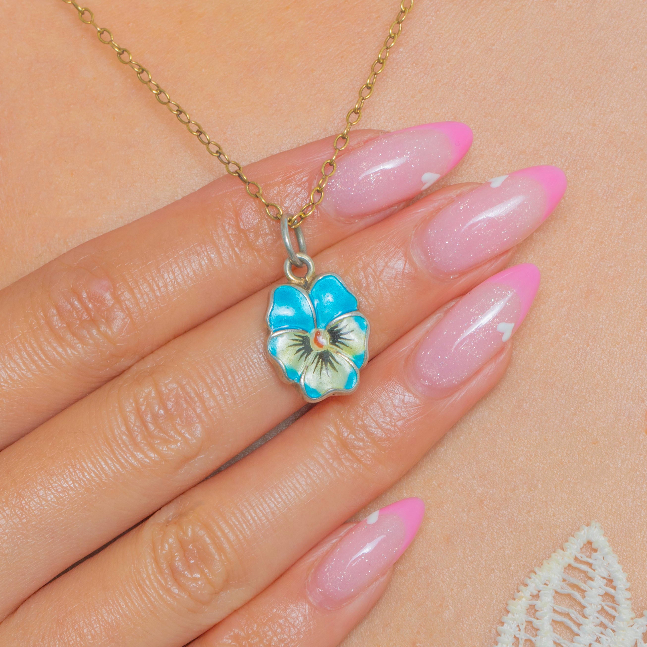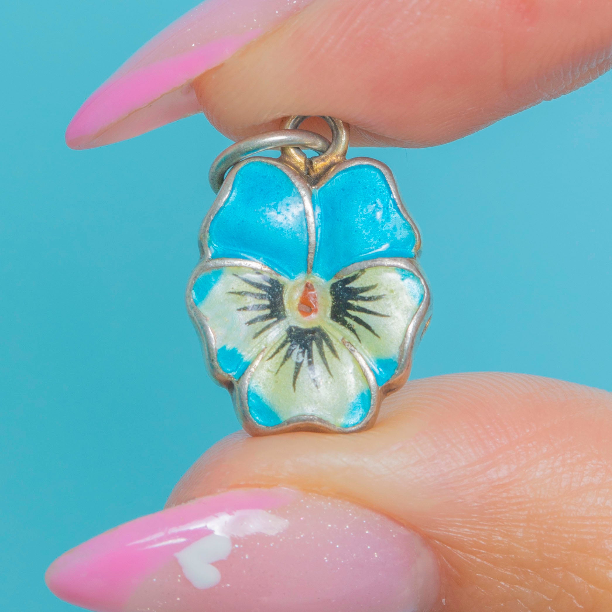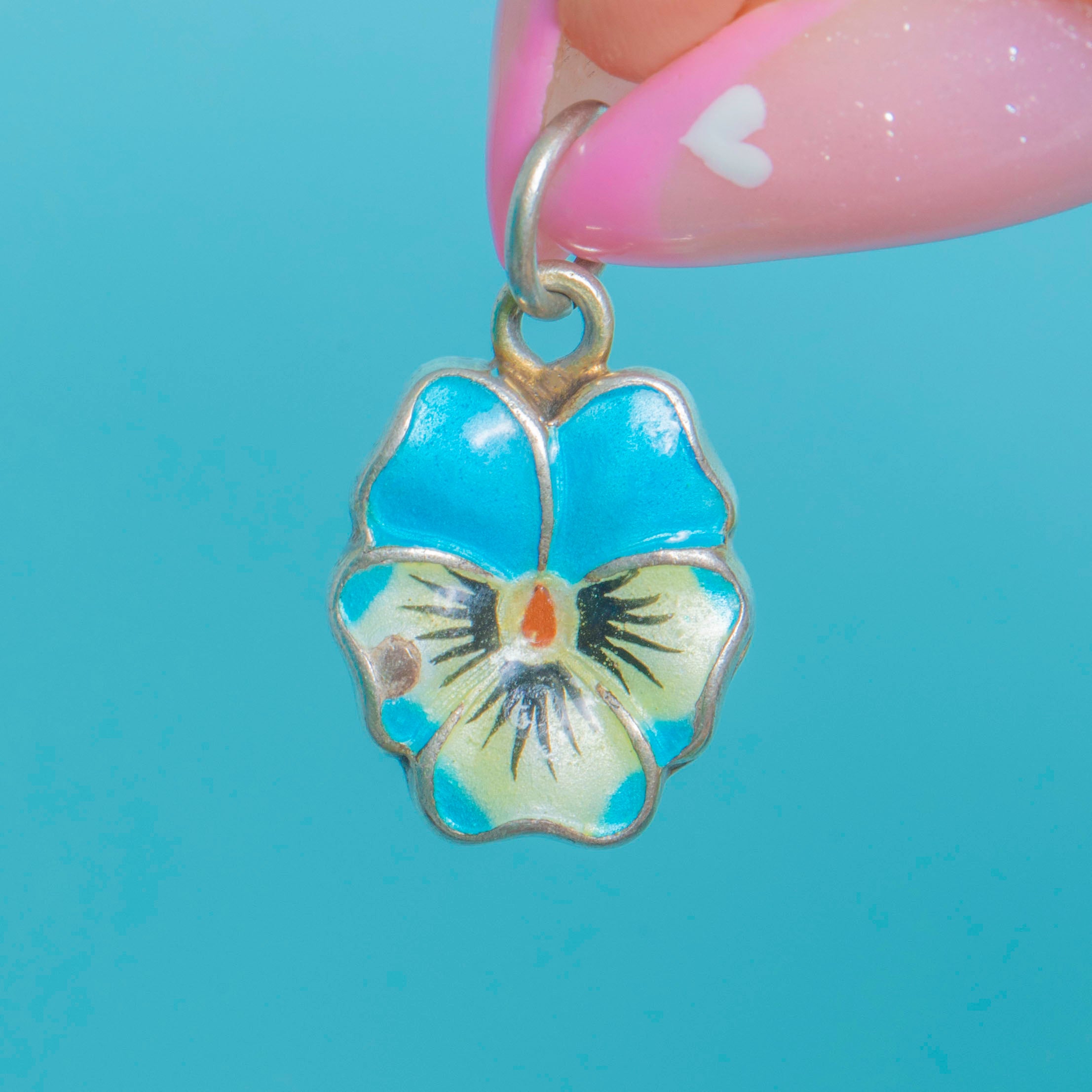 A beautiful Art Nouveau Enamel pansy charm, finely detailed with soft blue and violet tones fading into a sunny yellow centre. This romantic flower was a popular motif of the early 1900s, symbolising love and remembrance.