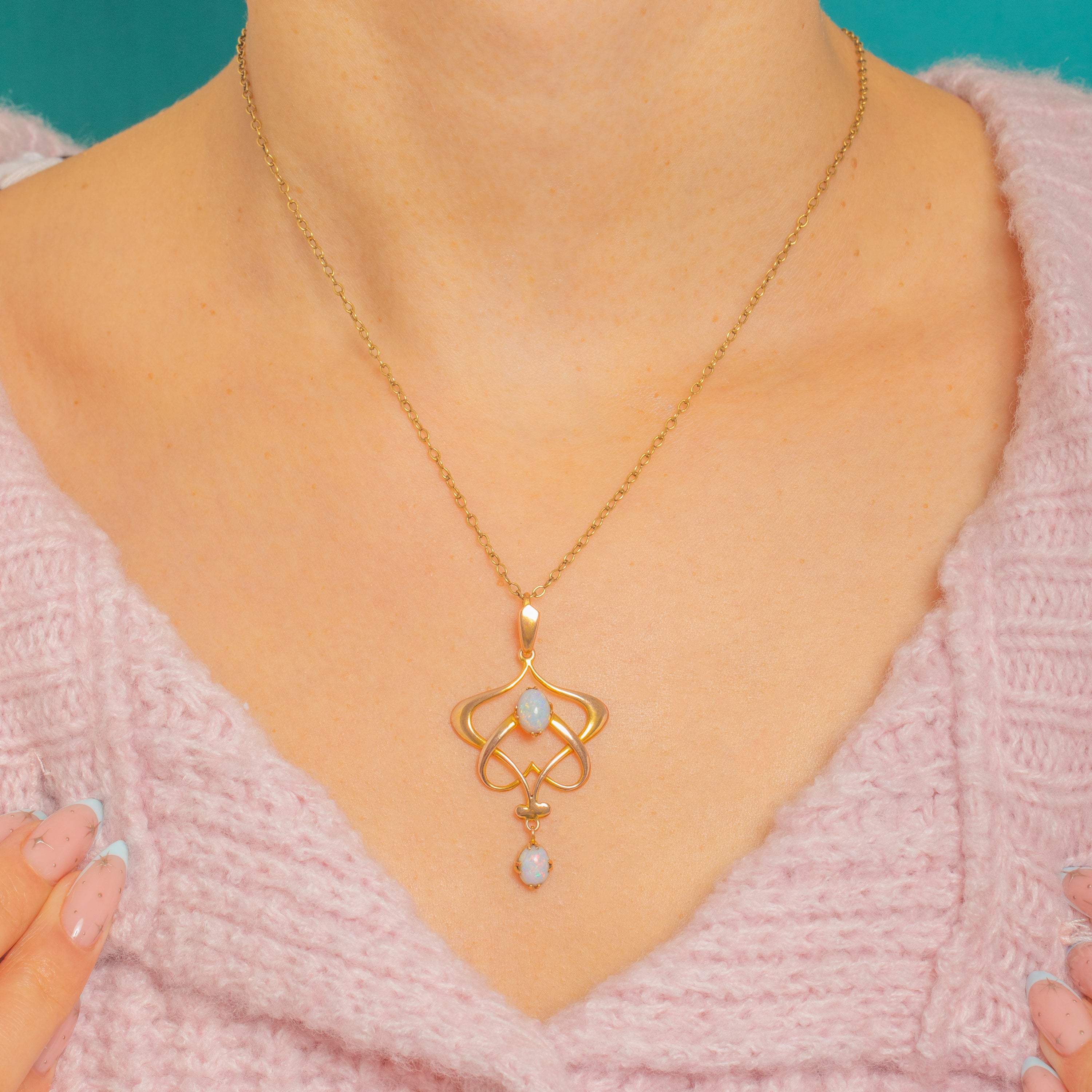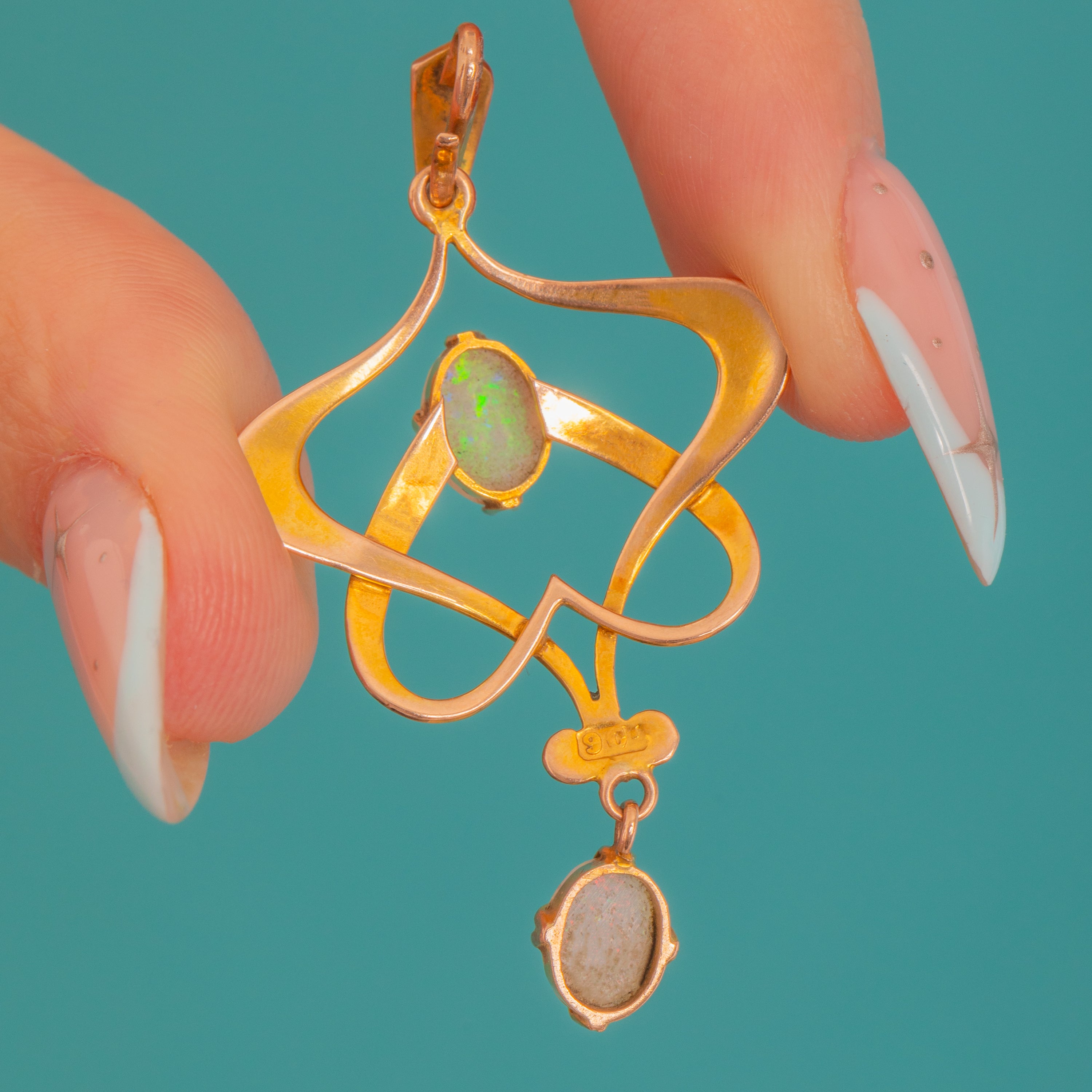 A beautifully fluid Art Nouveau pendant, crafted in 9ct Gold with those signature, swooping lines that feel effortlessly romantic. At its heart sits a softly glowing Opal cabochon, with a matching Opal drop suspended below for gentle movement and light-play.