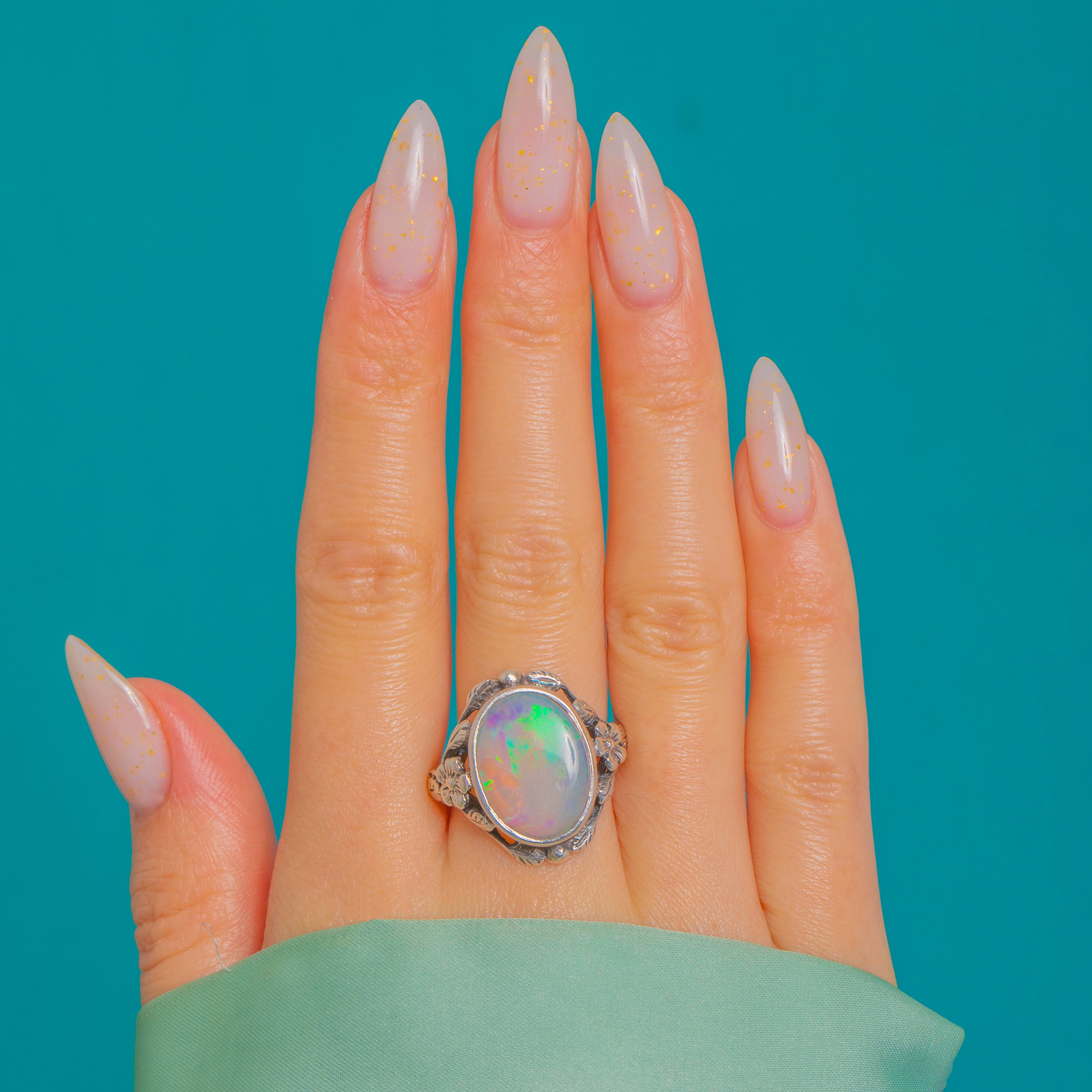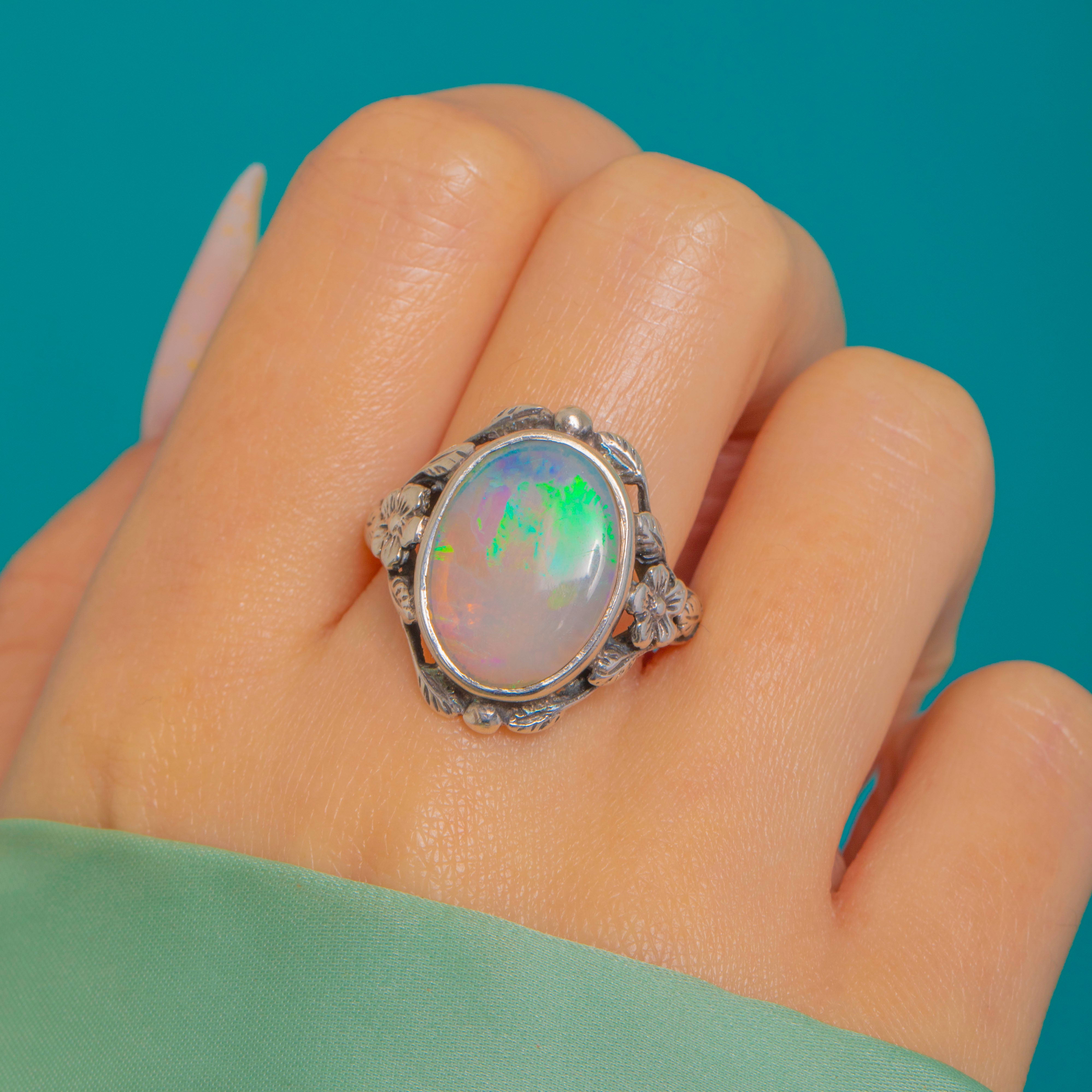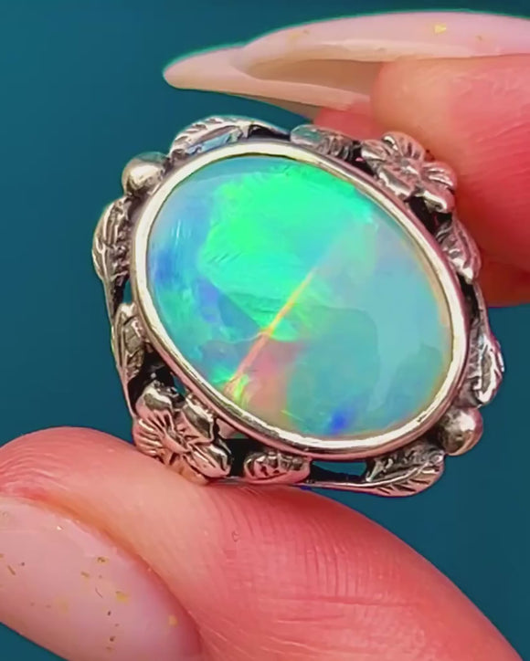 This romantic Arts & Crafts ring swirls with organic charm, centring a luminous 3.42ct oval Opal bezel-set to showcase its vibrant play-of-colour. Flashes of green, aqua, blue and warm golden tones dance across the cabochon, framed by sinuous foliate shoulders with delicate flowers, scalloped edges and tiny granule accents.