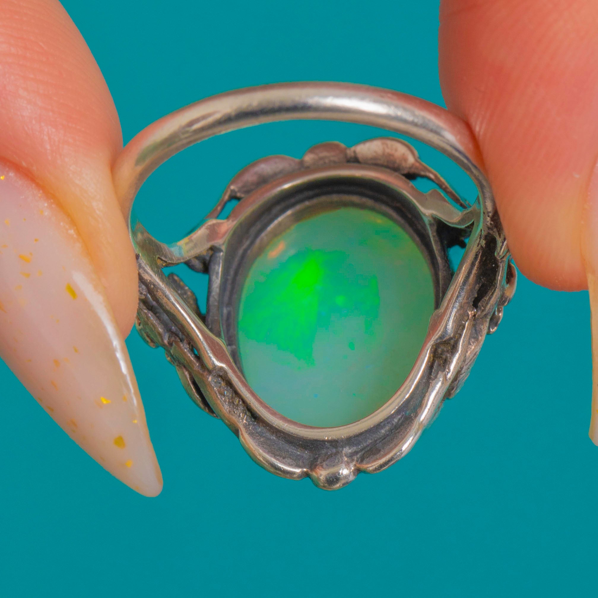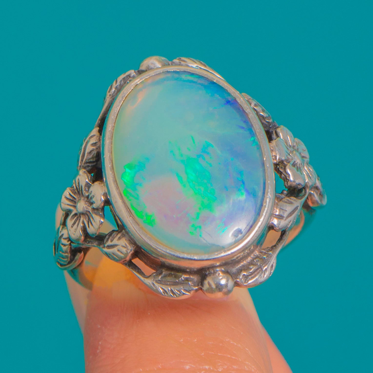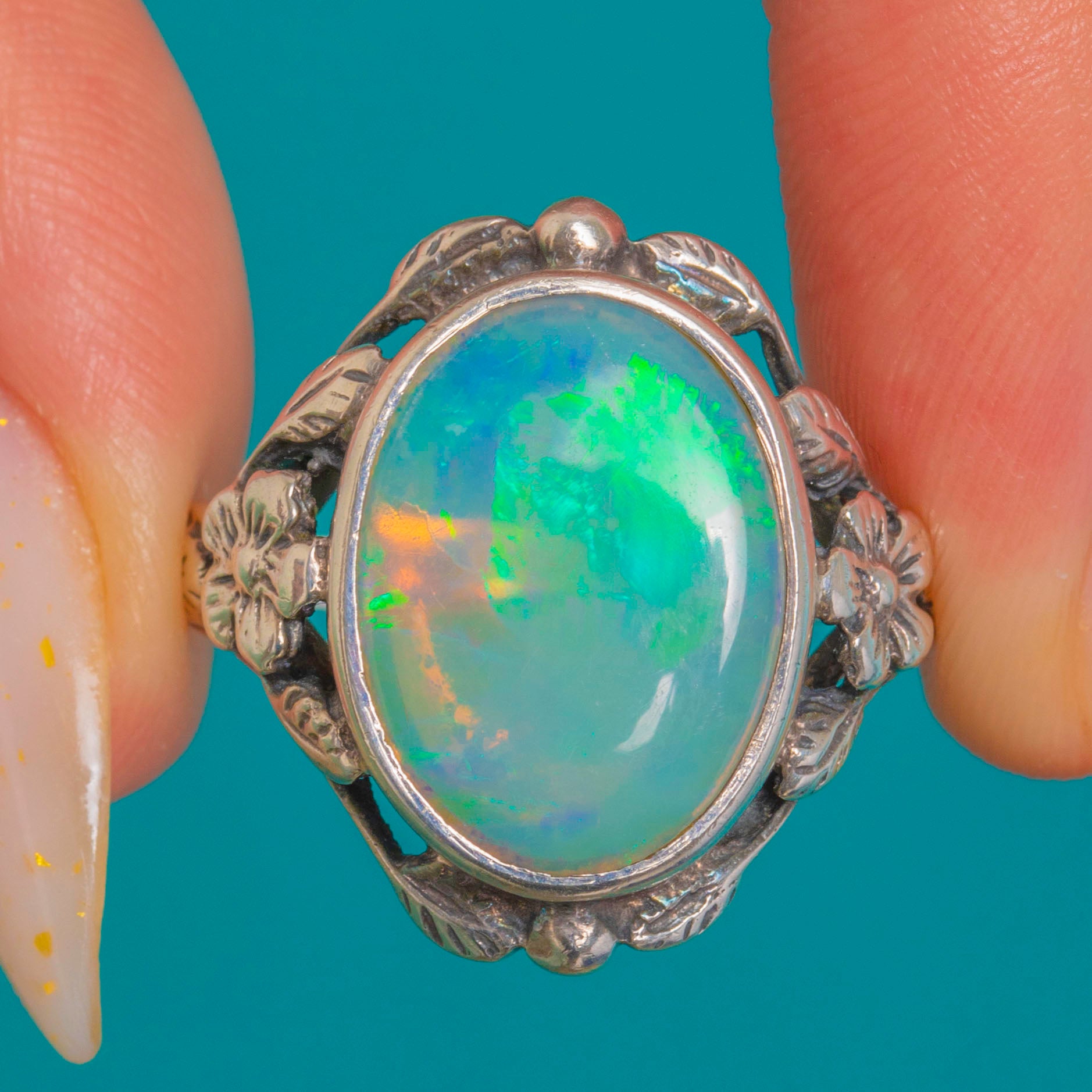 This romantic Arts & Crafts ring swirls with organic charm, centring a luminous 3.42ct oval Opal bezel-set to showcase its vibrant play-of-colour. Flashes of green, aqua, blue and warm golden tones dance across the cabochon, framed by sinuous foliate shoulders with delicate flowers, scalloped edges and tiny granule accents.