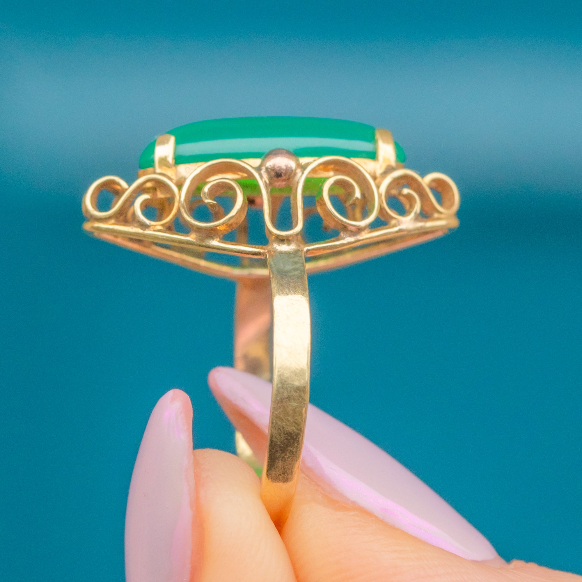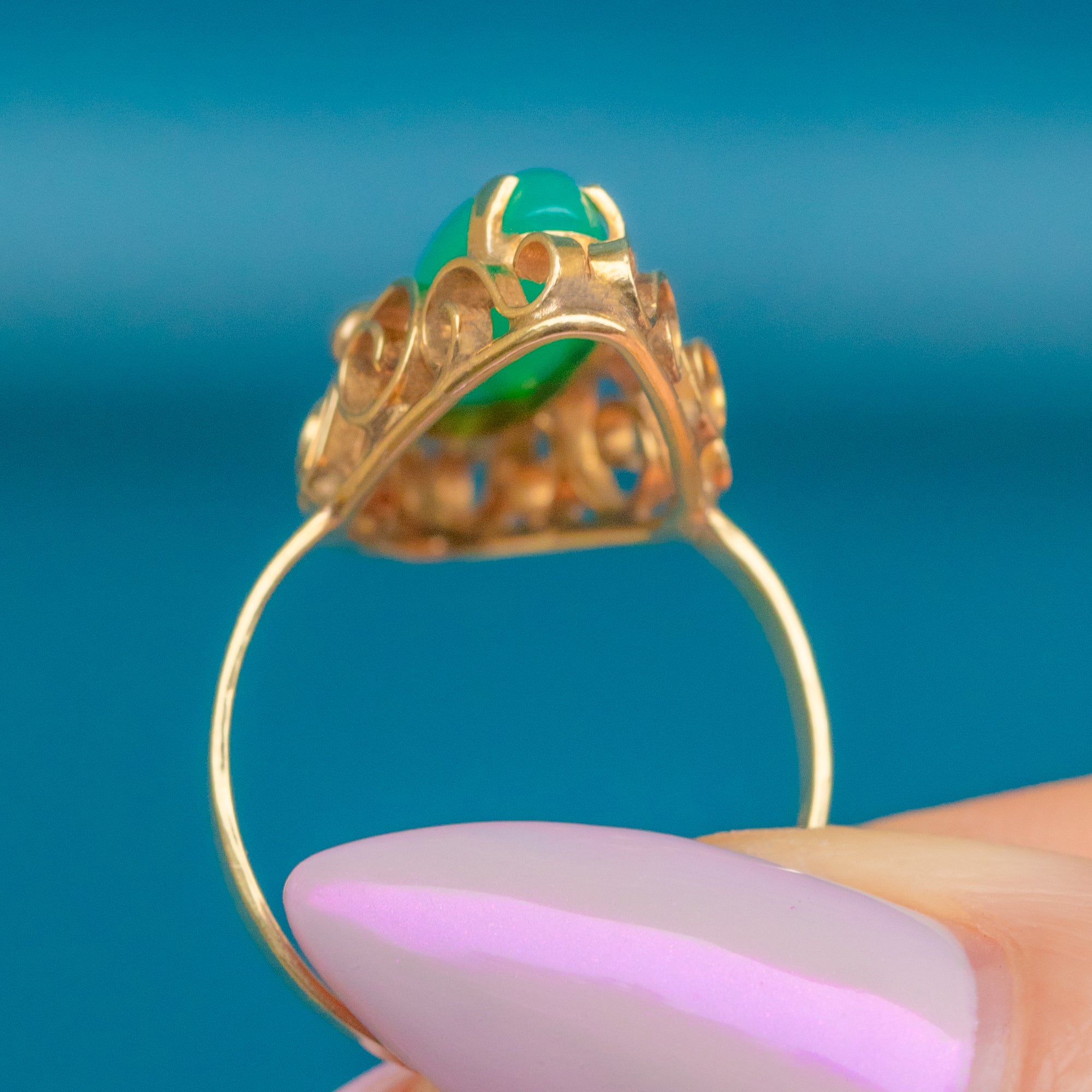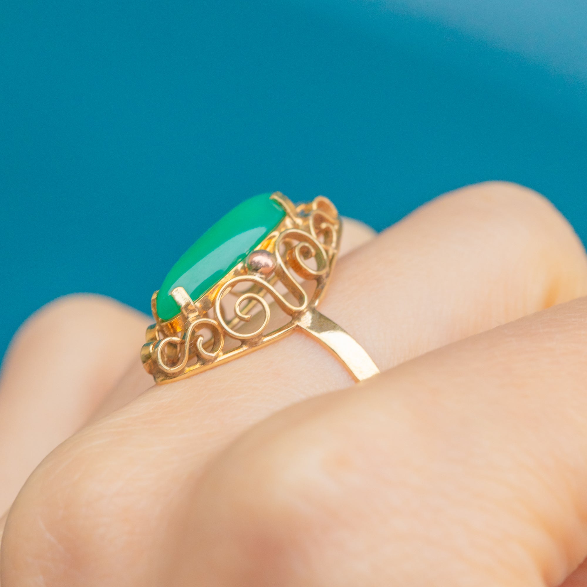 EXCELLENT: The green Chalcedony is smooth, glossy and free from damage and glowing bright! The solid 14ct Gold band is well-shaped and polished well with a gorgeous buttery yellow hue and no re-size marks or thinning to the band.