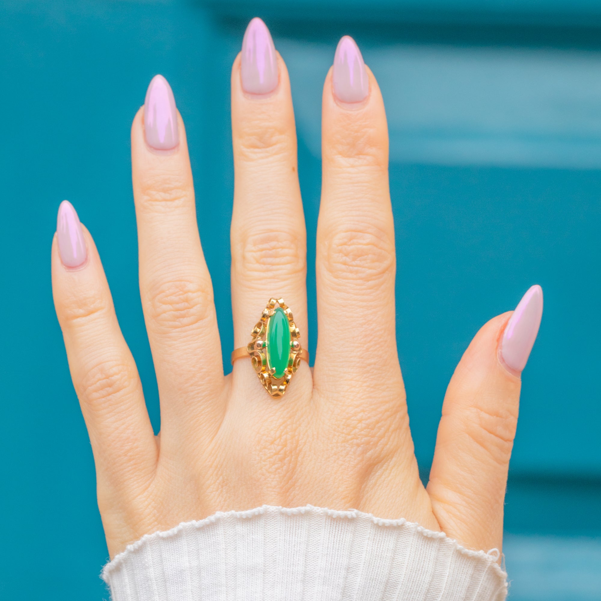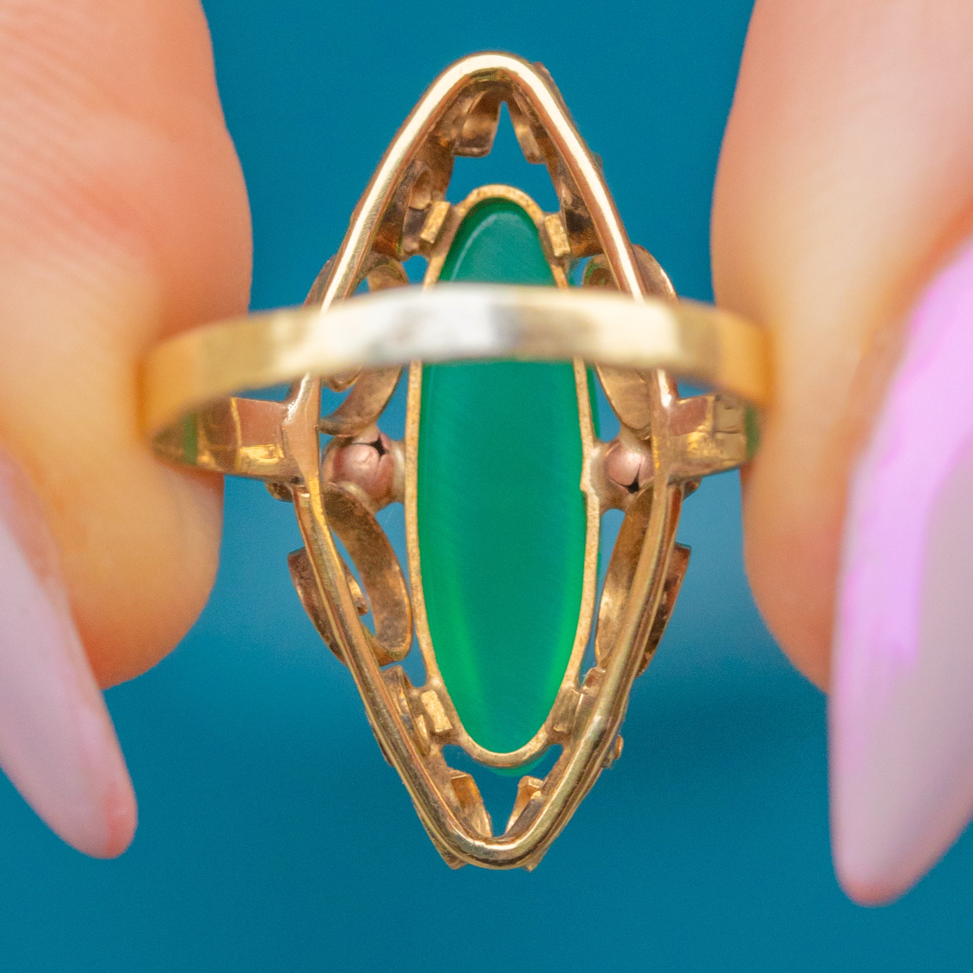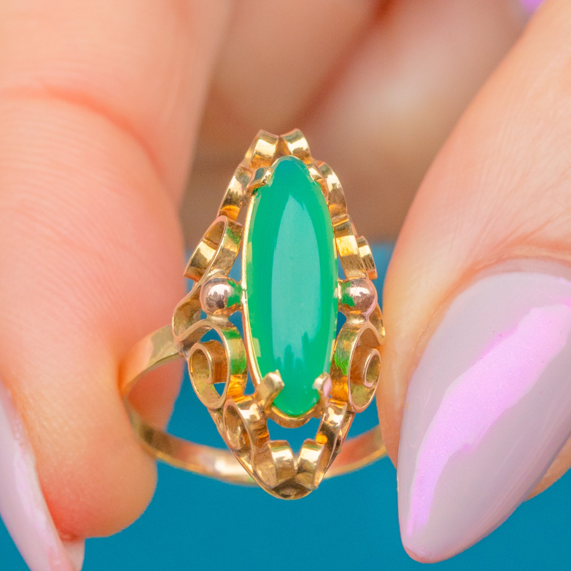 EXCELLENT: The green Chalcedony is smooth, glossy and free from damage and glowing bright! The solid 14ct Gold band is well-shaped and polished well with a gorgeous buttery yellow hue and no re-size marks or thinning to the band.