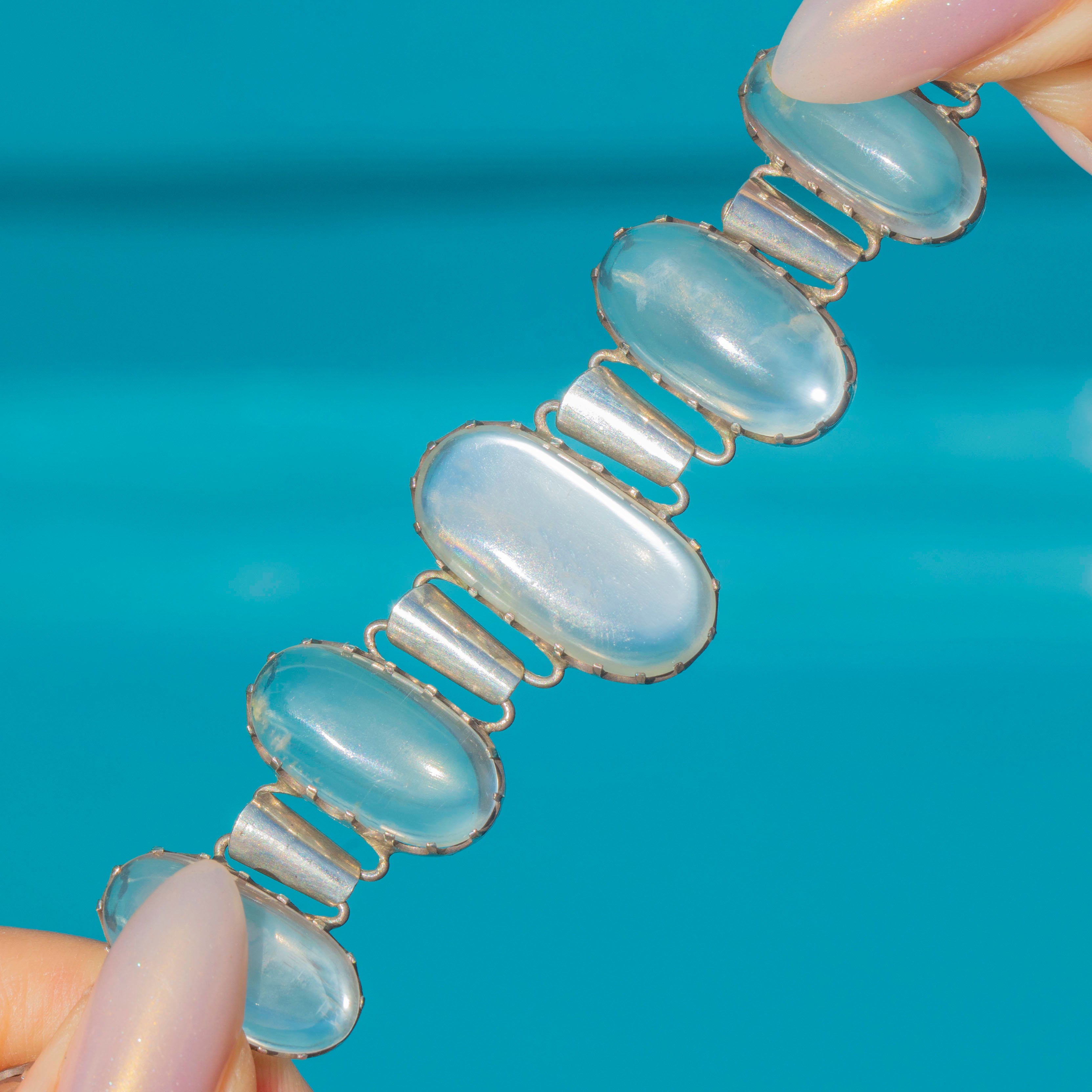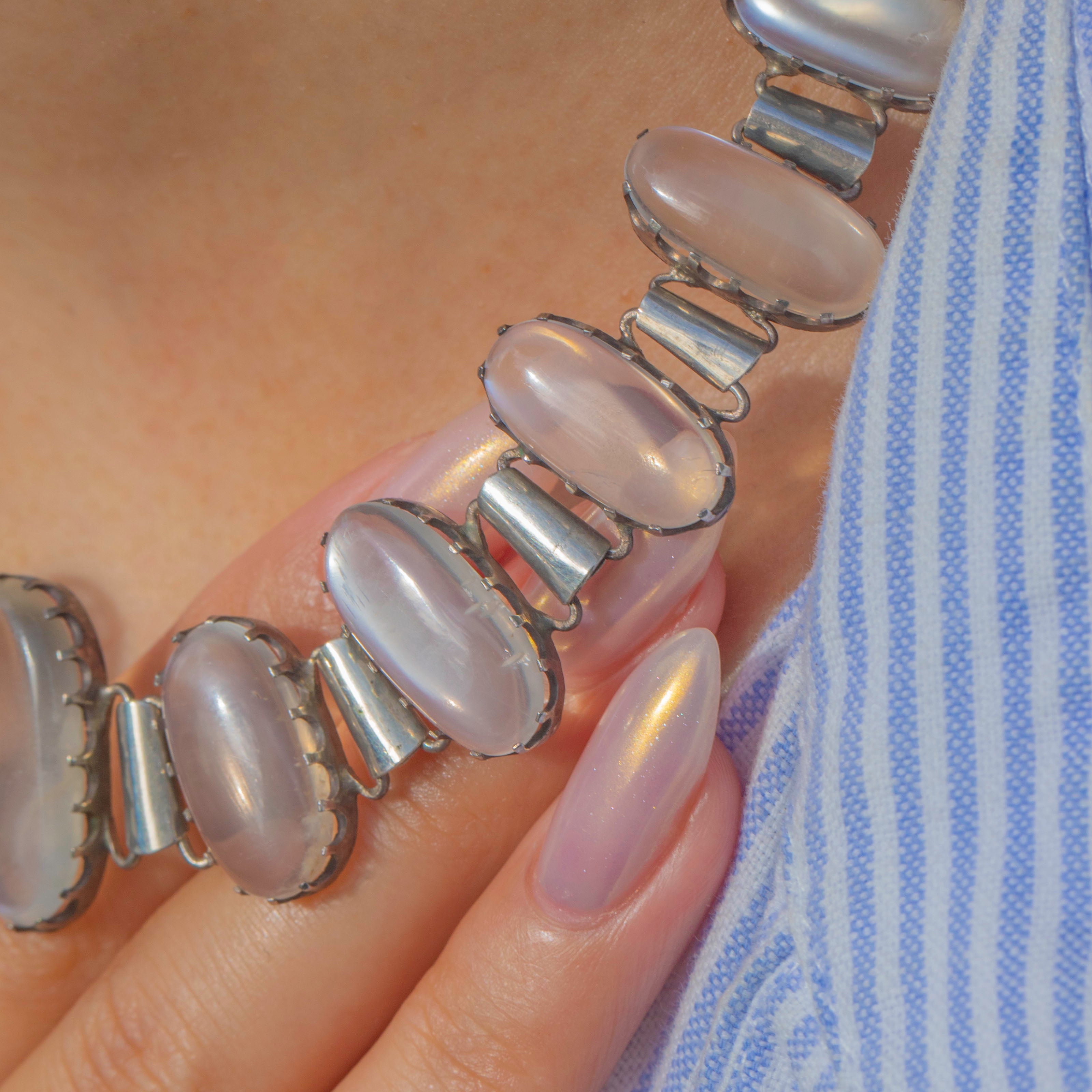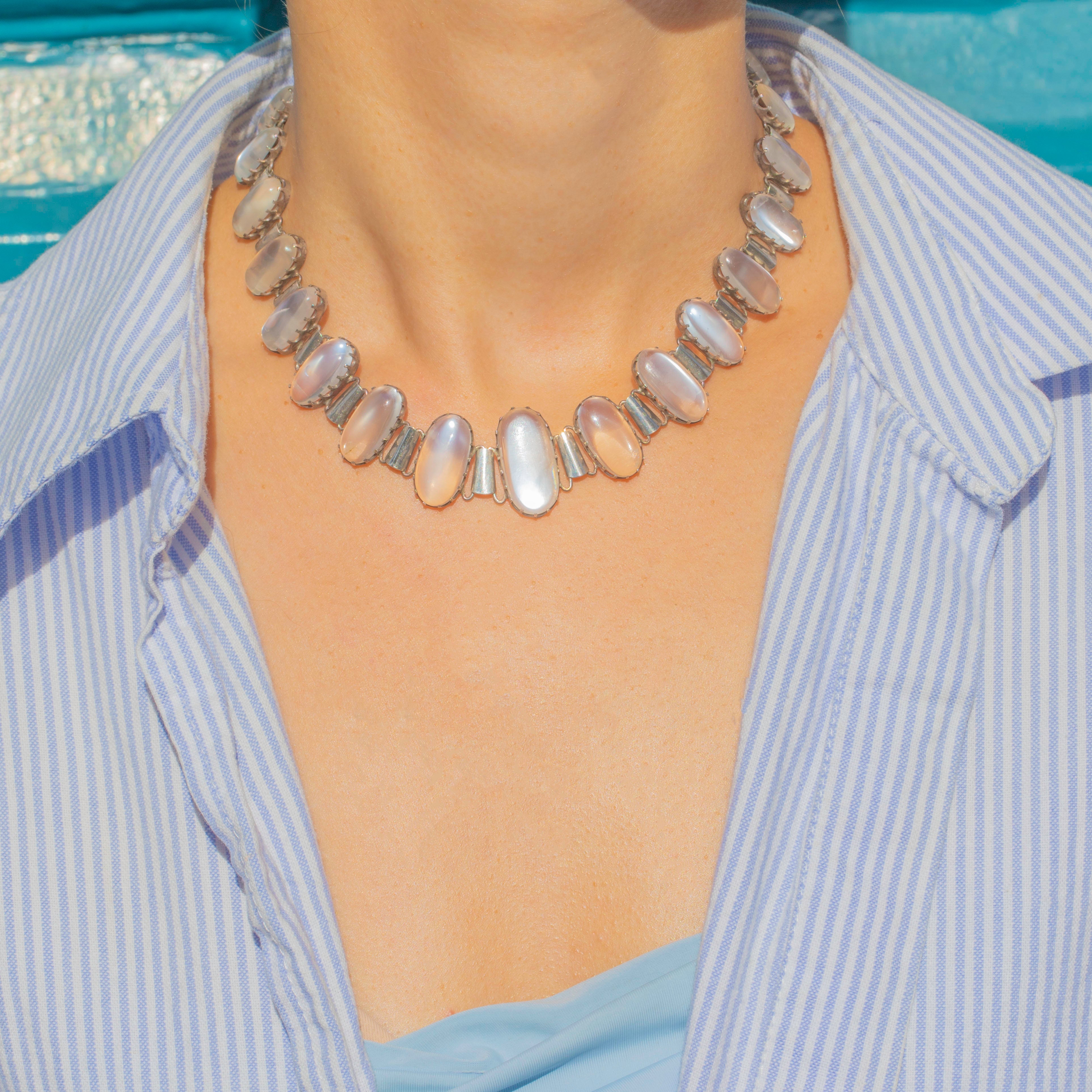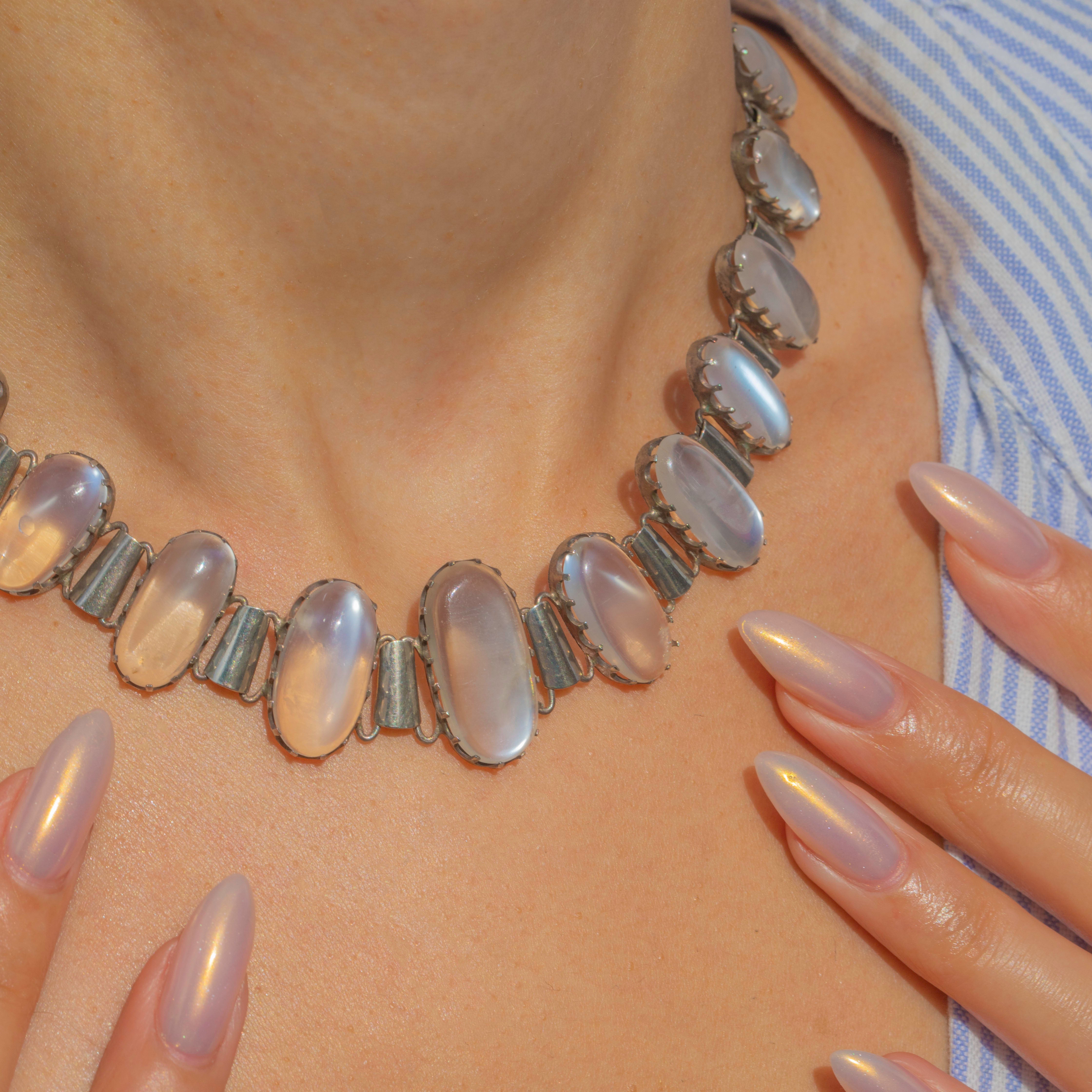EXCELLENT: The stones are generally in excellent order with a single very minor nibble to one moonstone; there are no loose stones. The Silver links and clasp are secure and present with minimal wear, indicating the necklace has been well cared for. There are no visible restoration or repair marks.