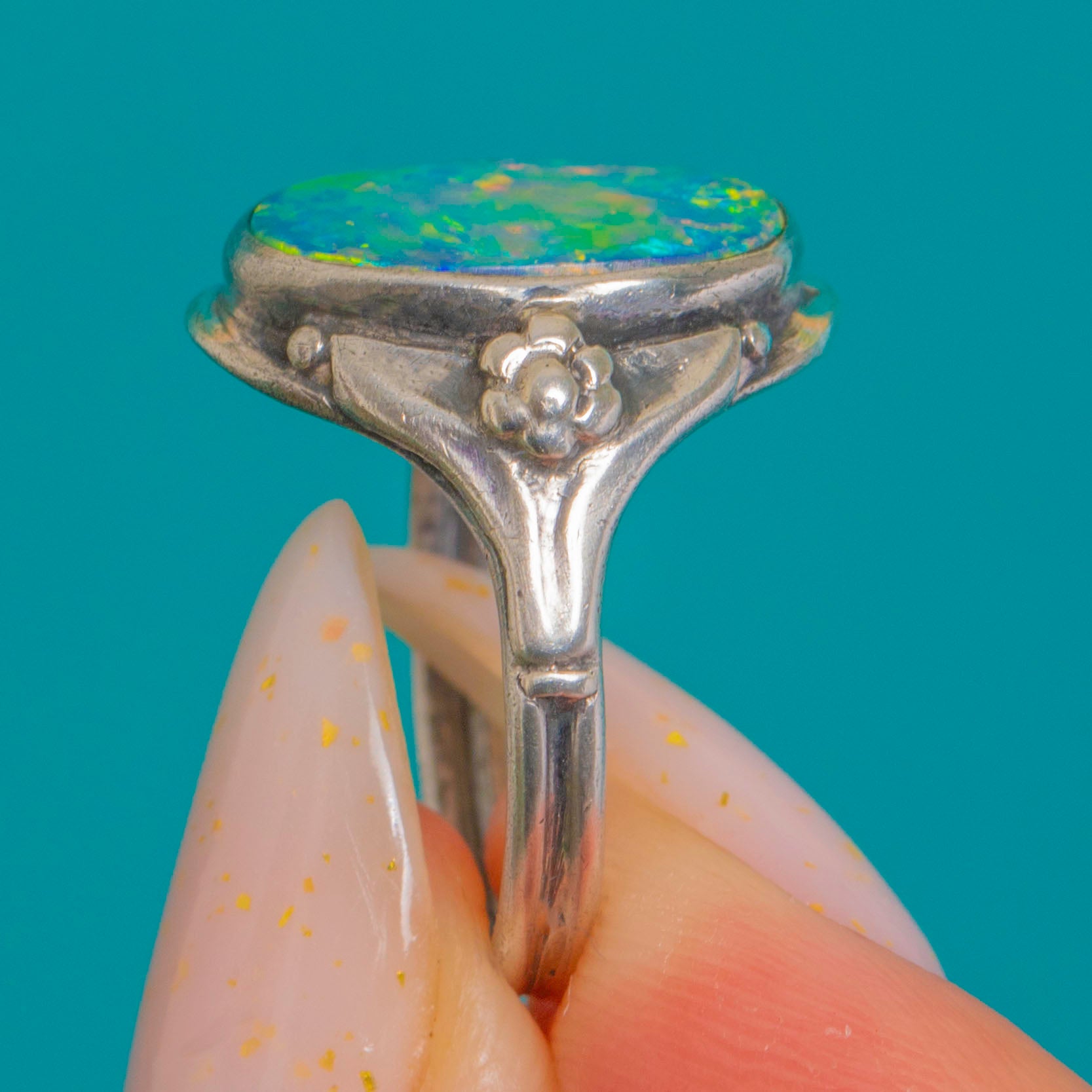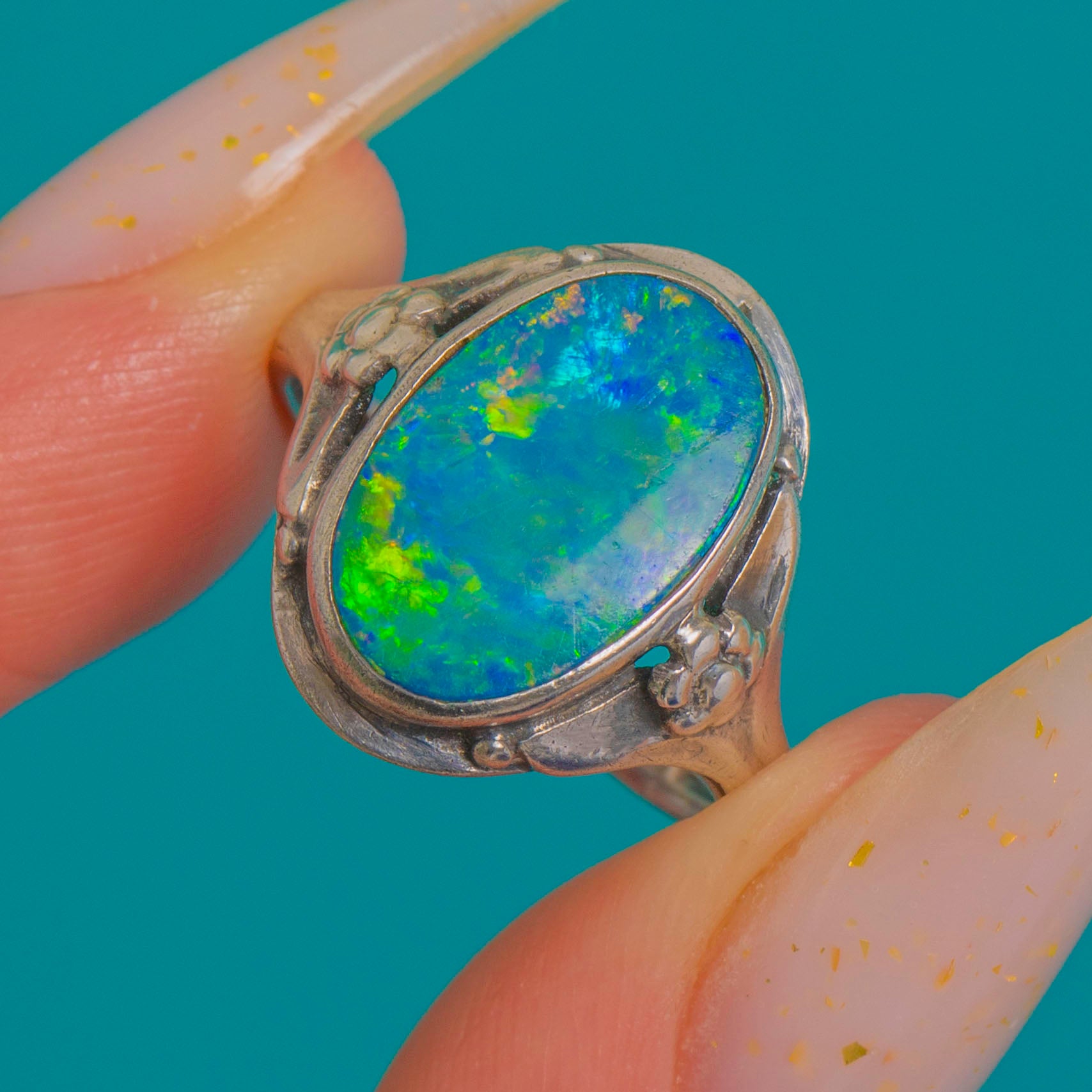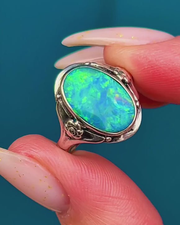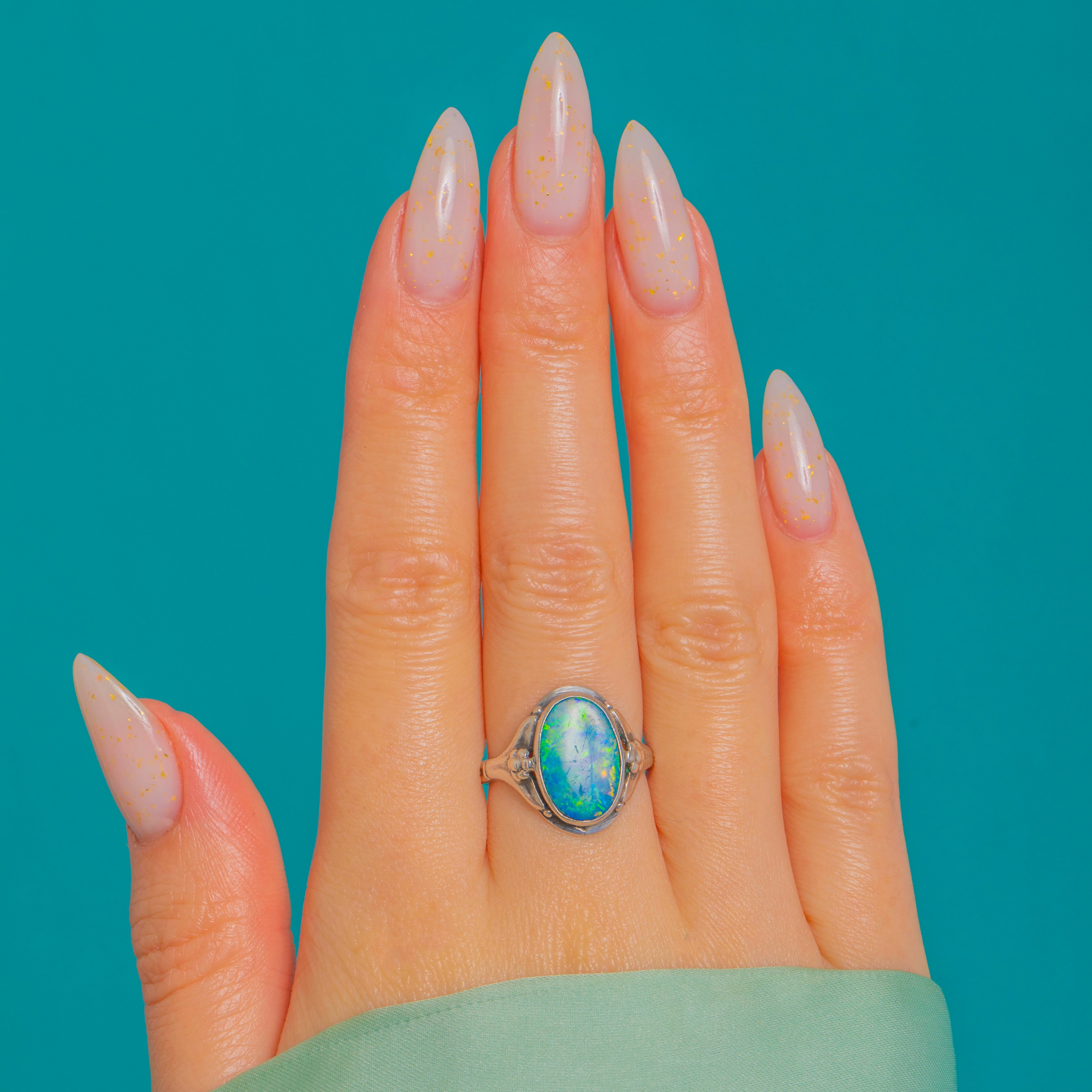 Alive with vibrant blue-green iridescence and flashes of yellow and orange, this Opal doublet ring captures the organic romance of the Arts and Crafts era. The oval cabochon is framed by a smooth rub-over bezel, creating a sleek silhouette that sits low to medium on the finger for effortless, everyday elegance.