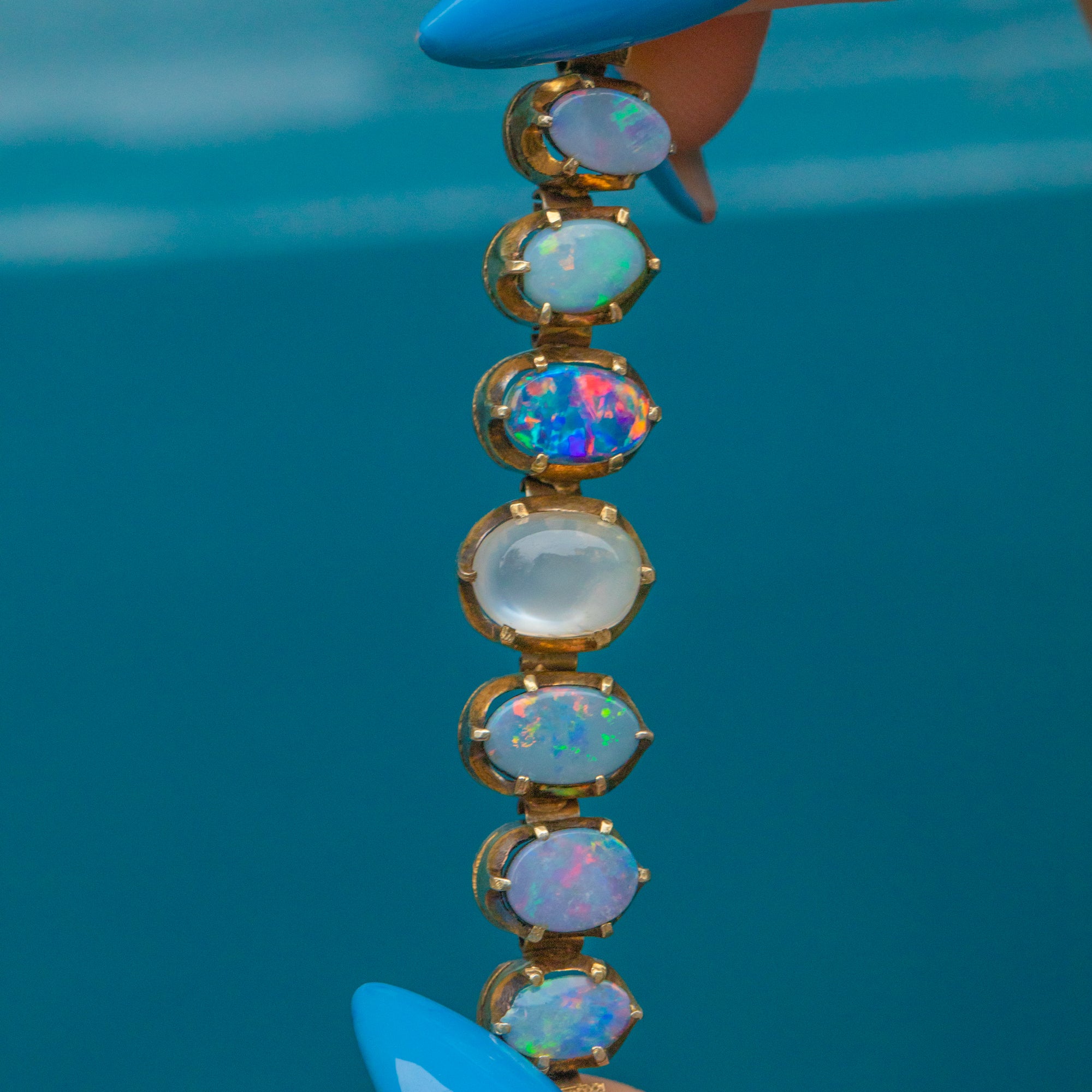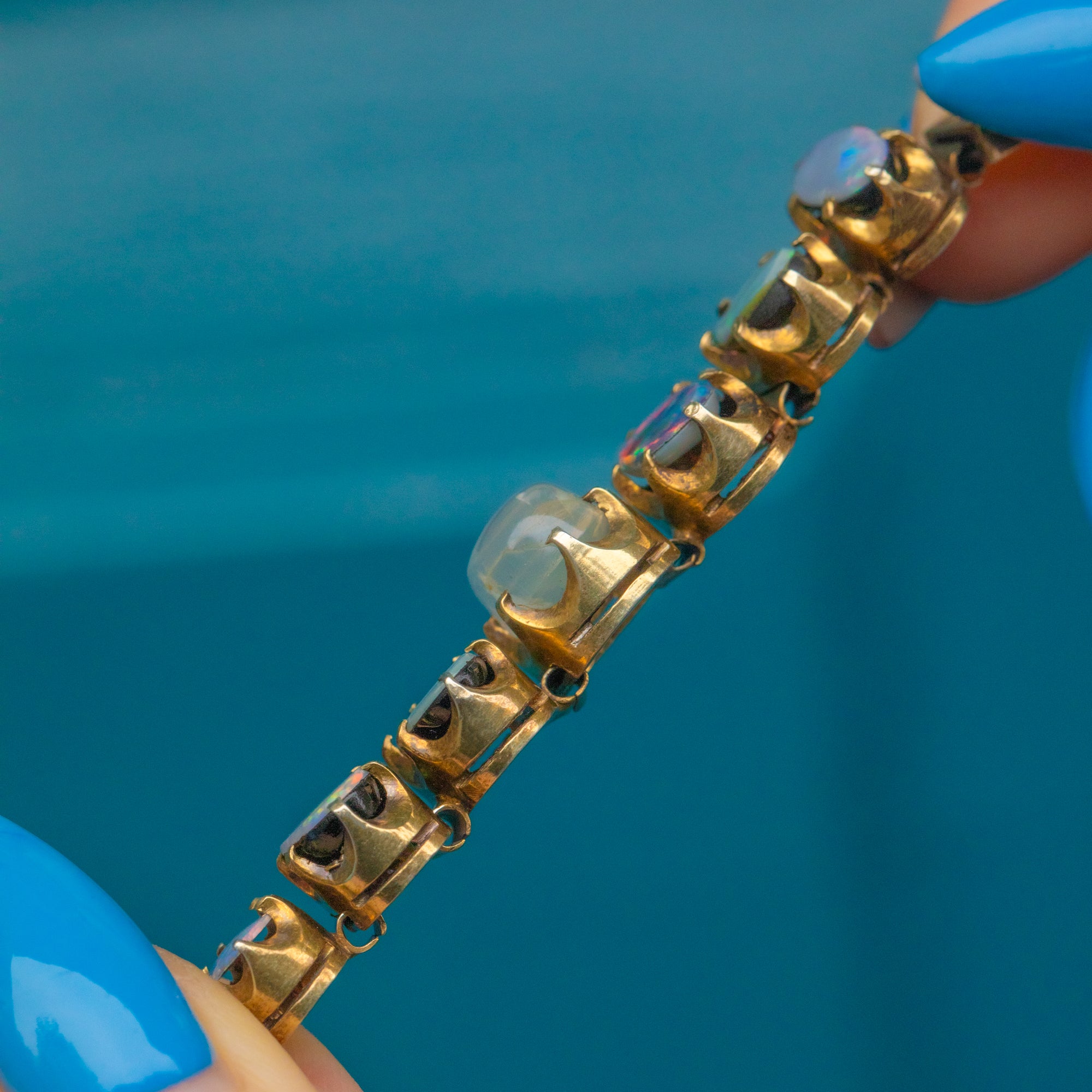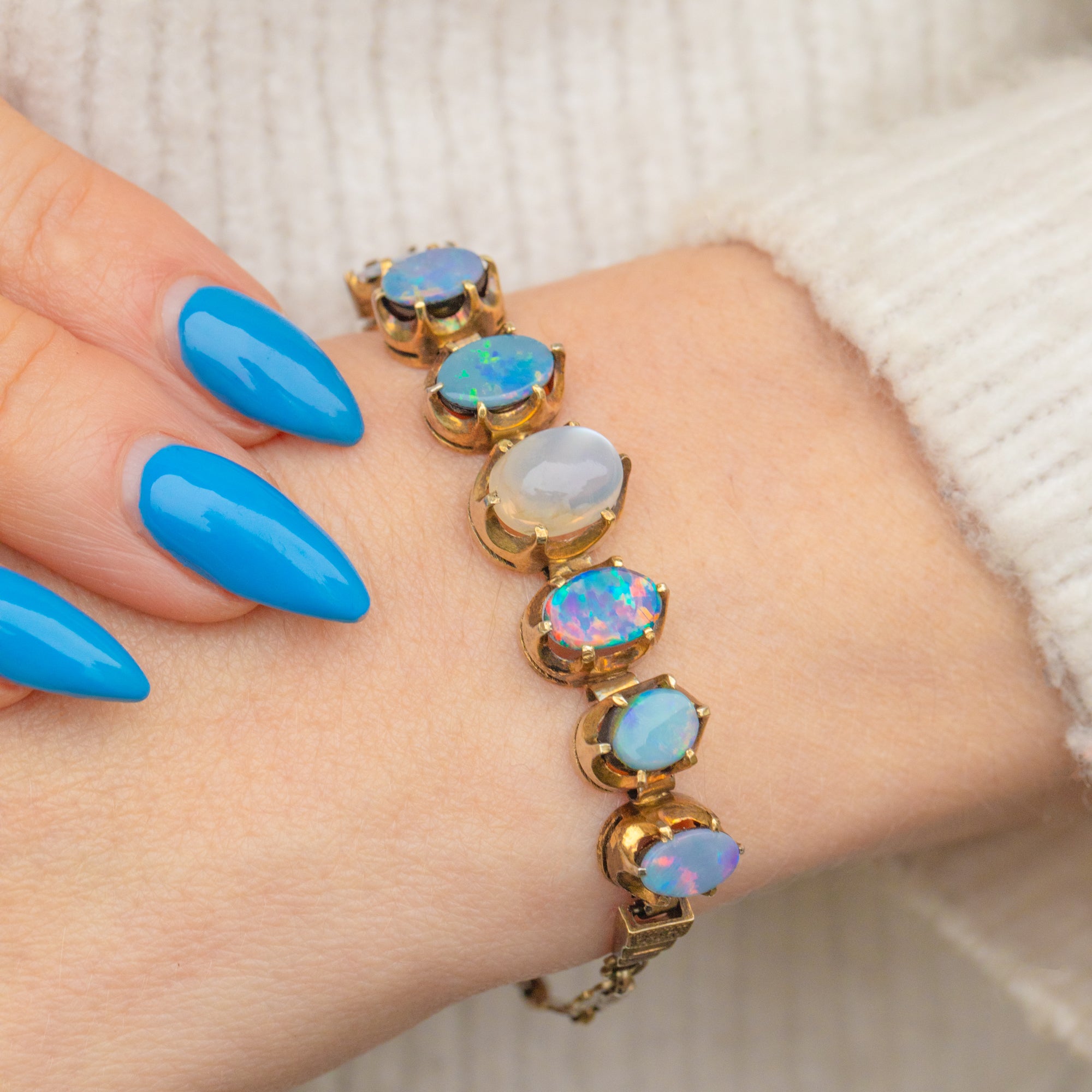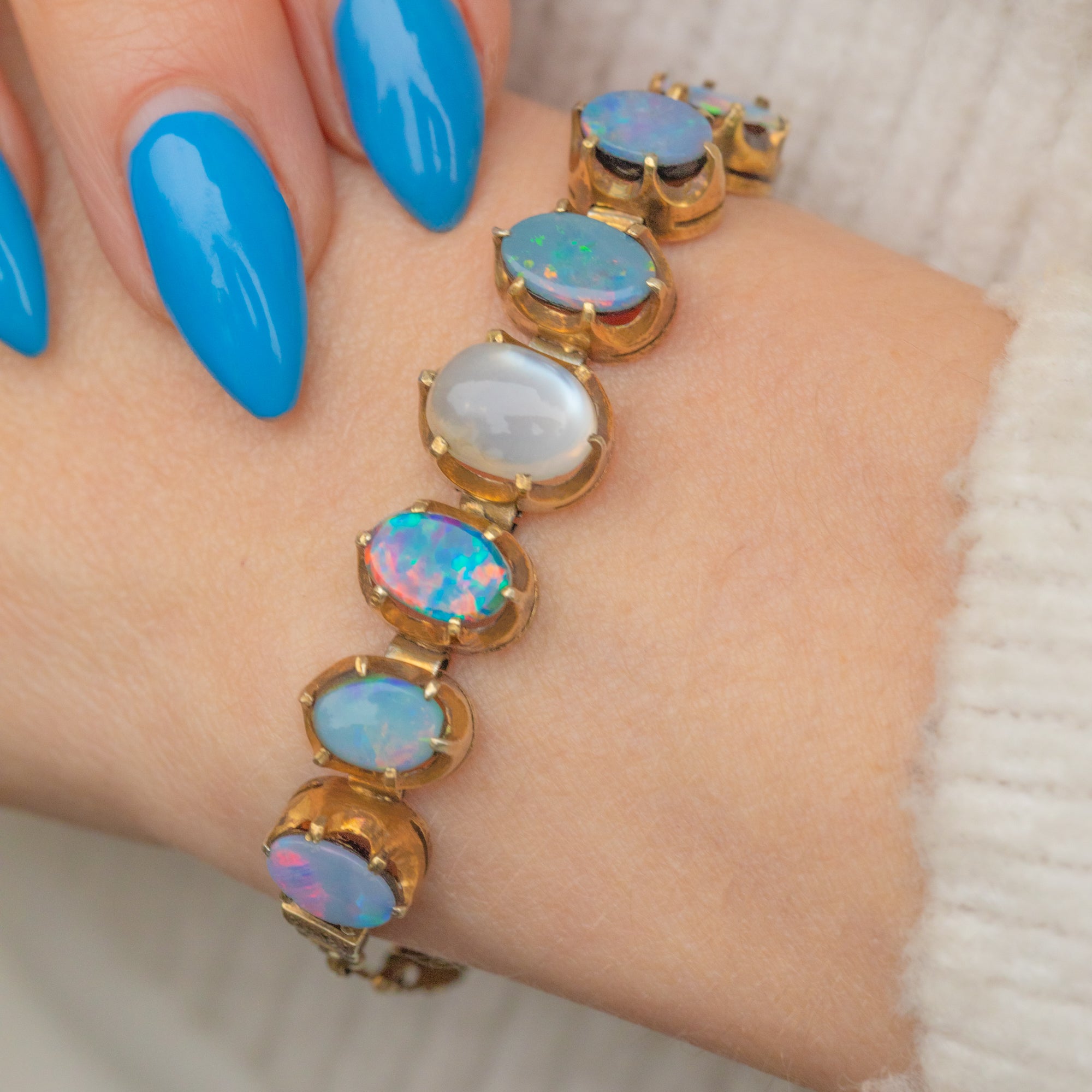 VERY GOOD. This  Arts & Crafts Opal Moonstone graduating bracelet is in very good condition. Her Opal doublets and Moonstone are radiant and free from any scuffs or nibbles. They sit securely within their settings and upon the bracelet band - which has some minor signs of surface wear commensurate with age. However, she has a well-functioning bolt ring for added security.