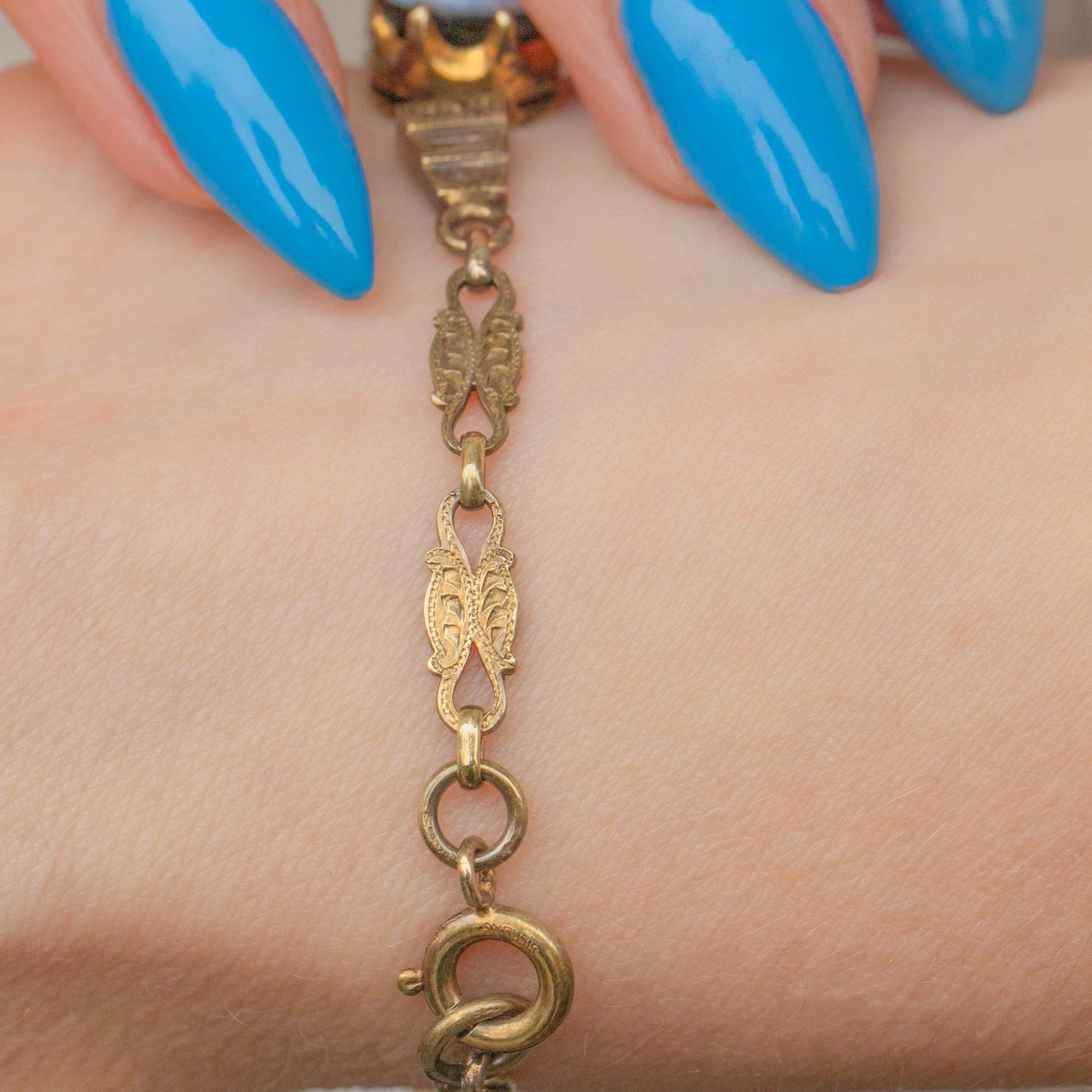 Crafted from Silver gilded with 9ct Gold, this antique bracelet is an ethereal delight. She features six galactic graduating Opal doublets, billowing in the light and radiating a stunning interplay of colours from soft lilacs through to vibrant flashes of greens and orange.