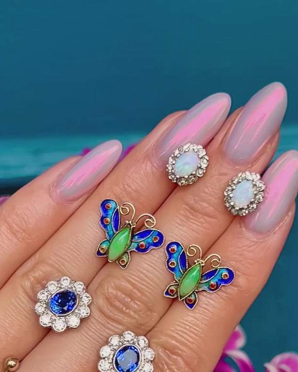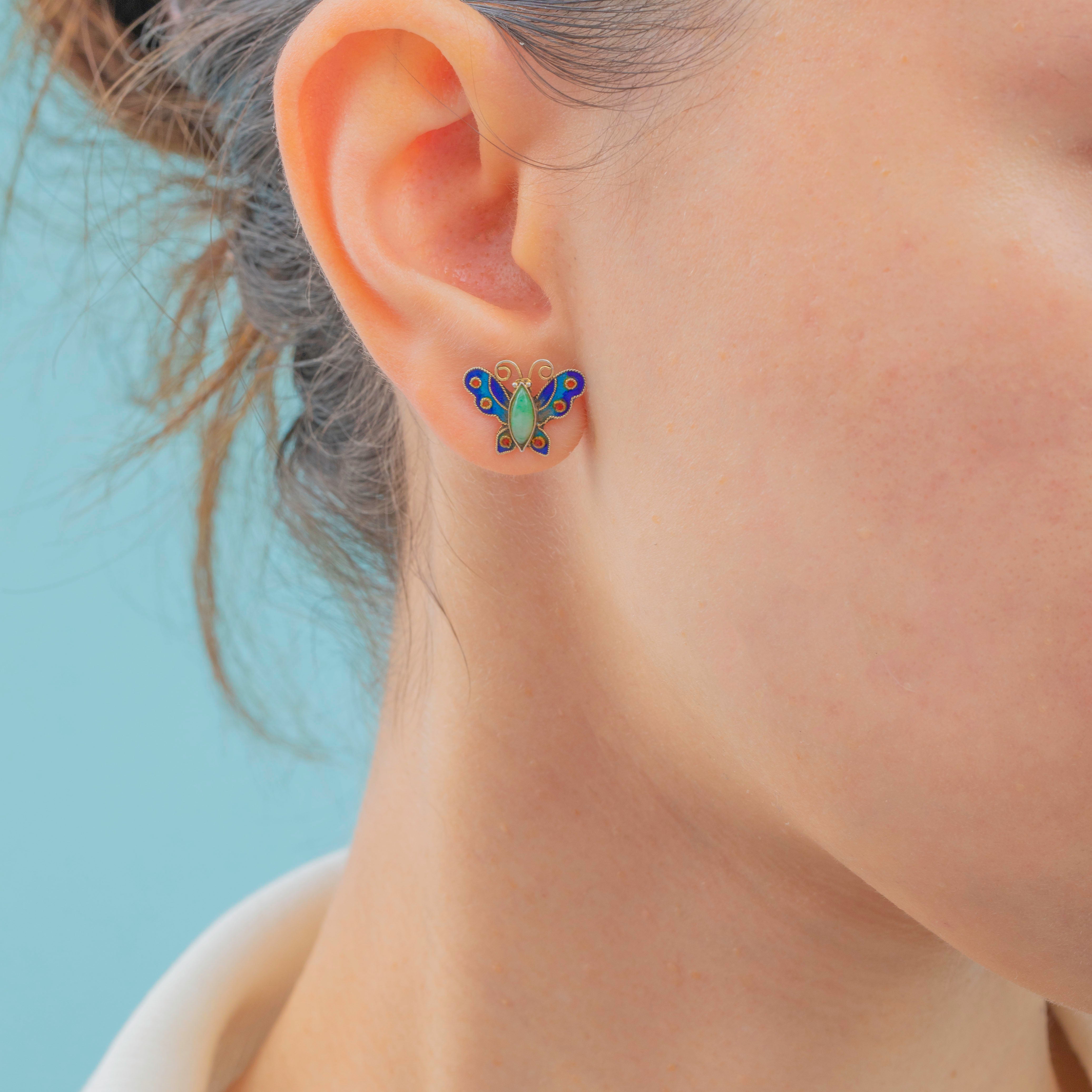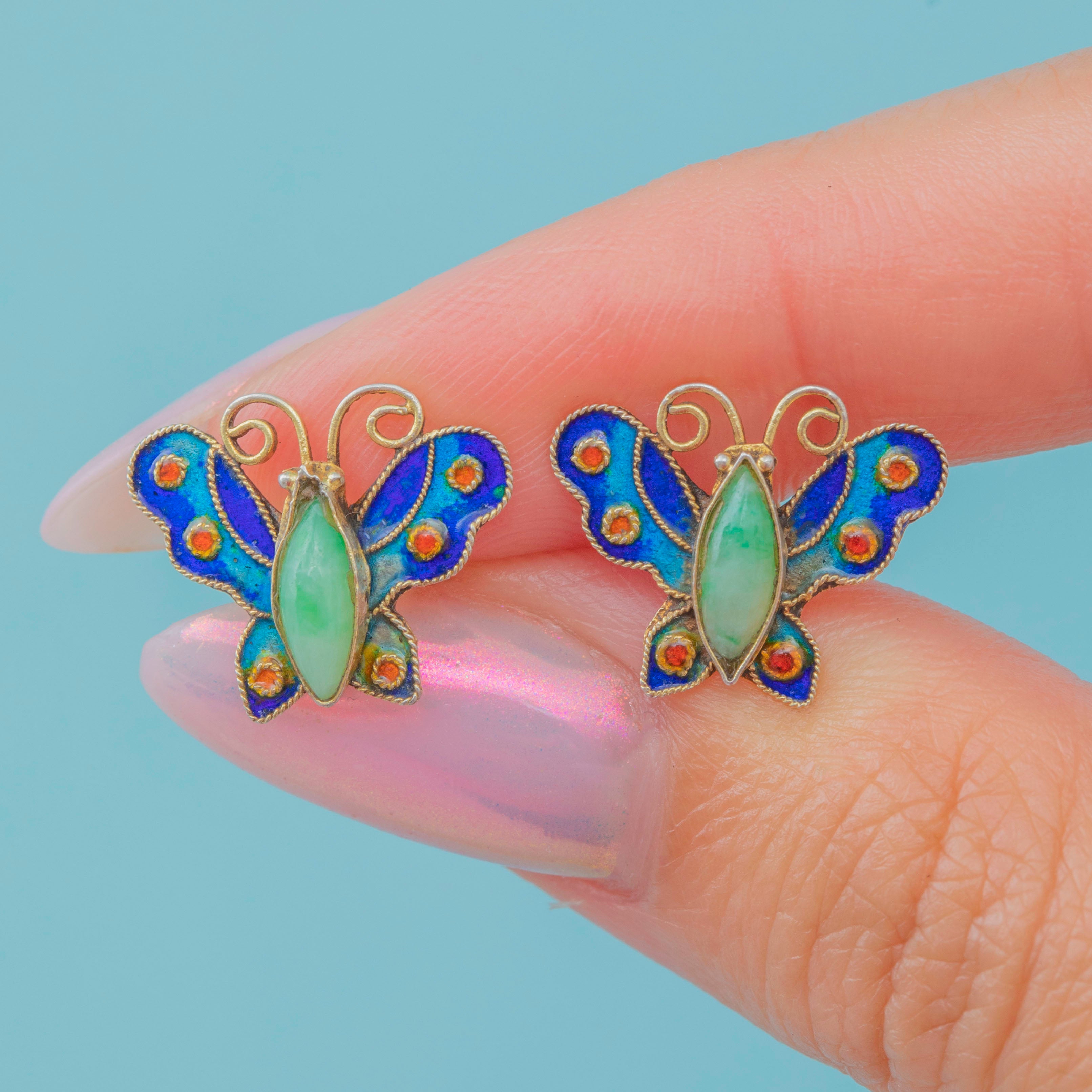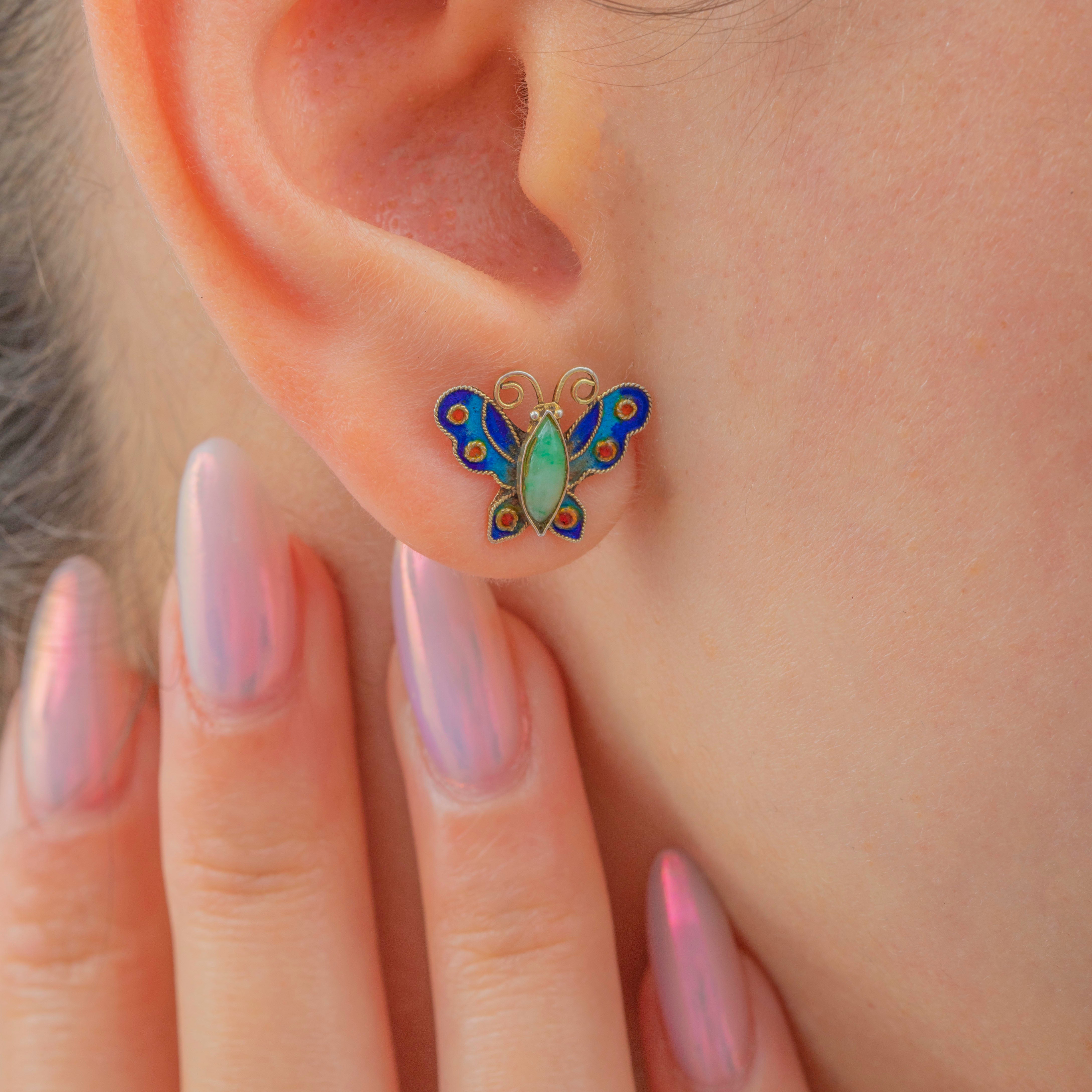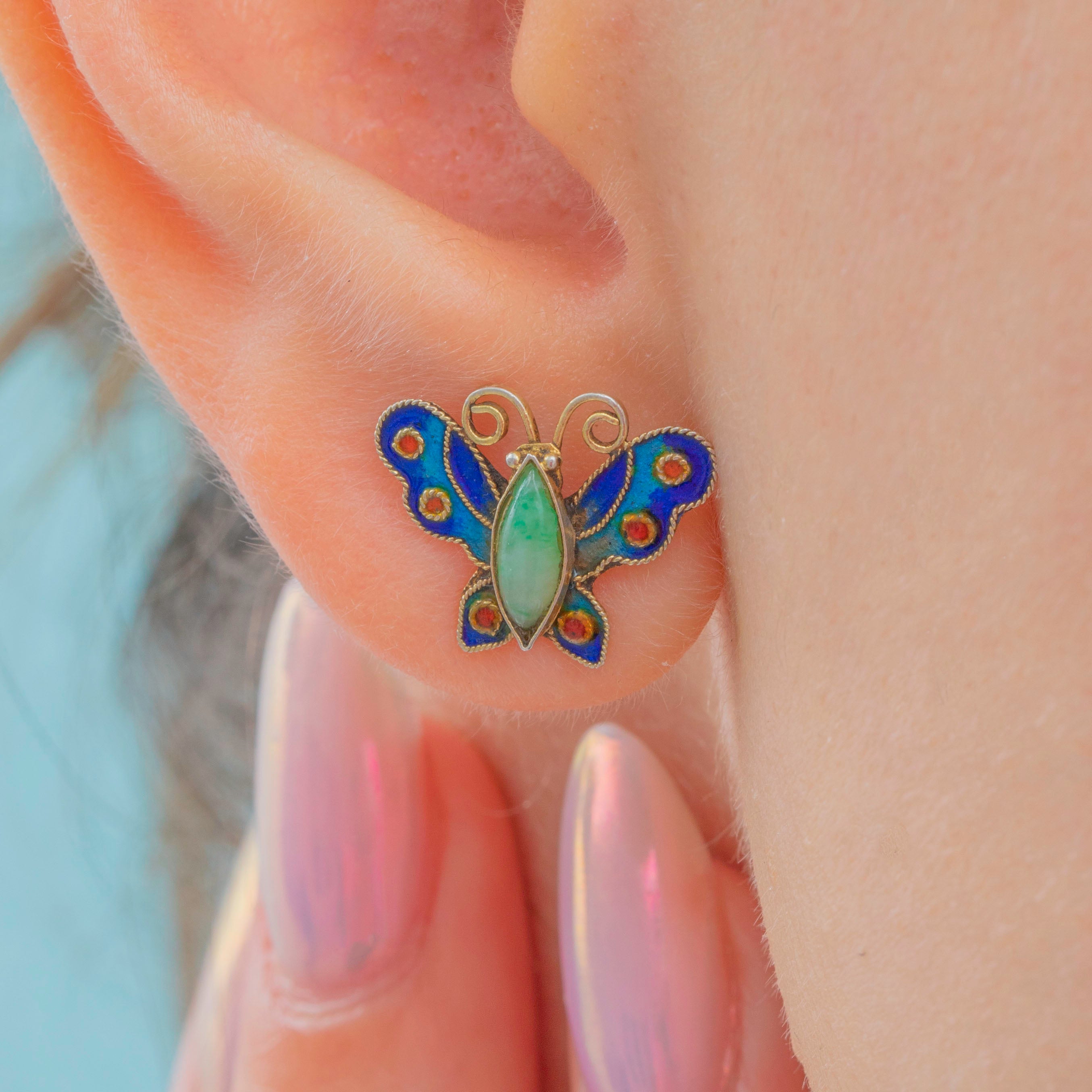 A charming pair of antique Silver butterfly studs, centred by a glossy Jade body and adorned by richly saturated Enamel wings!