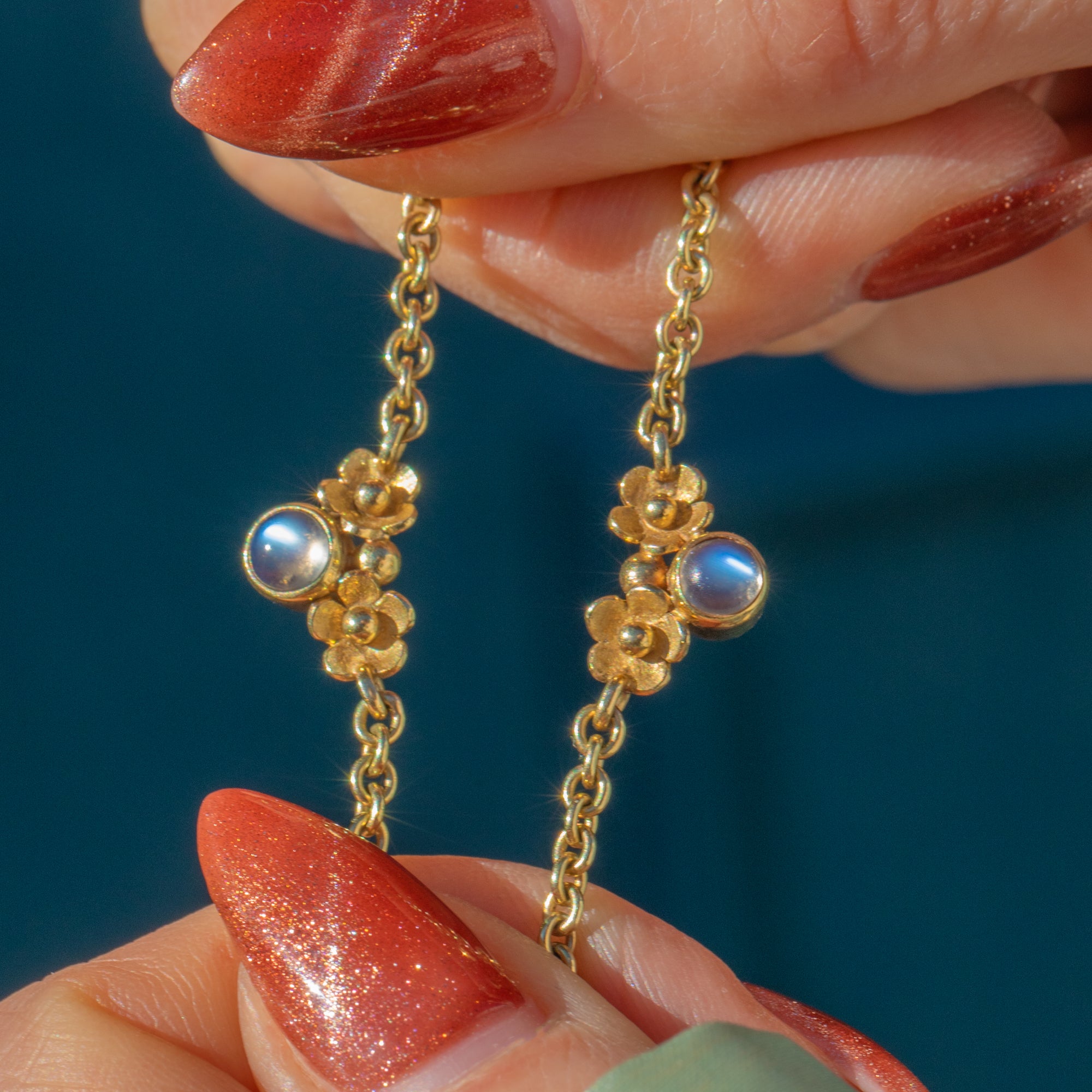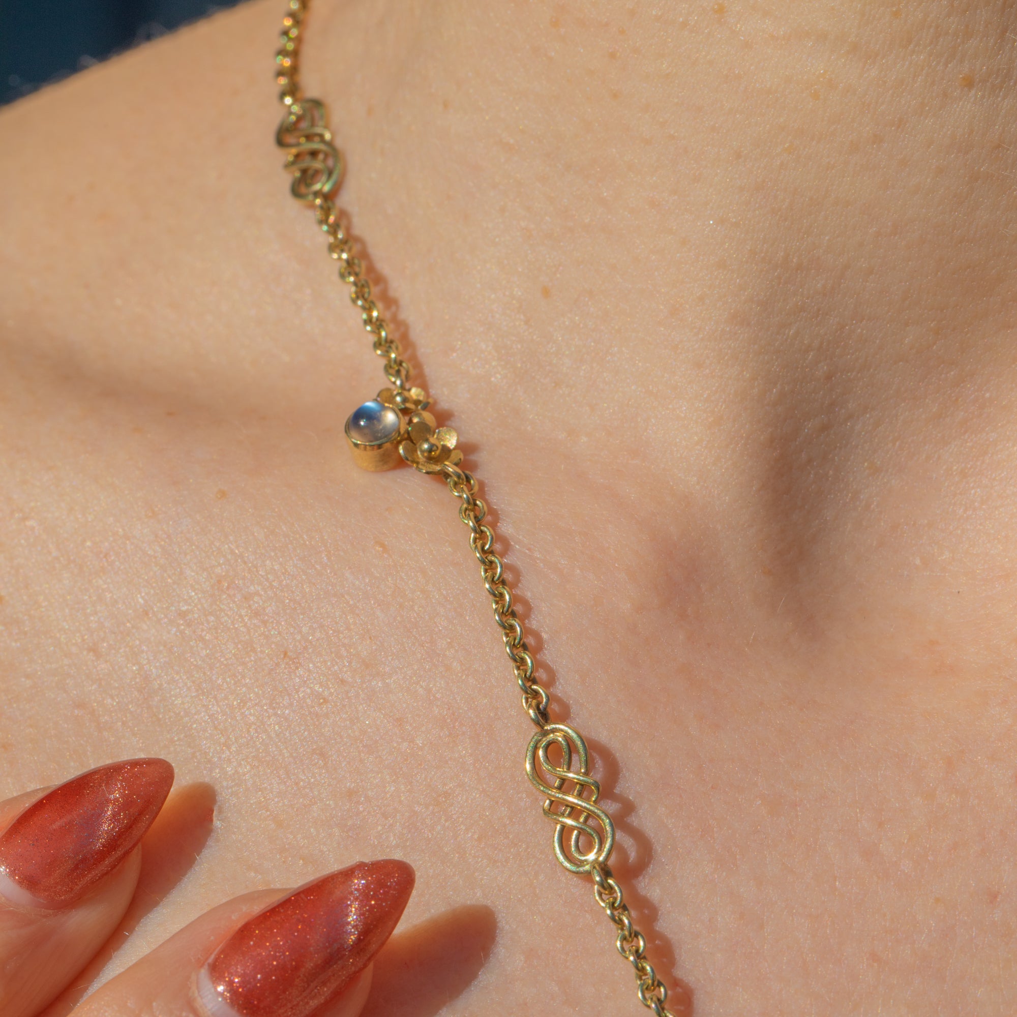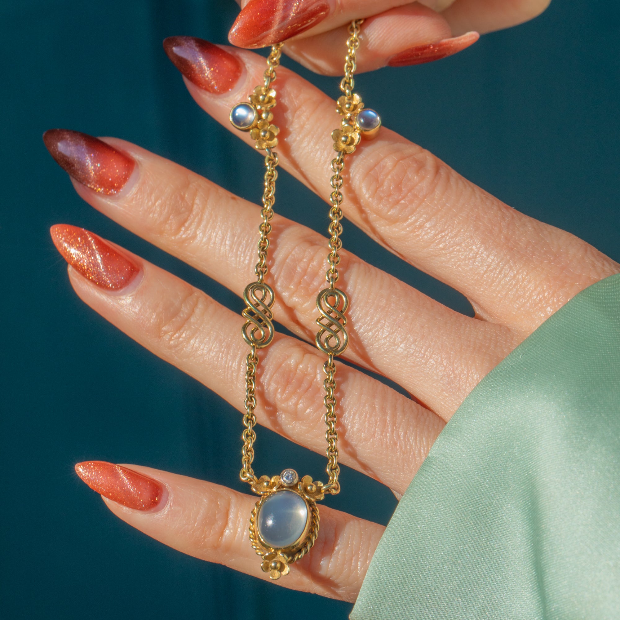 Crafted from 14ct yellow Gold, this Art Nouveau necklace has a lovely saturation throughout, perfectly complementing the ethereal adularescence of the Moonstones, which are decorated with dainty flower accents.