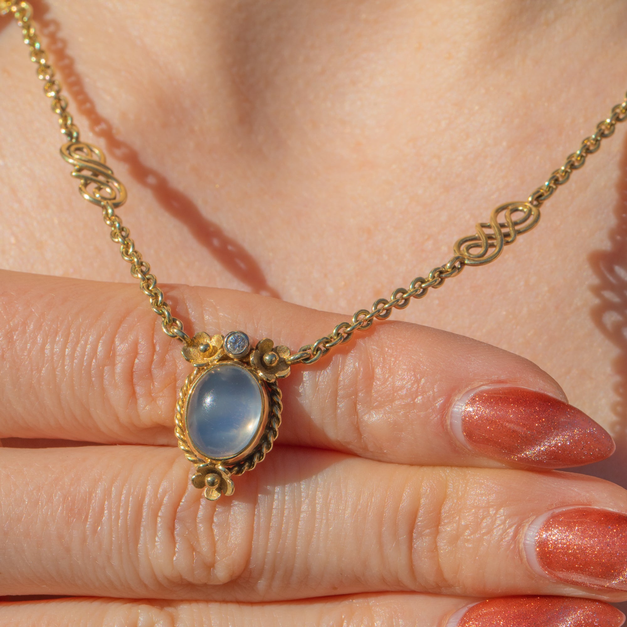 EXCELLENT. This Art Nouveau 14ct Gold Moonstone floral necklace is in excellent condition. The gemstones are radiant, secure within their bezel, and free from chips or scuffs. With her chain links uniform and securely connected, and her clasp in perfect working order, you can wear this Art Nouveau Moonstone necklace with the utmost confidence!