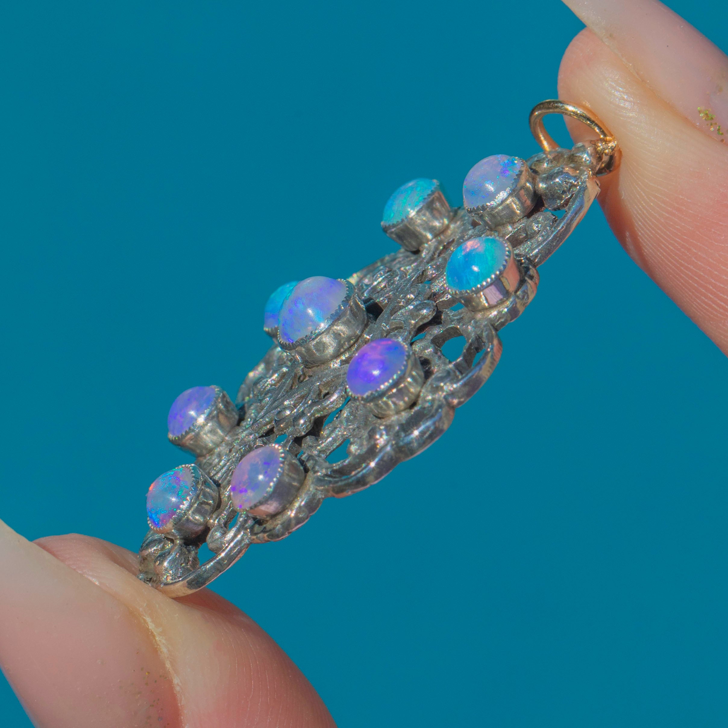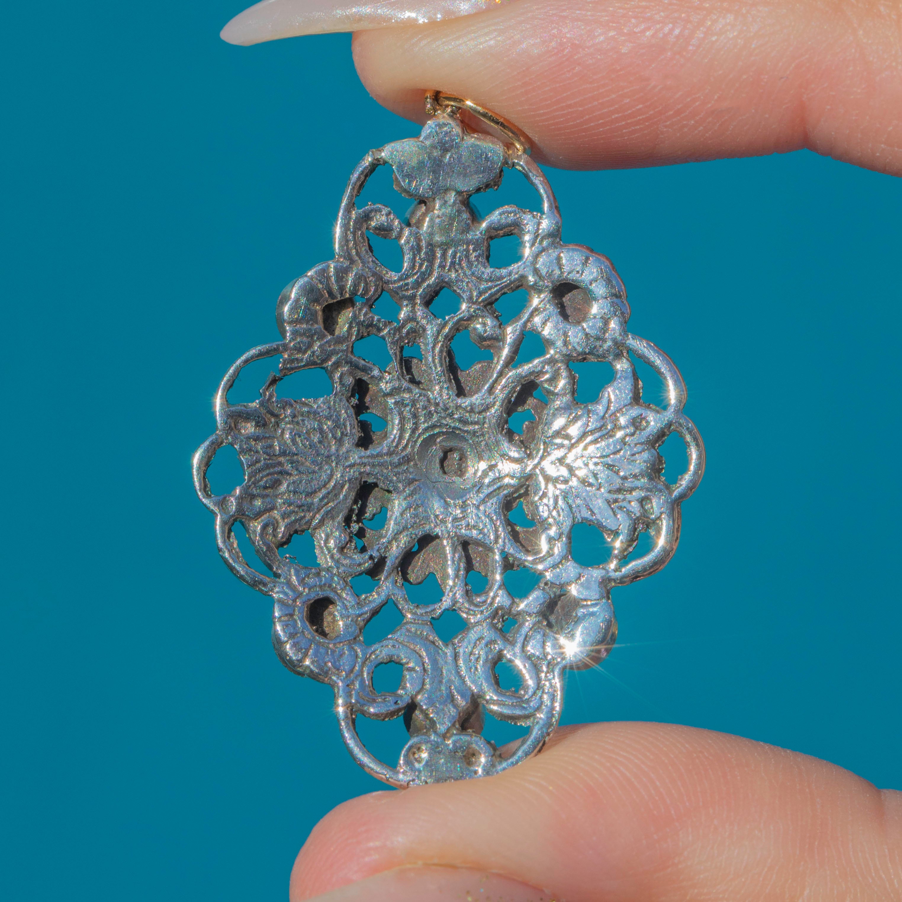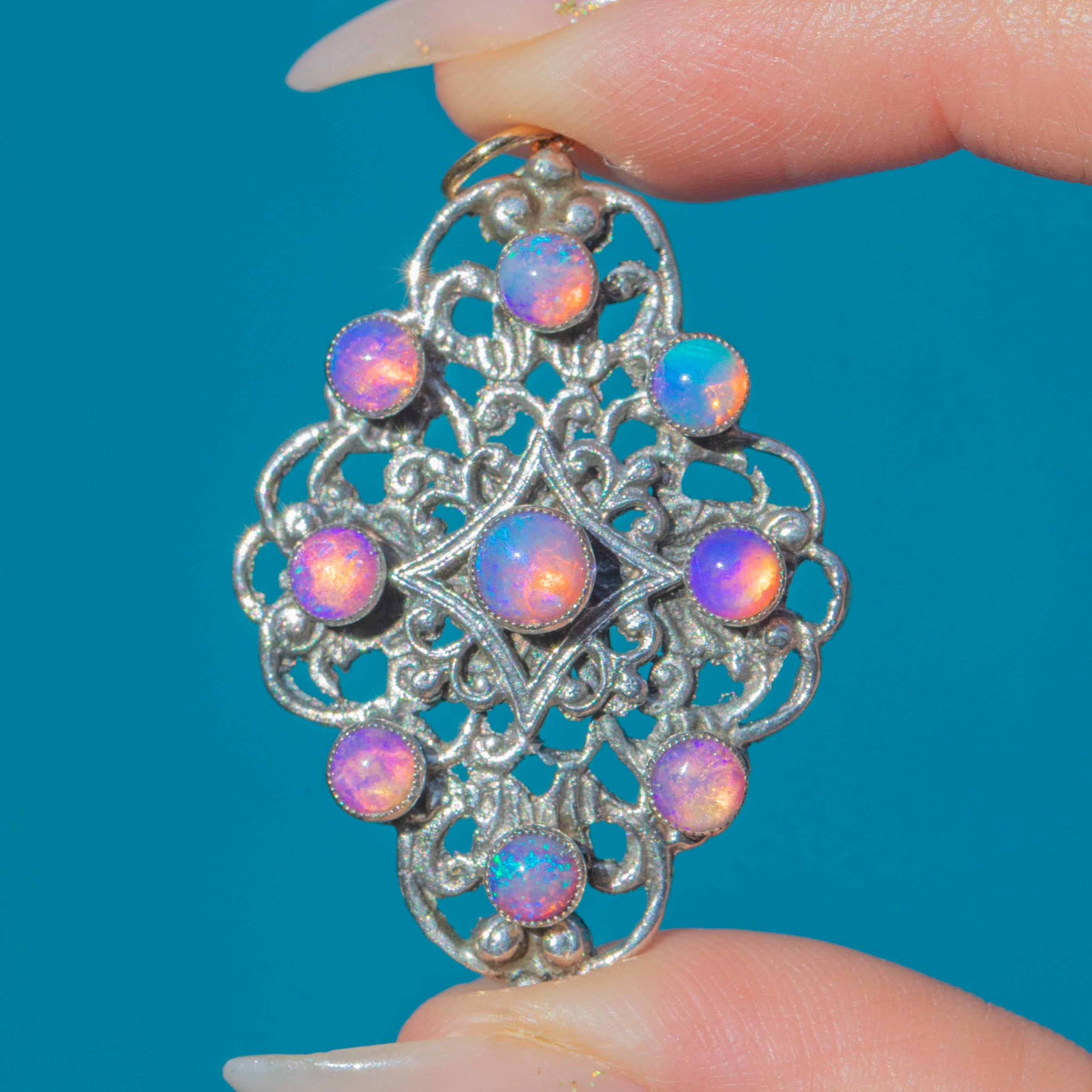 This charming Austro-Hungarian pendant is crafted in charming Silver filigree with a 9ct Gold jump ring, and set with glowing Pink "Dragon's Breath" Opaline glass! The stones display a delicate blush tone that shifts in the light, creating a soft and ethereal appearance. They are arranged in an ornate Silver frame, showcasing the decorative craftsmanship for which Austro-Hungarian jewels are celebrated.