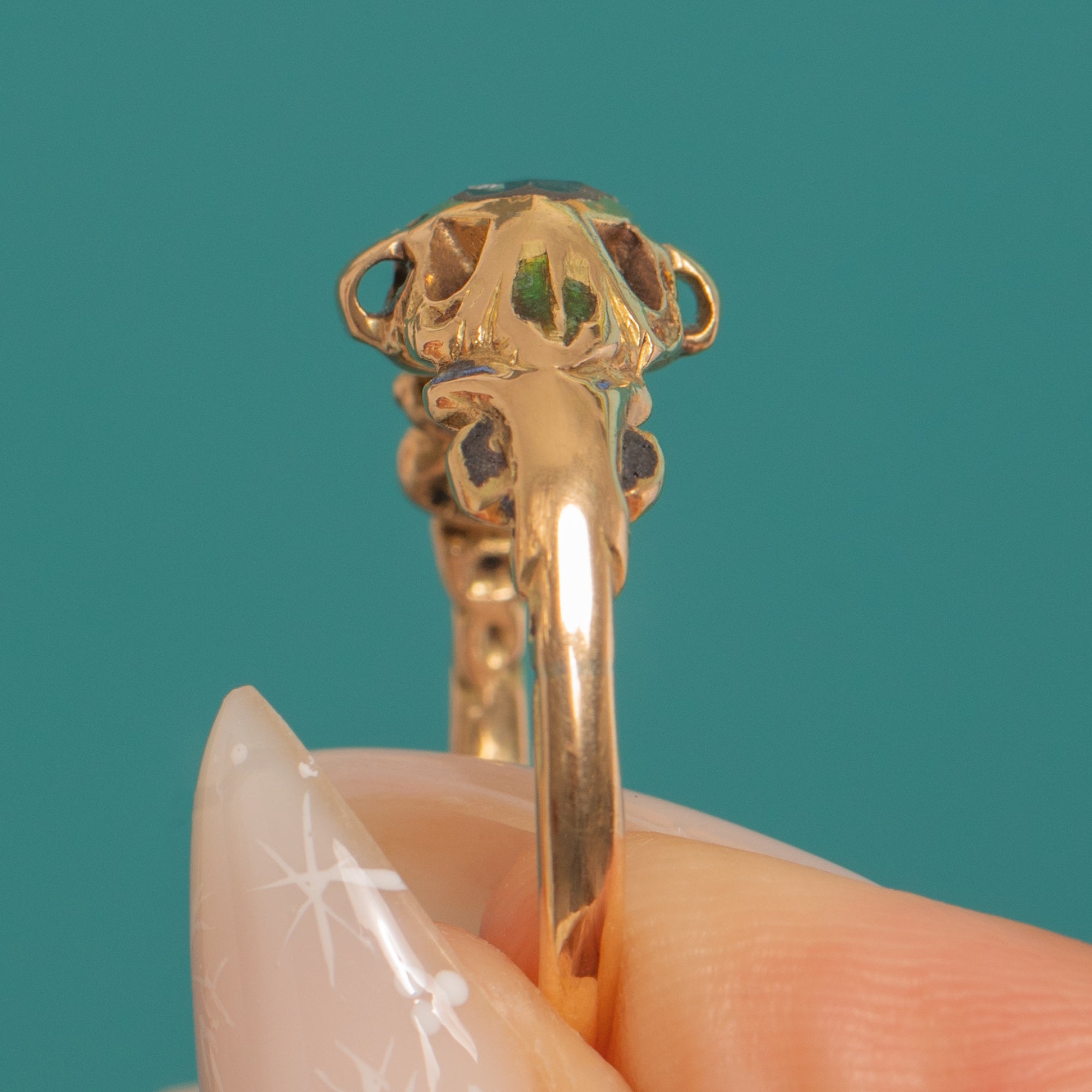 A rare jewel of the Baroque period, this c.1680 ring is crafted in rich 18ct Gold and set with a rose-cut Diamond. The gem sits proudly at the centre, its mirrored facets catching the light with that soft, candlelit glow only an old rose-cut can deliver.