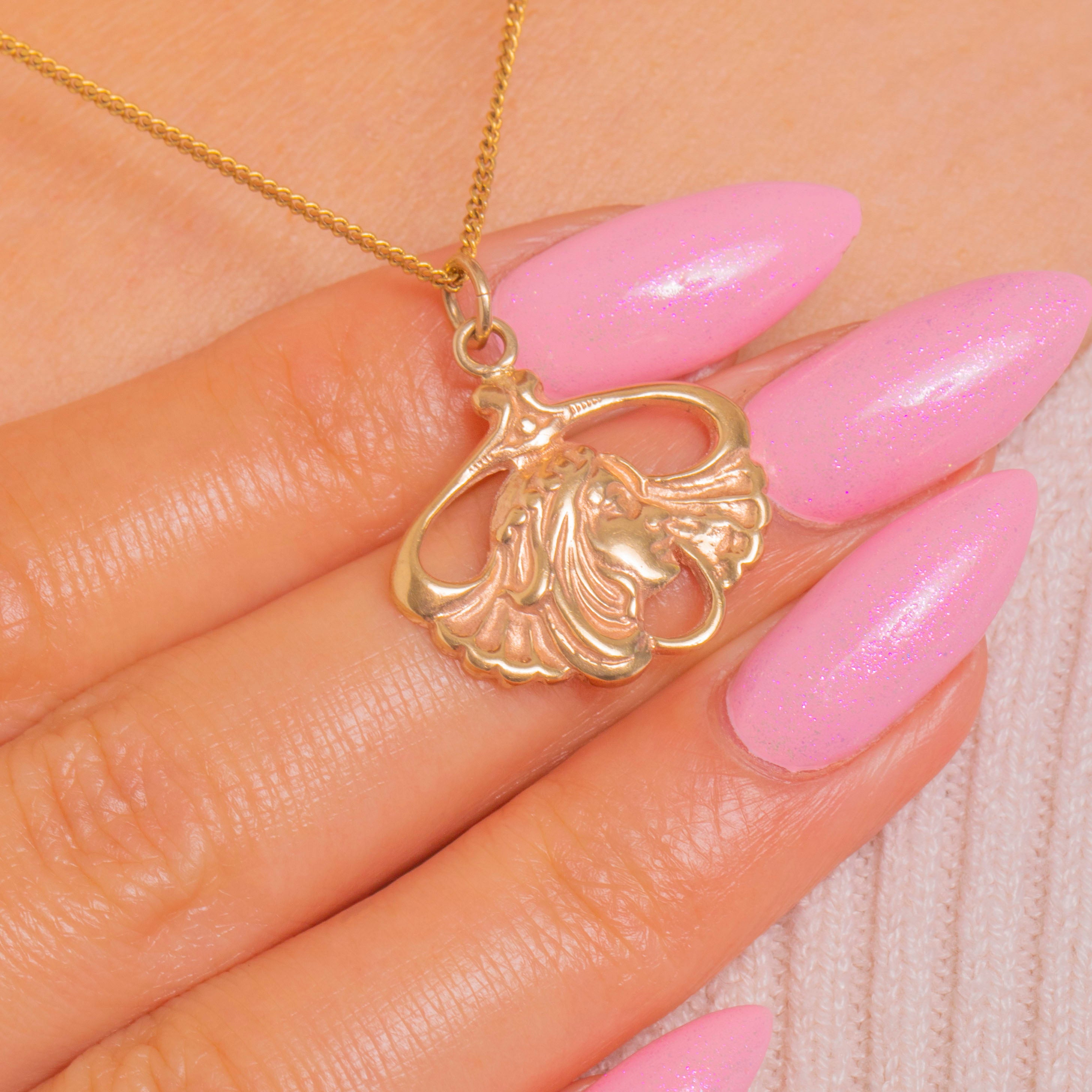 Englisch punziert in London für das Jahr 1977, verkörpert diese goldene Muse die romantische Wiederbelebung des Designs der Jahrhundertwende. Elegant und vielseitig tragbar – ein zeitloser Anhänger oder Charm, der sich wunderbar an Ihrer Lieblingskette tragen lässt.